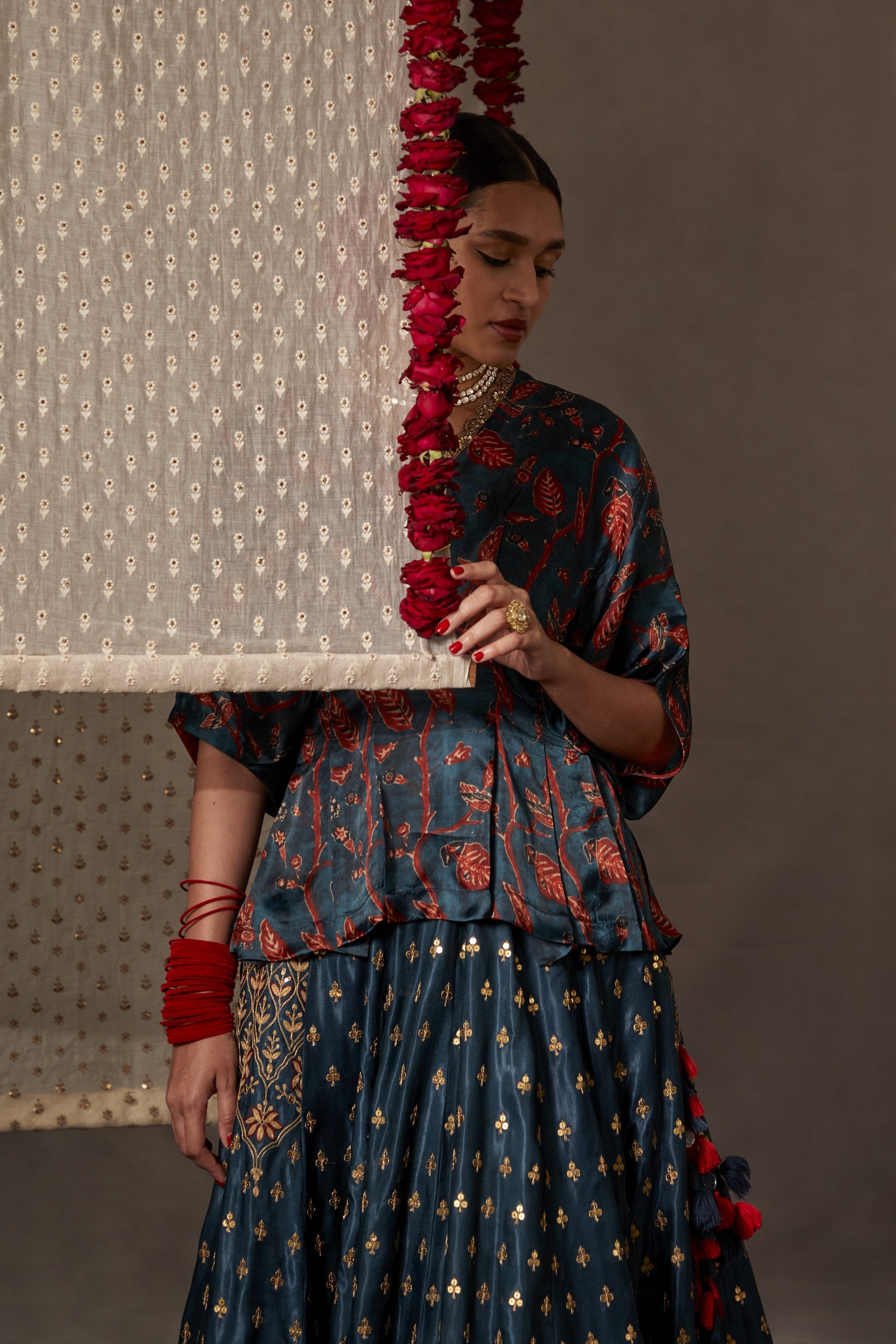 Teal lehenga with attached can-can, all over floral vintage pattern, contrast zari, bead & sequin embroidery. Paired with dolman sleeve peplum kurta with all over contrast floral print.