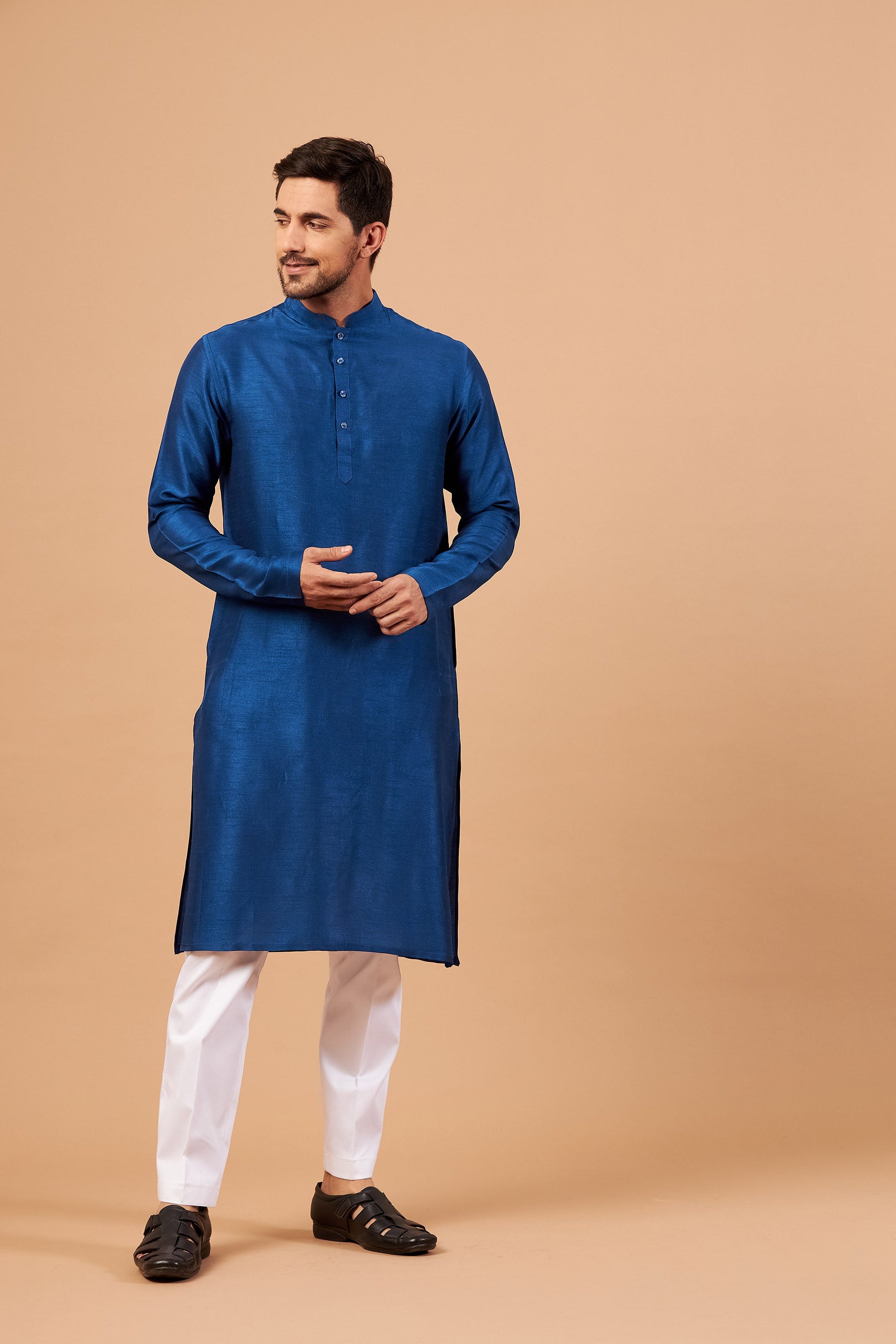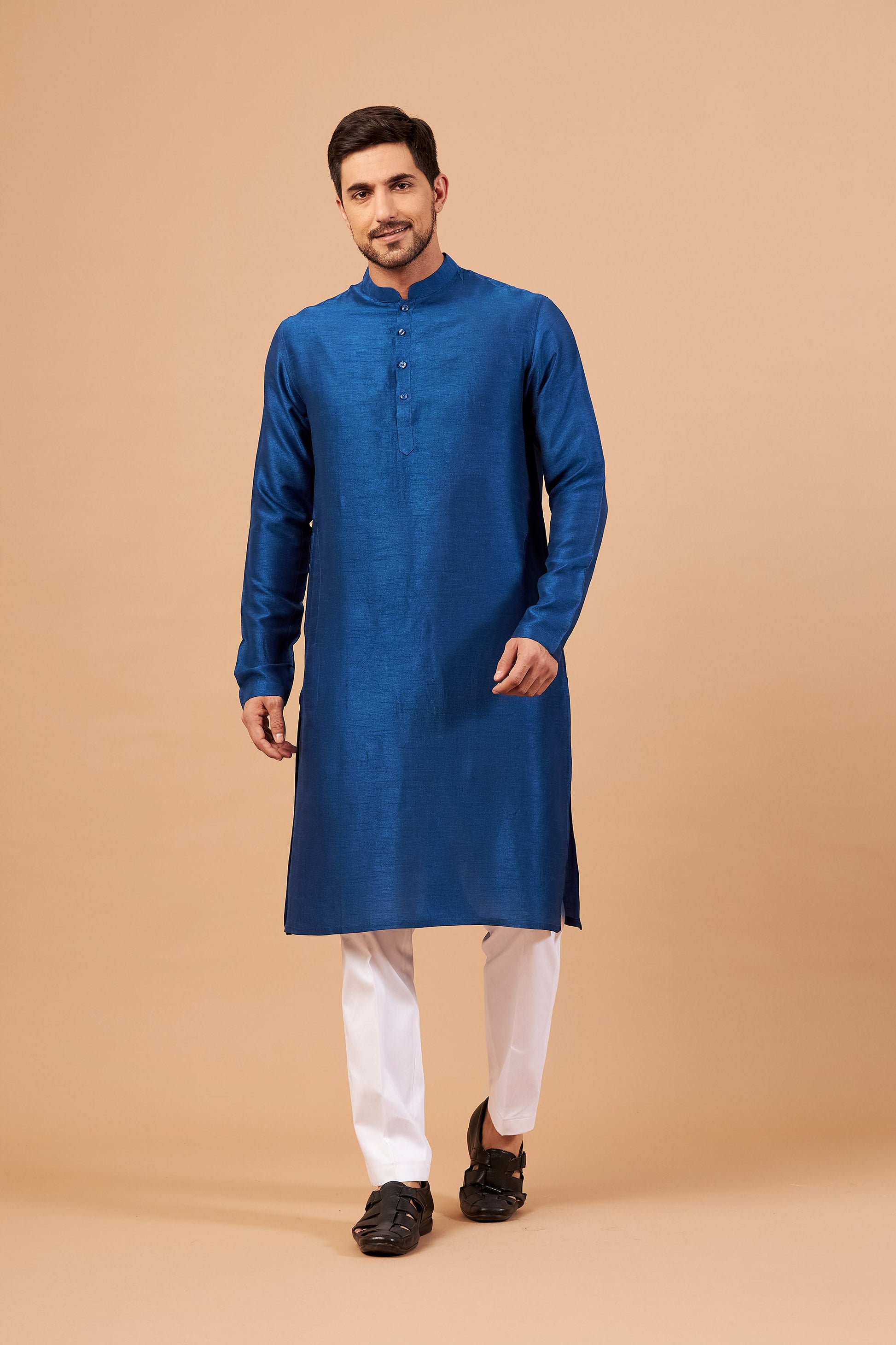 This blue kurta is made of falling raw silk, giving it a luxurious and soft feel. The lightweight fabric is perfect for warmer weather and the blue color adds a touch of whimsy to any outfit. The kurta features a traditional silhouette with a collar and full-length sleeves, making it perfect for formal occasions or casual wear. The raw silk material is durable and easy to care for, ensuring that this kurta will be a staple in your wardrobe for years to come. Whether dressed up with formal trousers or paired with jeans for a more casual look, this kurta is sure to impress.