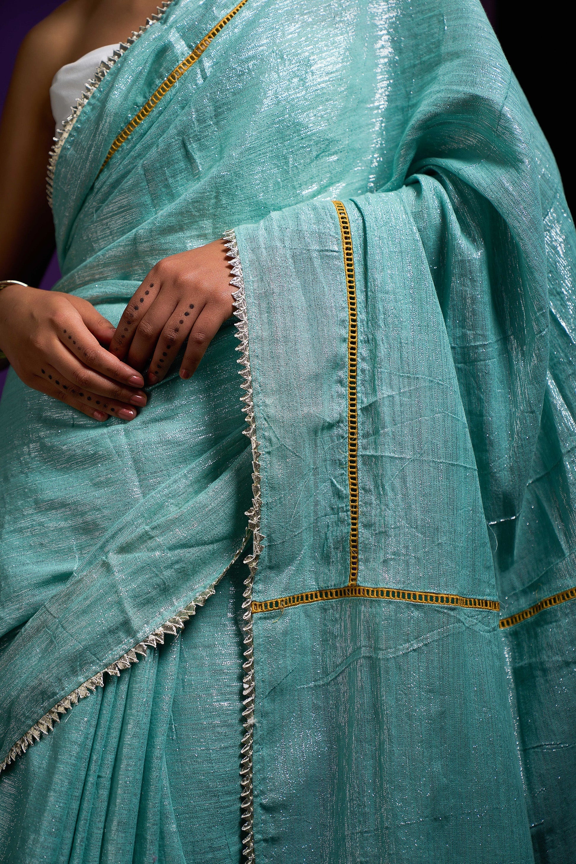 This saree is in shimmer cotton fabric. Saree has yellow lace insertions and silver gotta border.