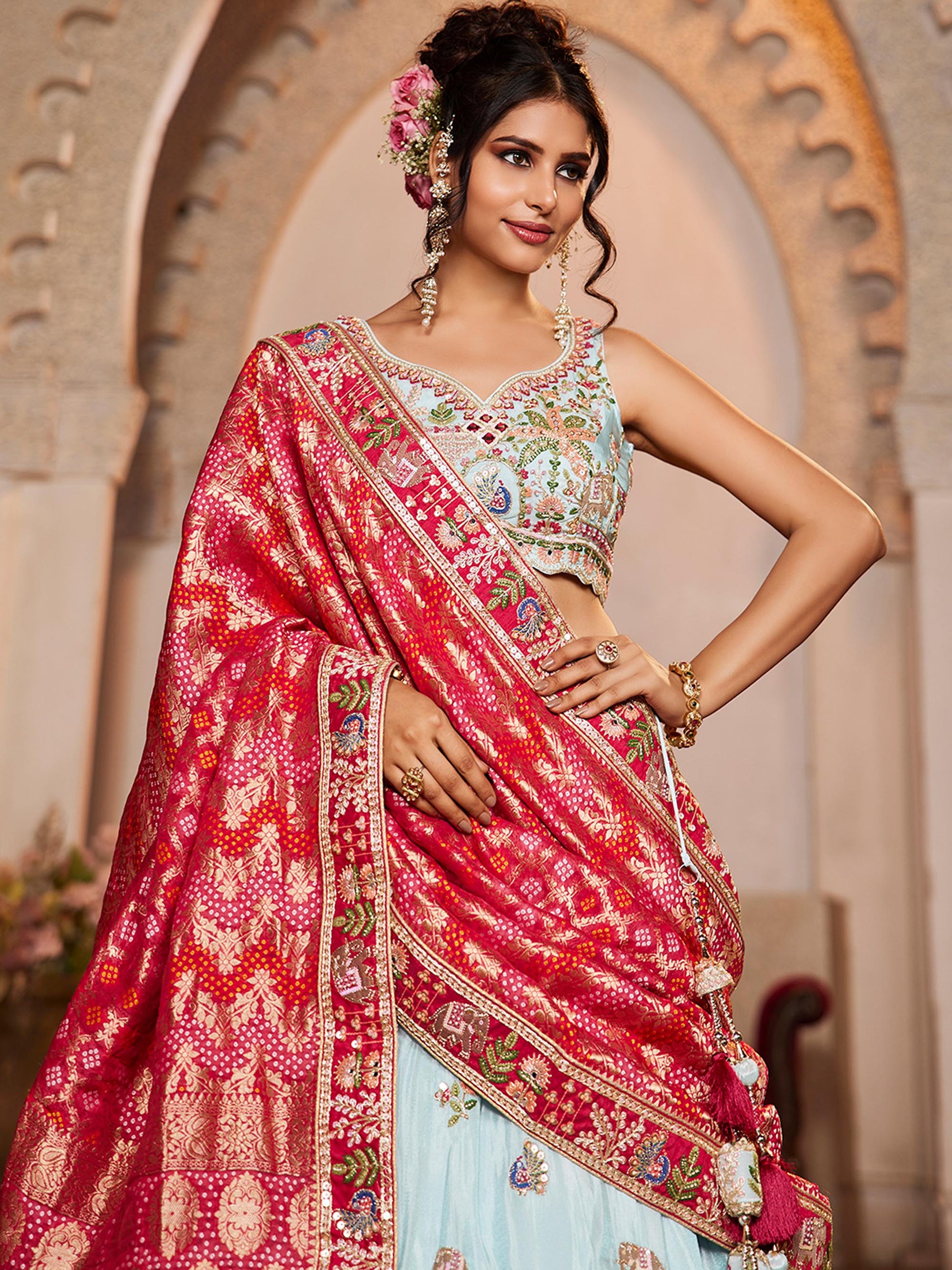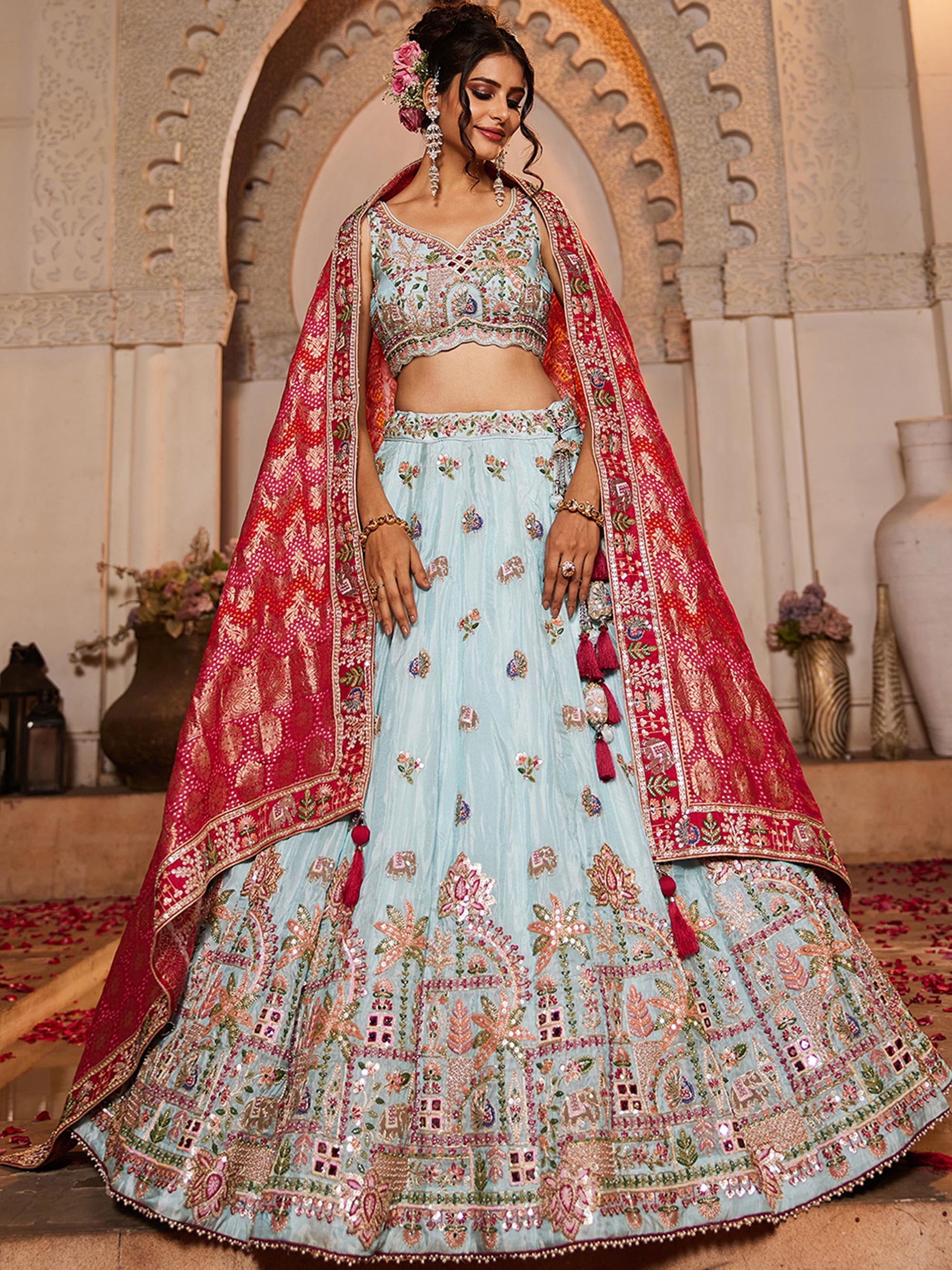 • Lehenga:- Made of premium quality Blue Colour Tissue fabric Full Flaire Lehenga With Mirror, Moti, Sequinse and Coding work has a thread Embroidery work. Has a Moti work border on the hemline.