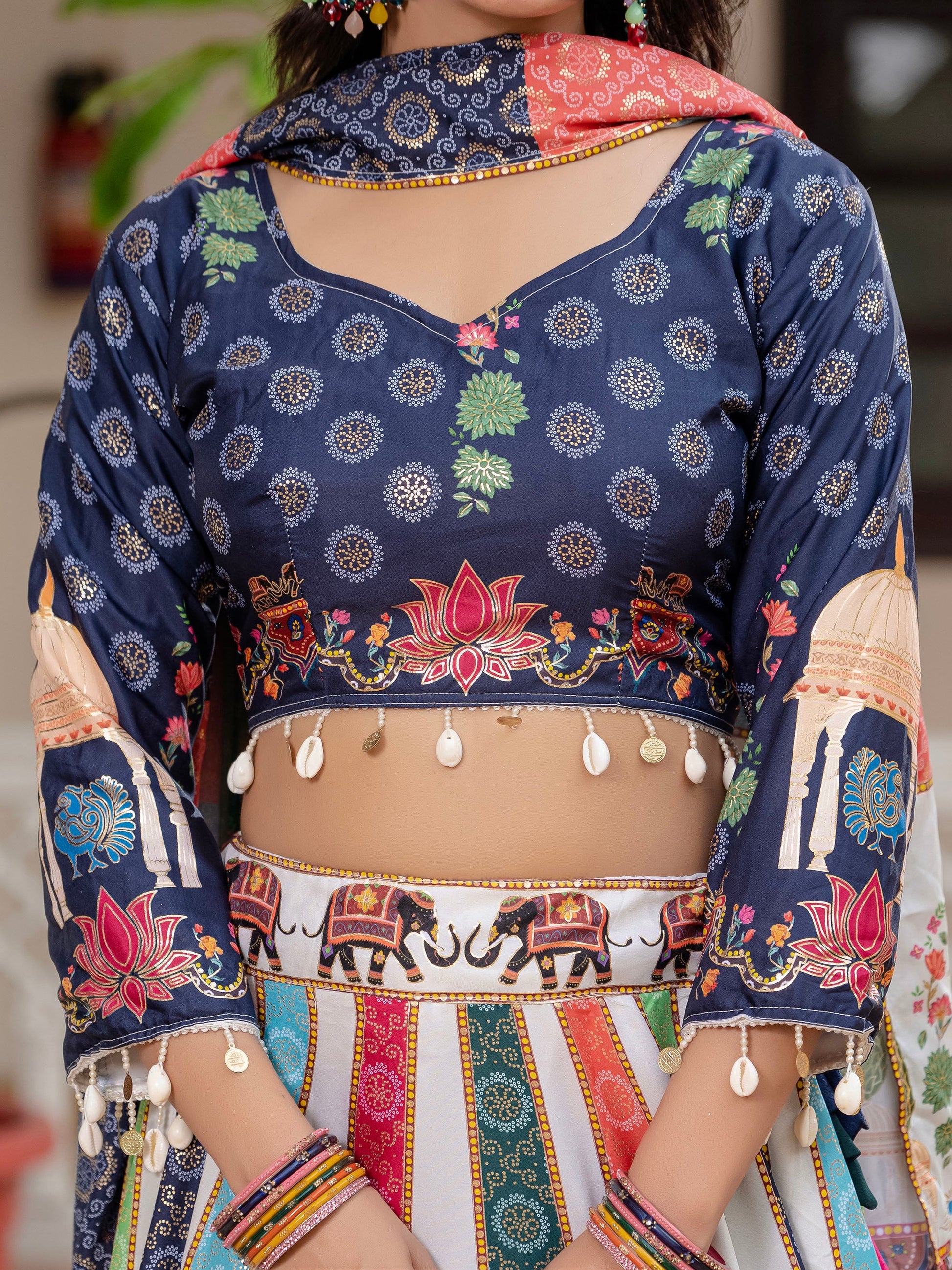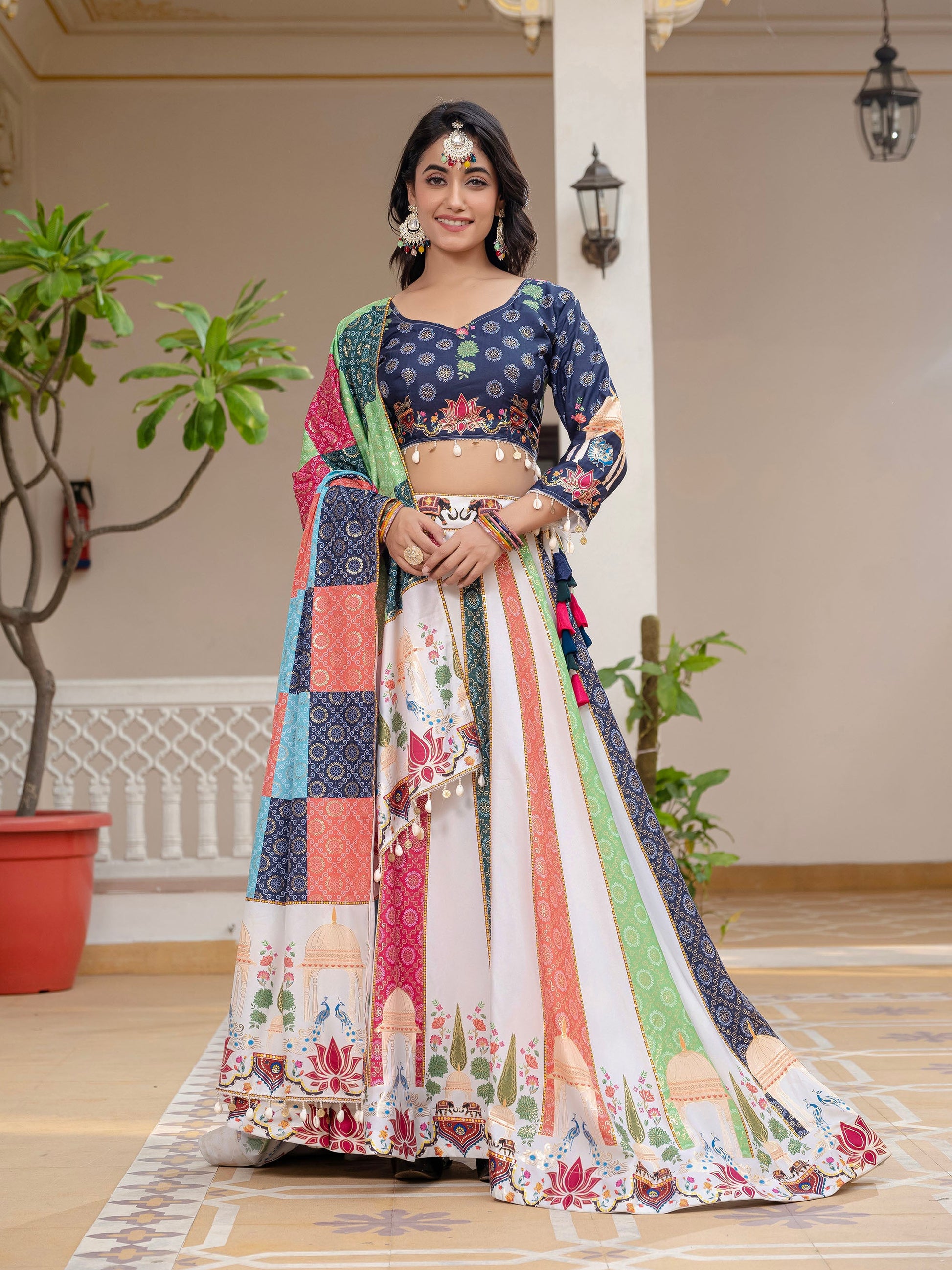 Blue & White Crepe Silk Foil Printed Navratri Chaniya Choli