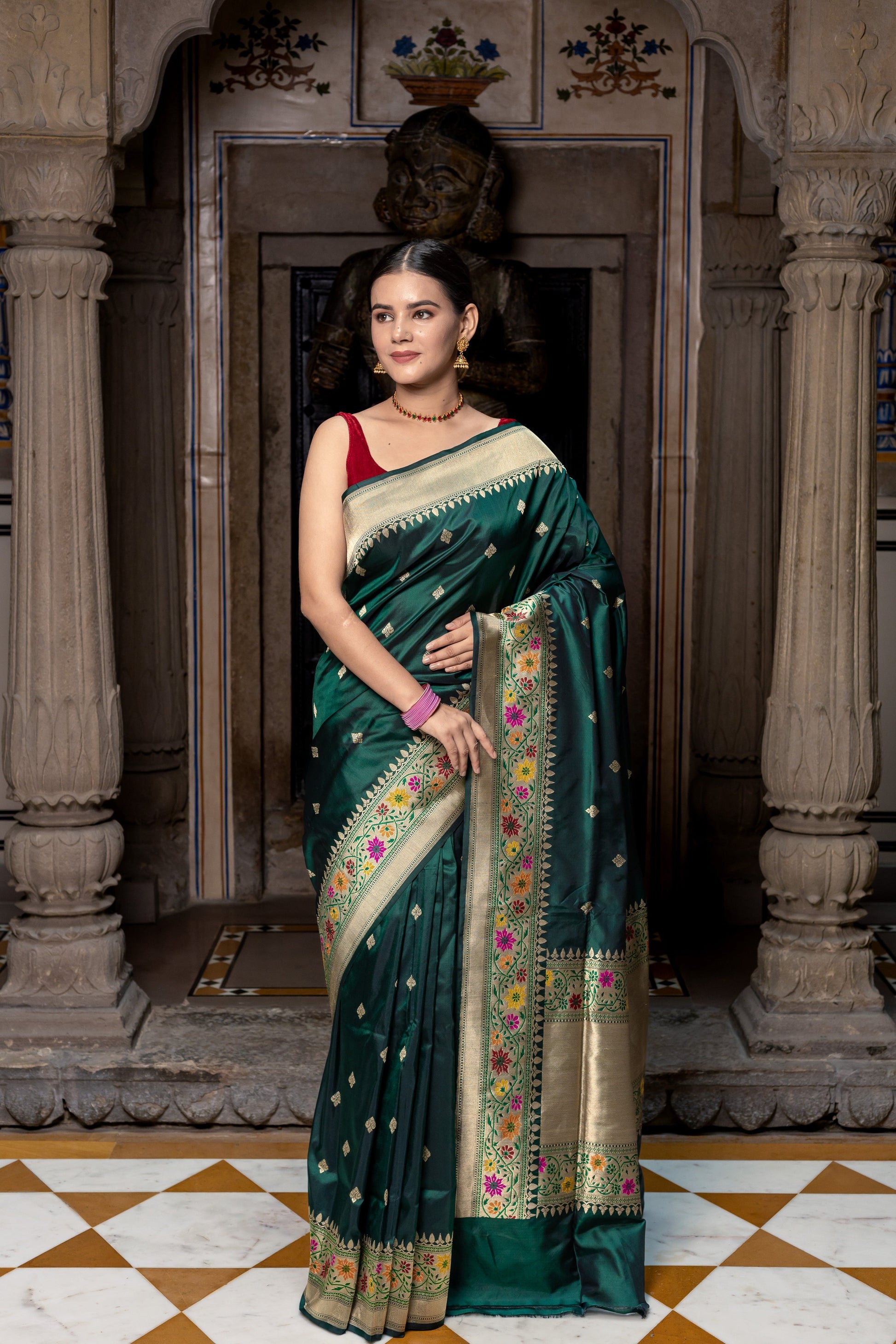 Bottle Green Handwoven Kadwa Katan Silk Saree