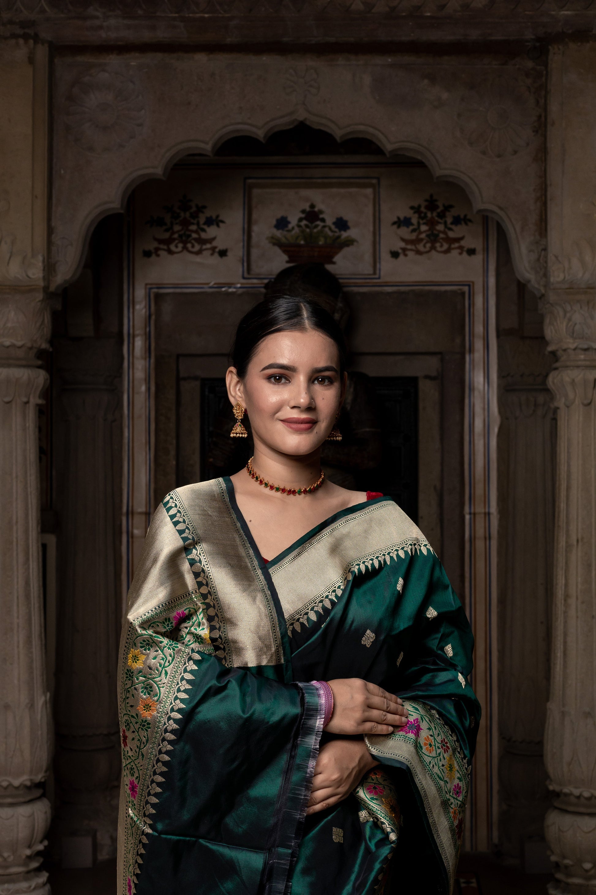 Product Description: The Bottle Green Handwoven Kadwa Katan Silk Saree is an embodiment of the classic traditions of Banaras. It features intricate booti in gold zari, accentuated by a vibrant multi-color Paithani border and aachal. This saree is a testament to the timeless artistry of Banarasi weaving, symbolizing the grace of sustainable fashion.