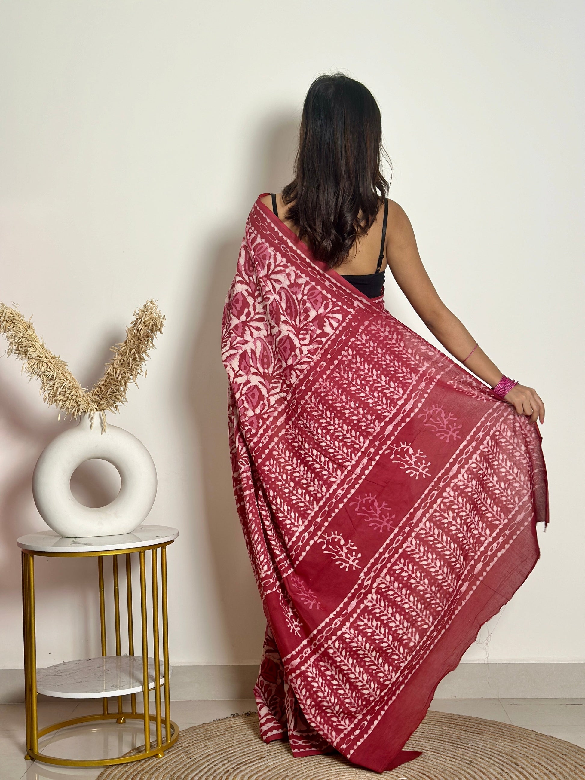 Bougainvillea - Red Cotton Mulmul - Handblock Dabu Saree