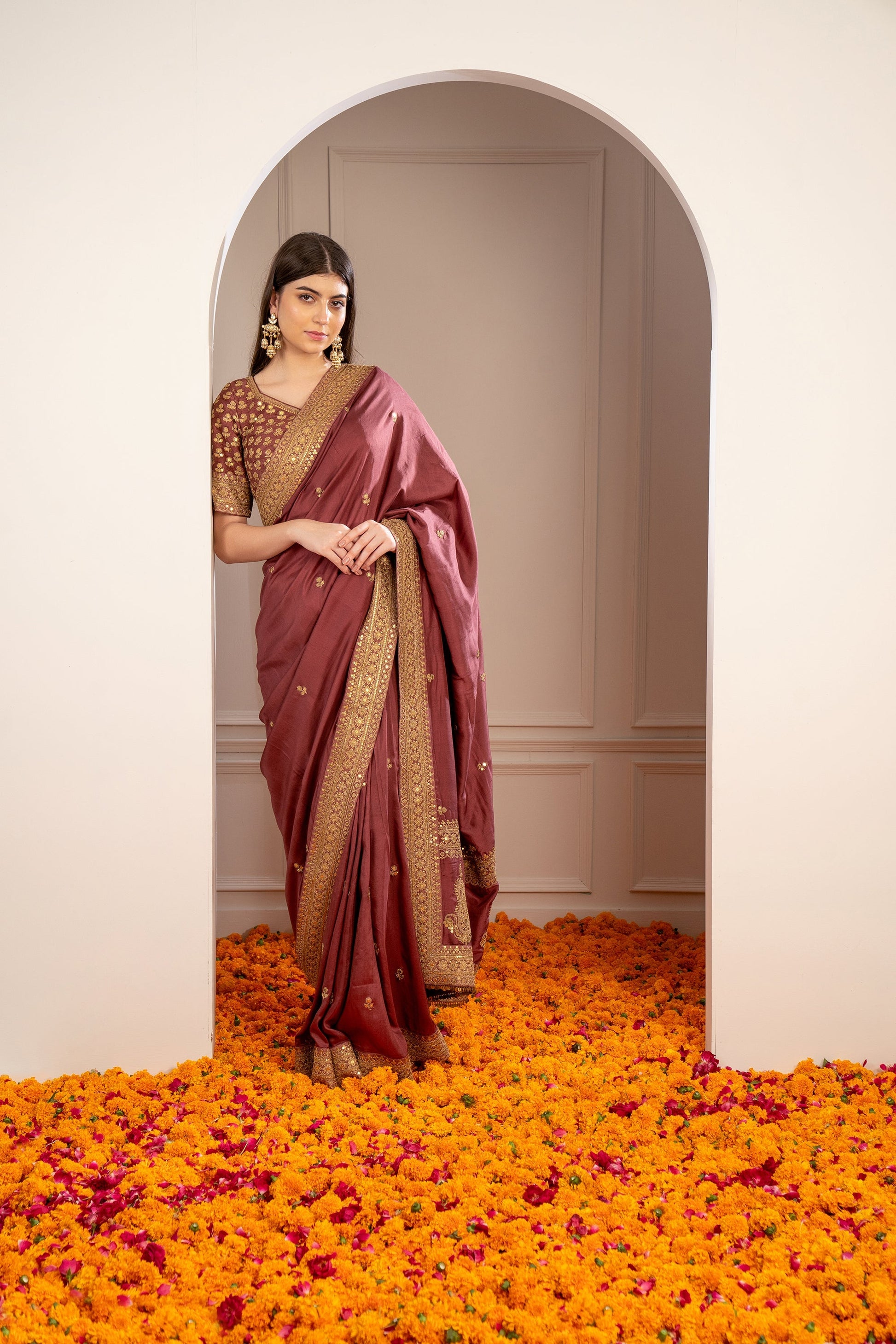 Brick red soft silk saree with pita work and sequins. 2) Paired with matching padded blouse.