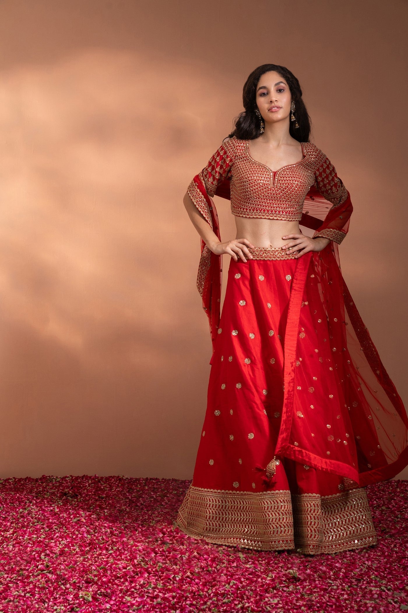 Bright Red Lehenga set in Silk with Heavy Gota & Embriodery Work.