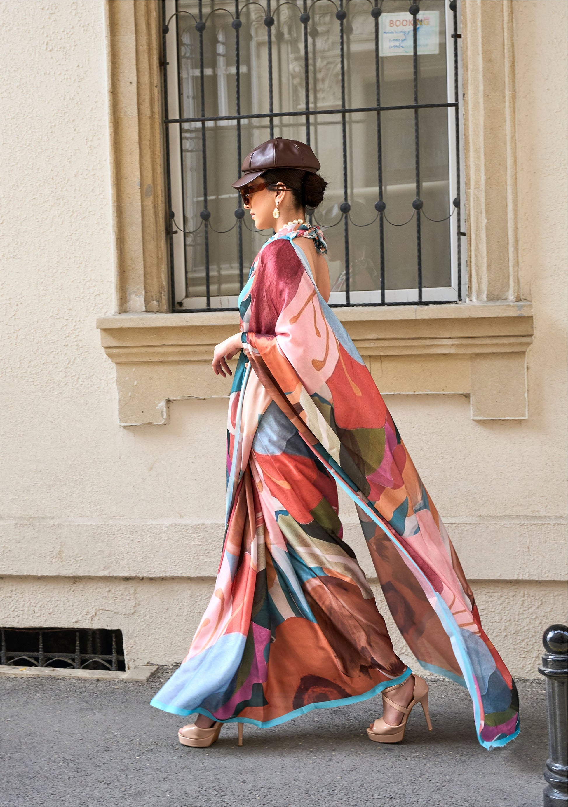 Brown Multi color Abstract Kolombus Satin Georgette Printed Saree