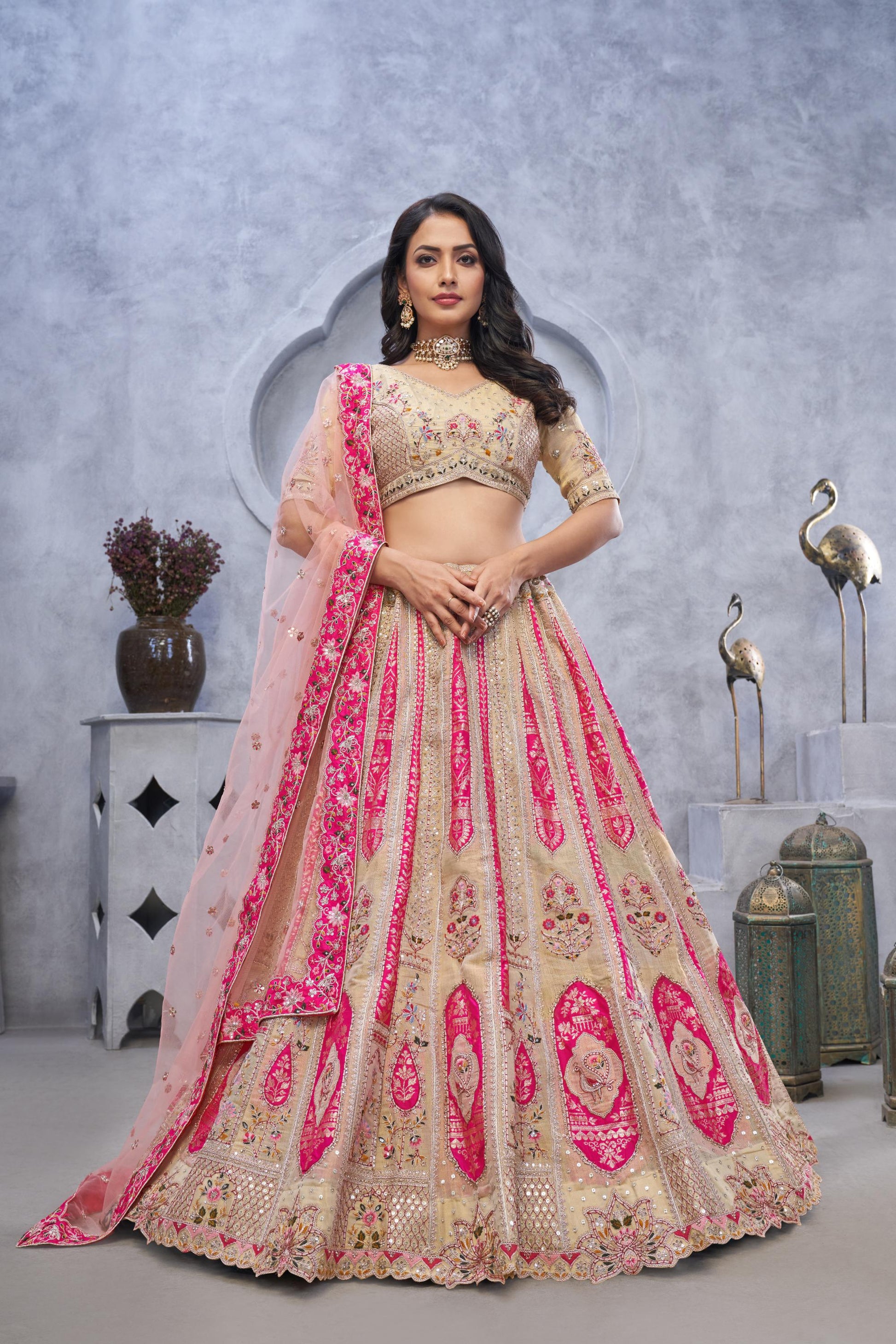 An elegant choice for Haldi , this dark cream and pink Paisley Patterned Lehenga is adorned with sequin and stone work. Featuring a sweetheart neck blouse with sequin and thread work, it perfectly matches the skirt adorned The ensemble is completed by a matching Light pink net dupatta with a sequin work border. Style with statement earrings and stilettos.