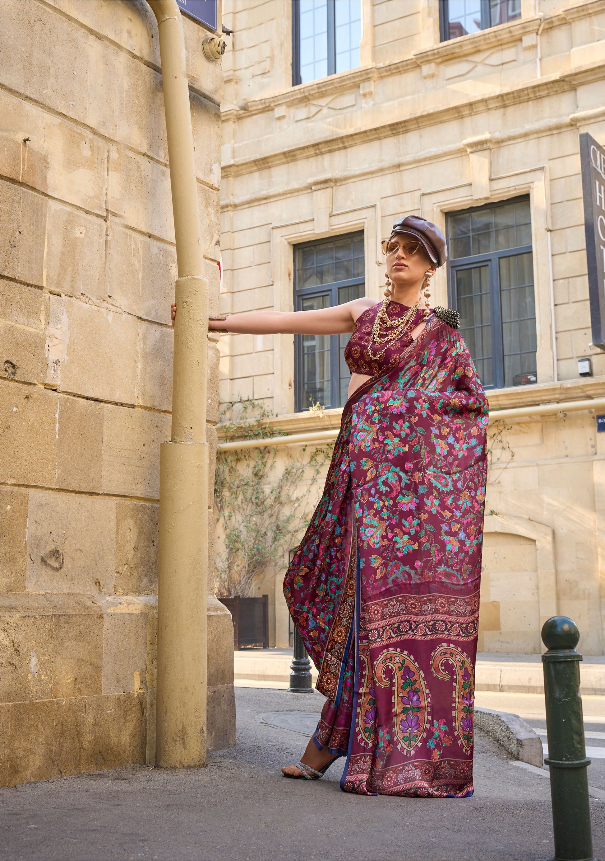 Burgundy Floral Kolombus Satin Georgette Printed Saree