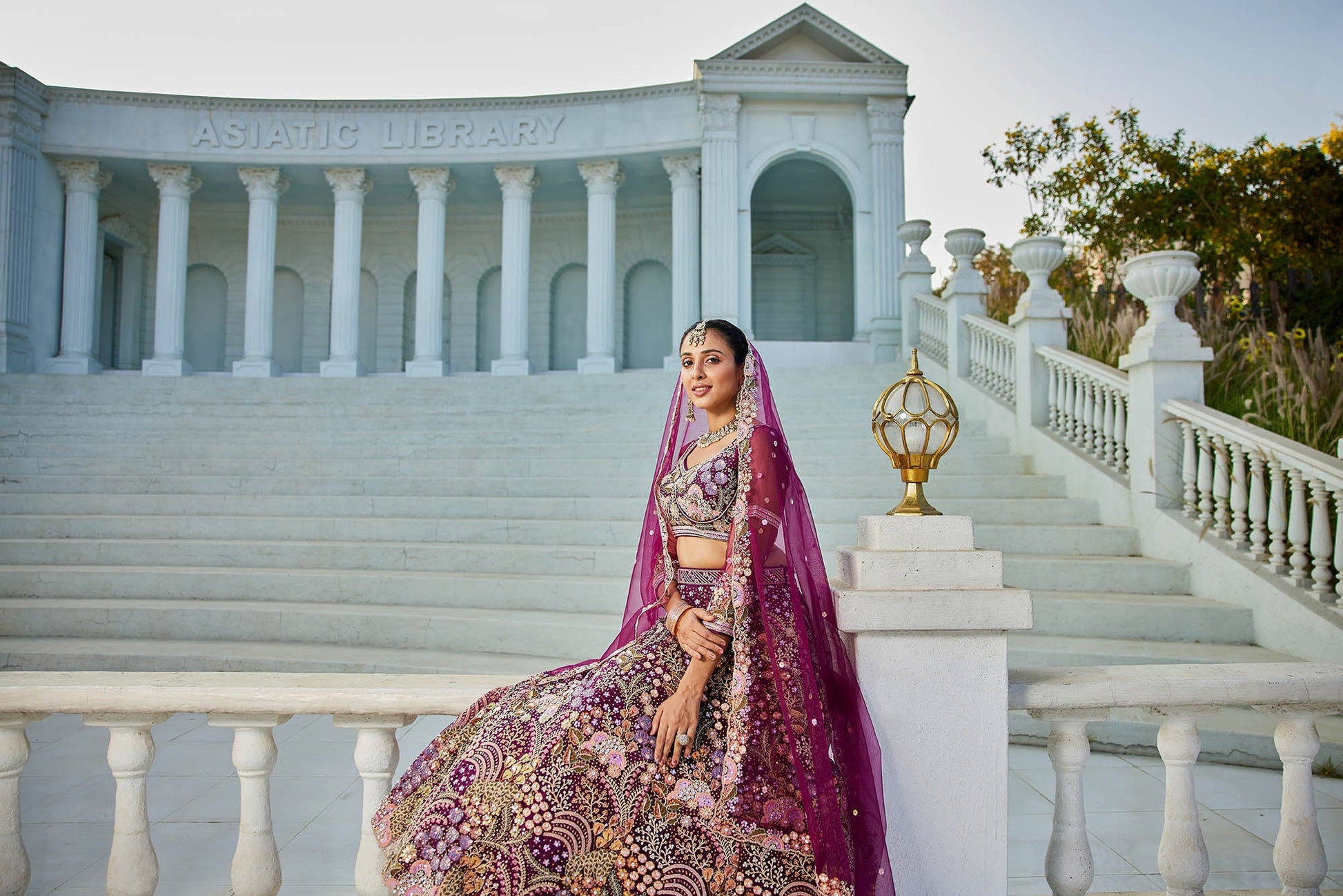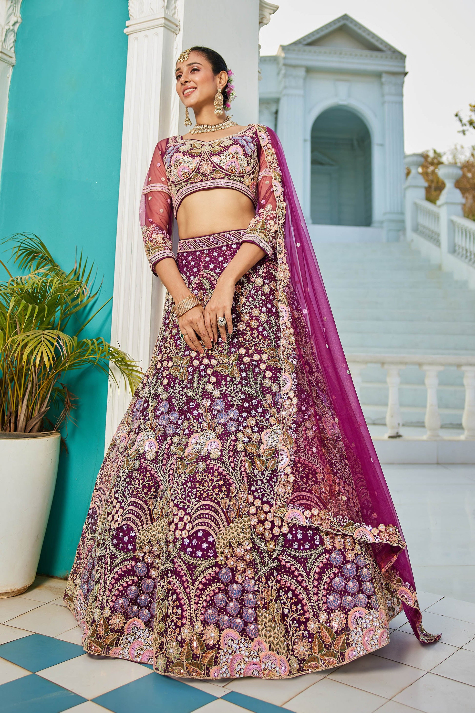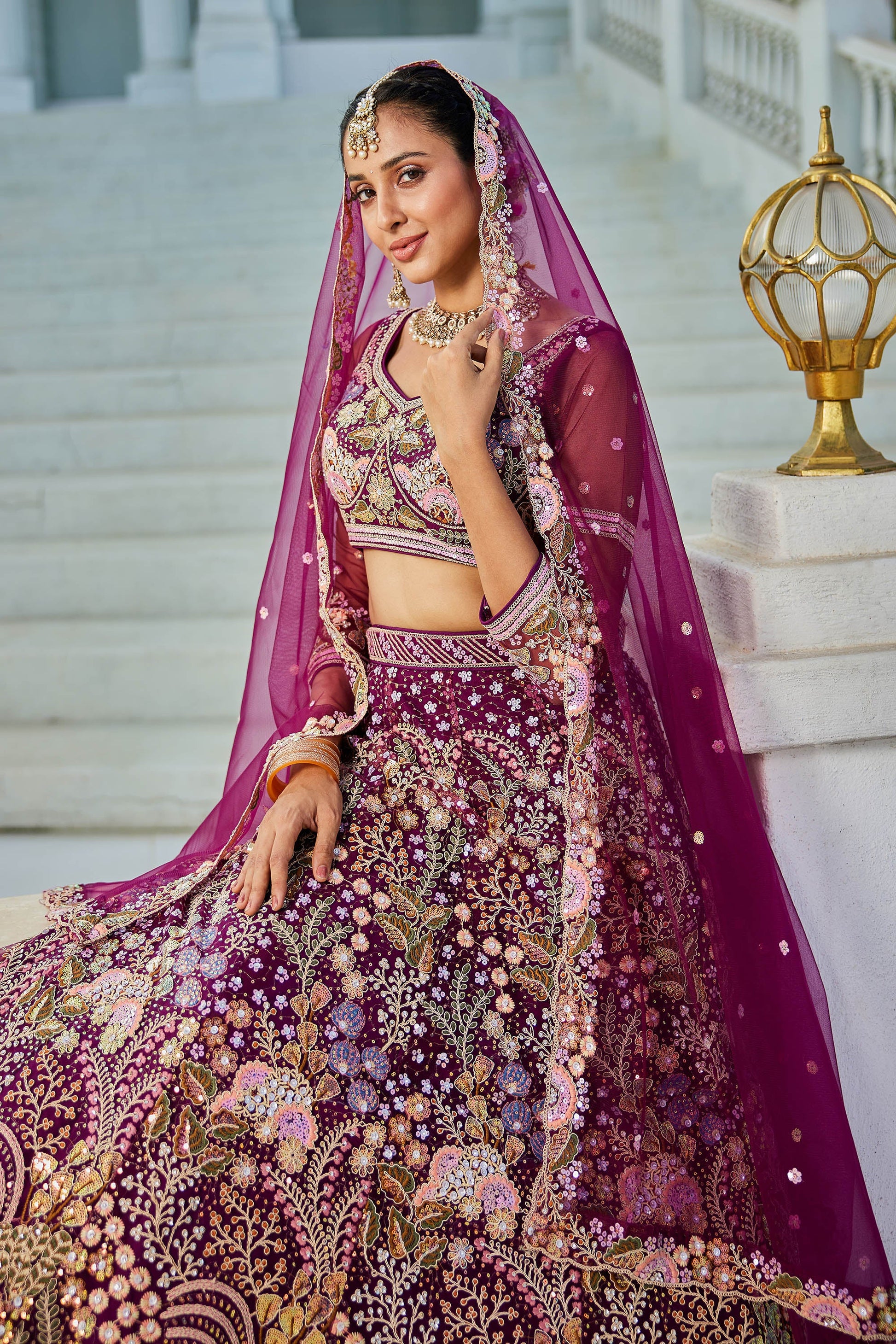 Burgundy net with Coding & Zarkan embroidery Lehenga choli & Dupatta