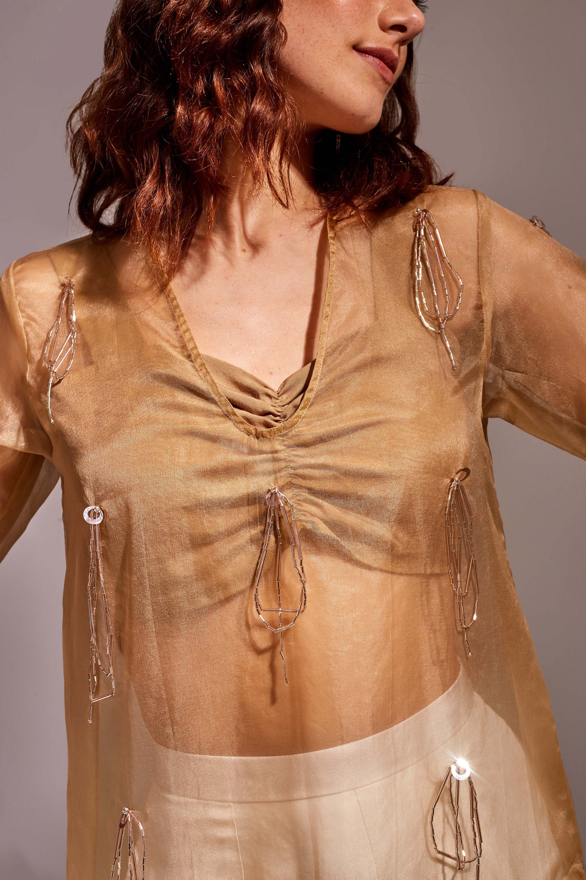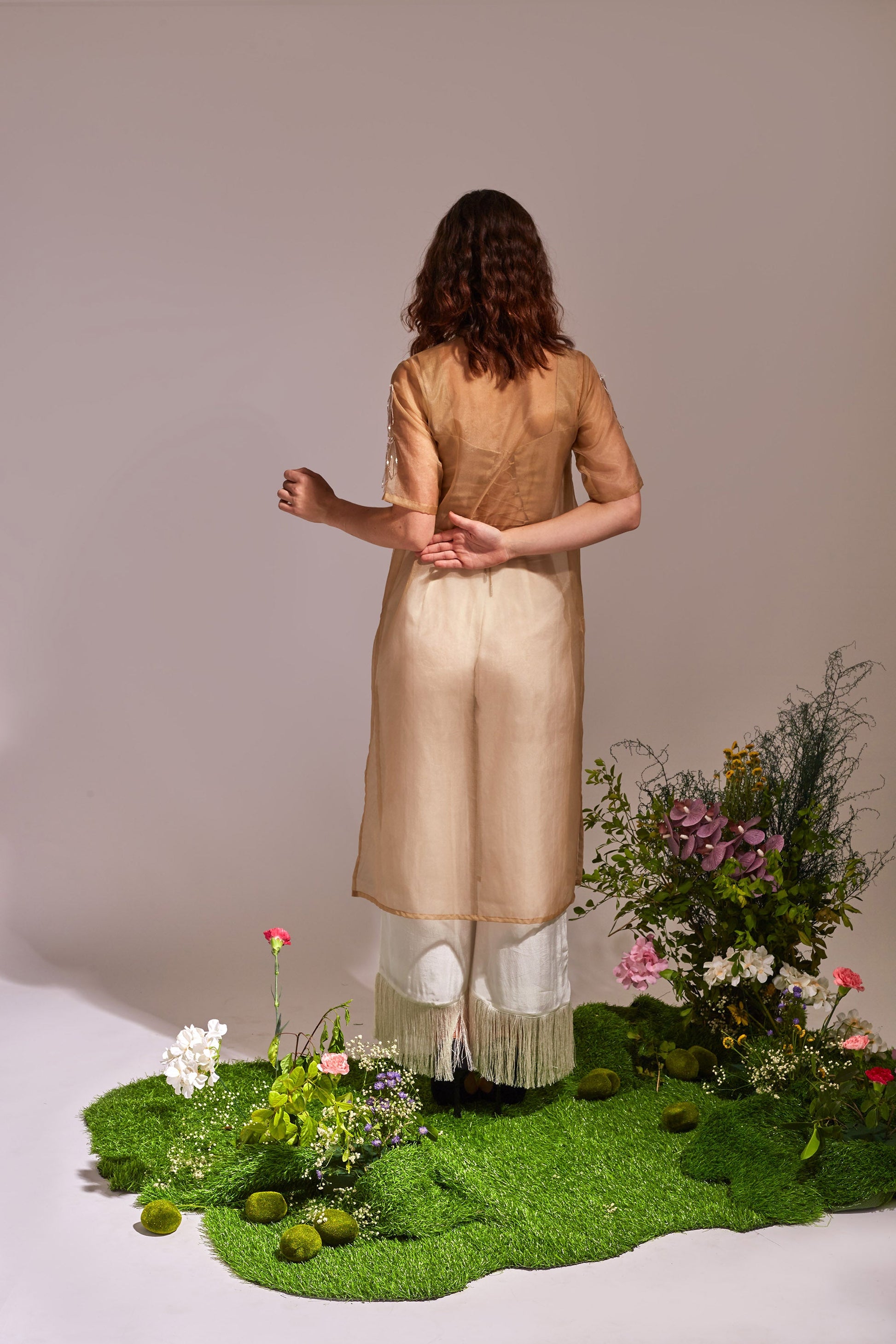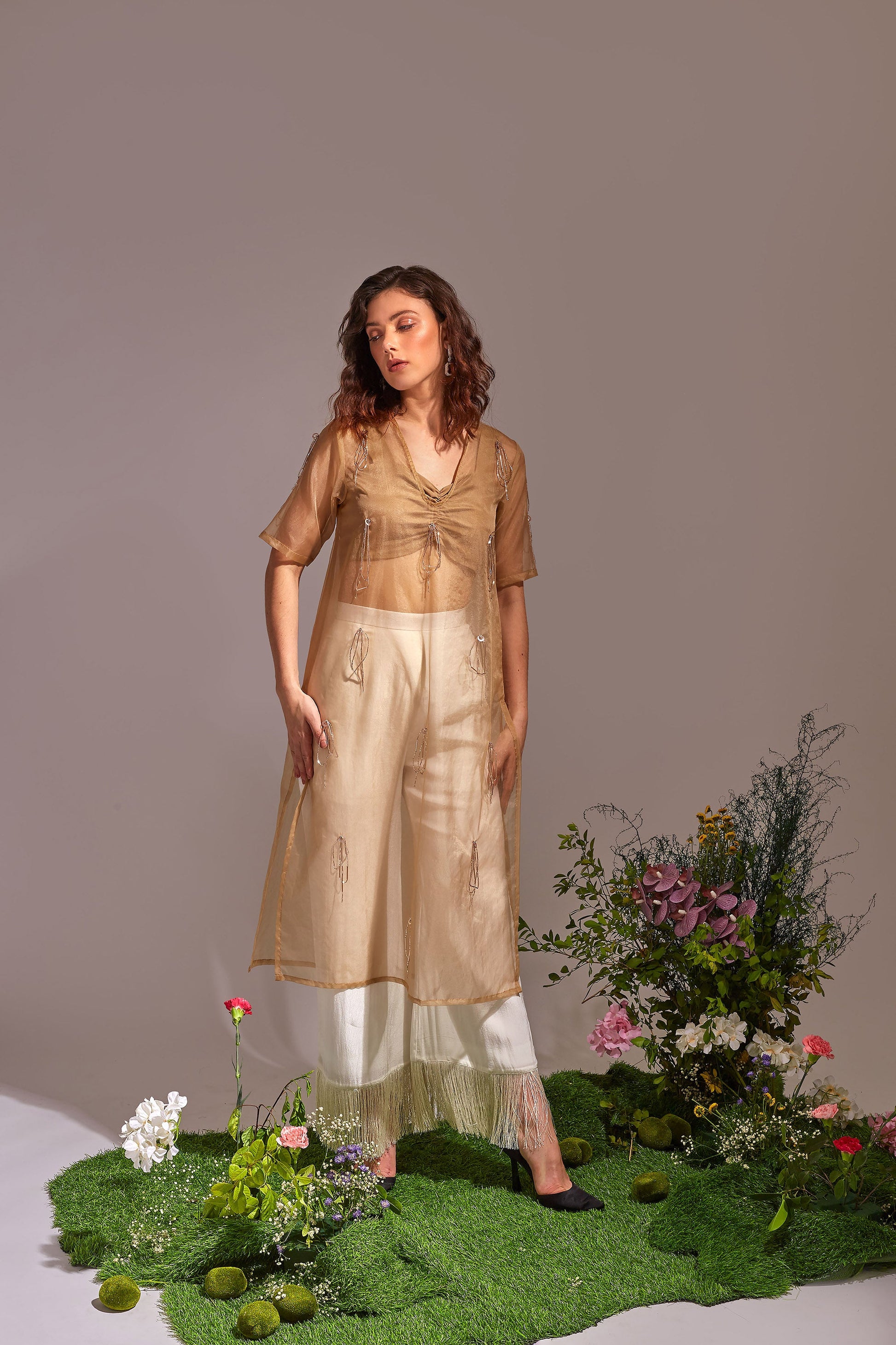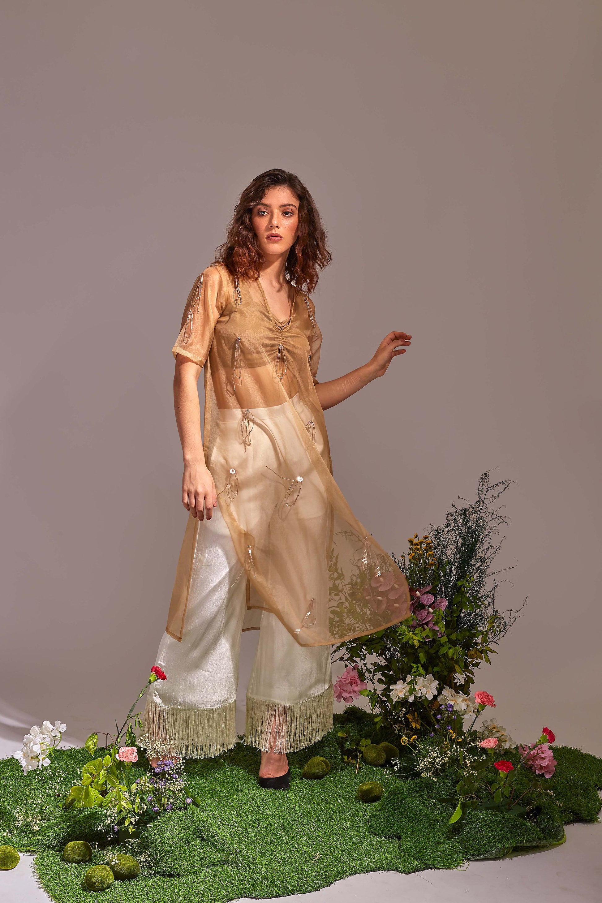 A party wear set in luxurious organza, adorned with intricate embroidered accents. This ensemble includes a flattering bustier for layering, perfectly paired with fringe fit-and-flare pants