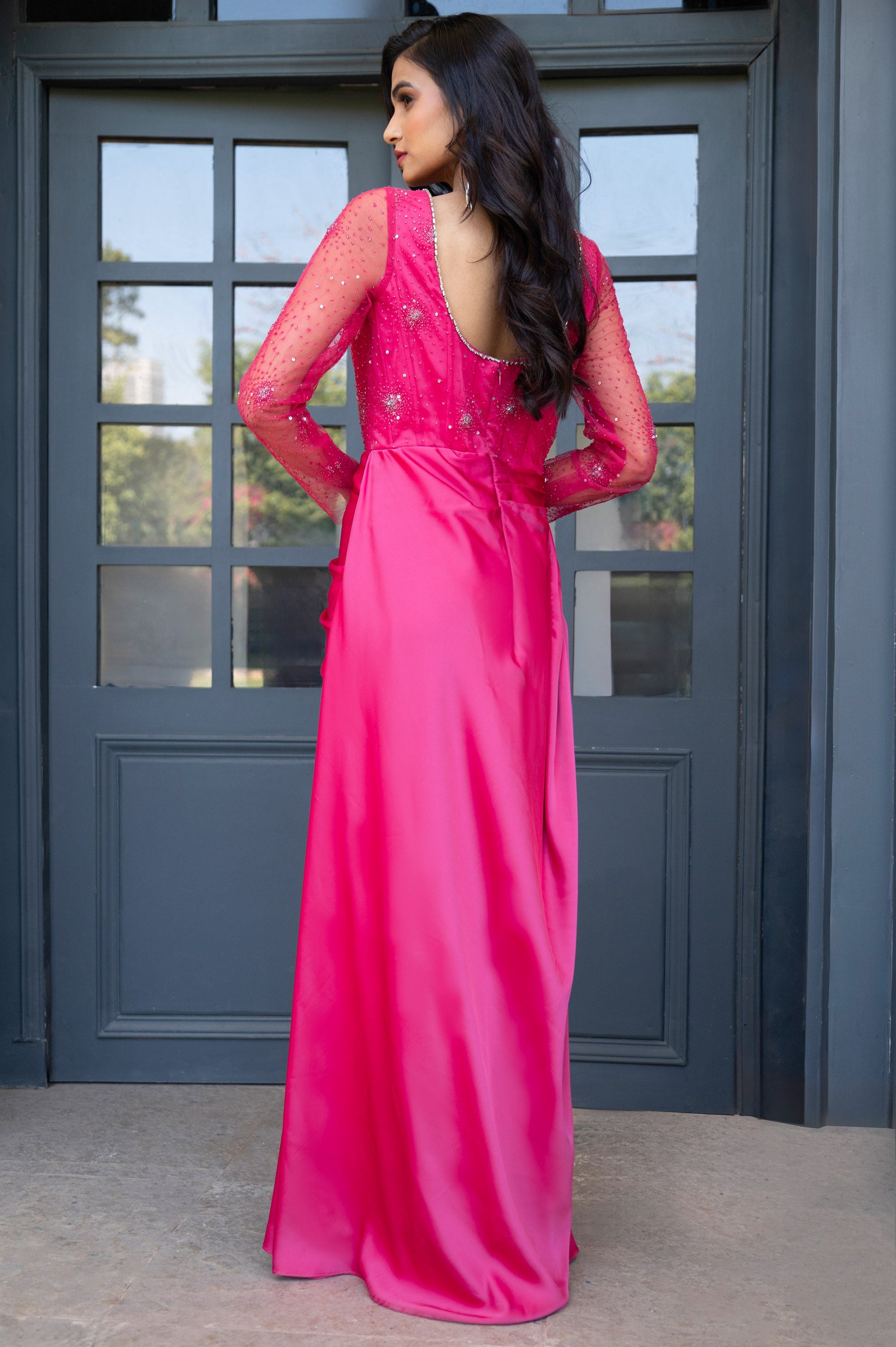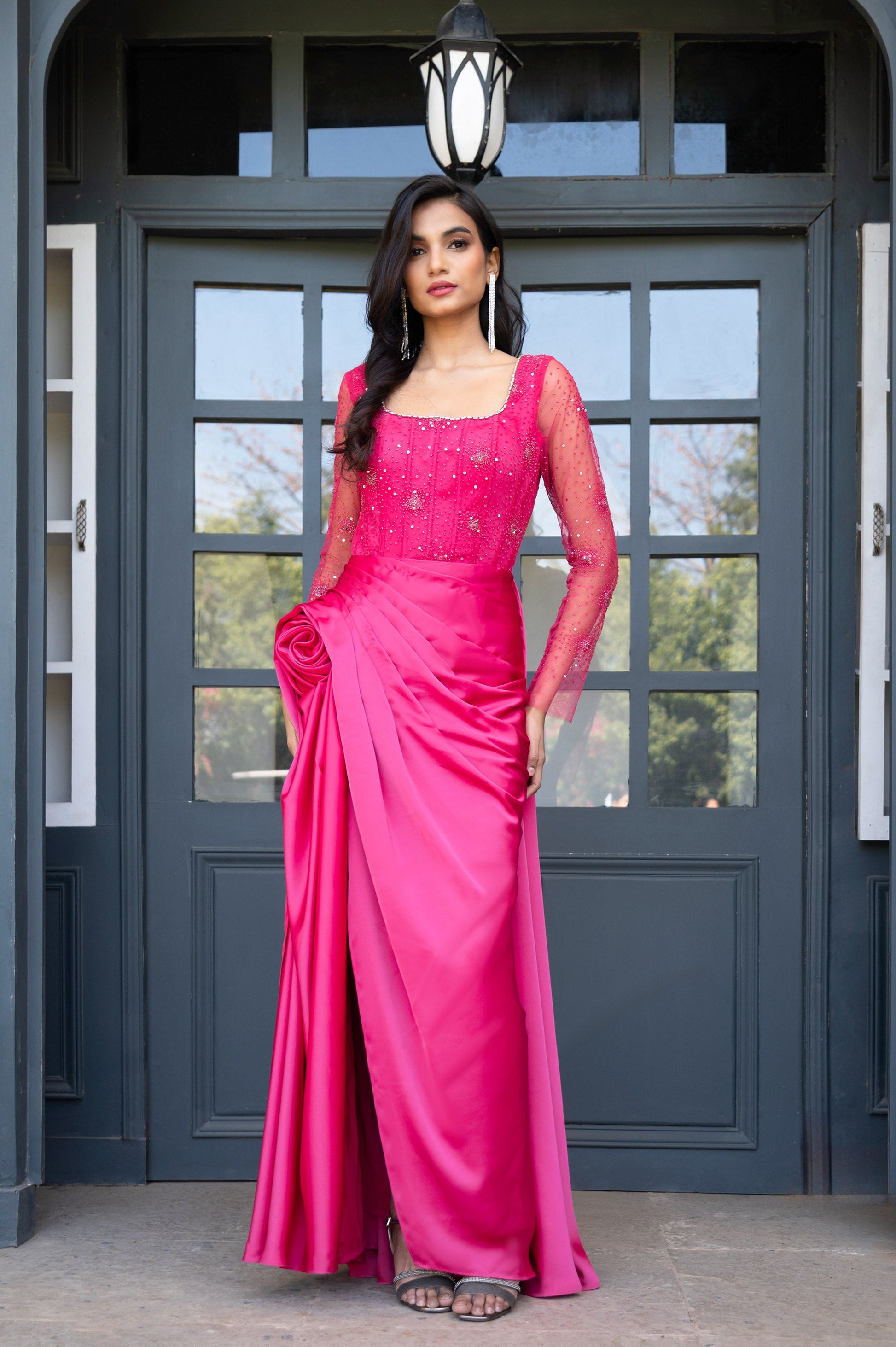 A striking fuchsia ensemble featuring a hand-embellished sheer-sleeve coat top and a sculpted draped skirt with a statement rosette detail.