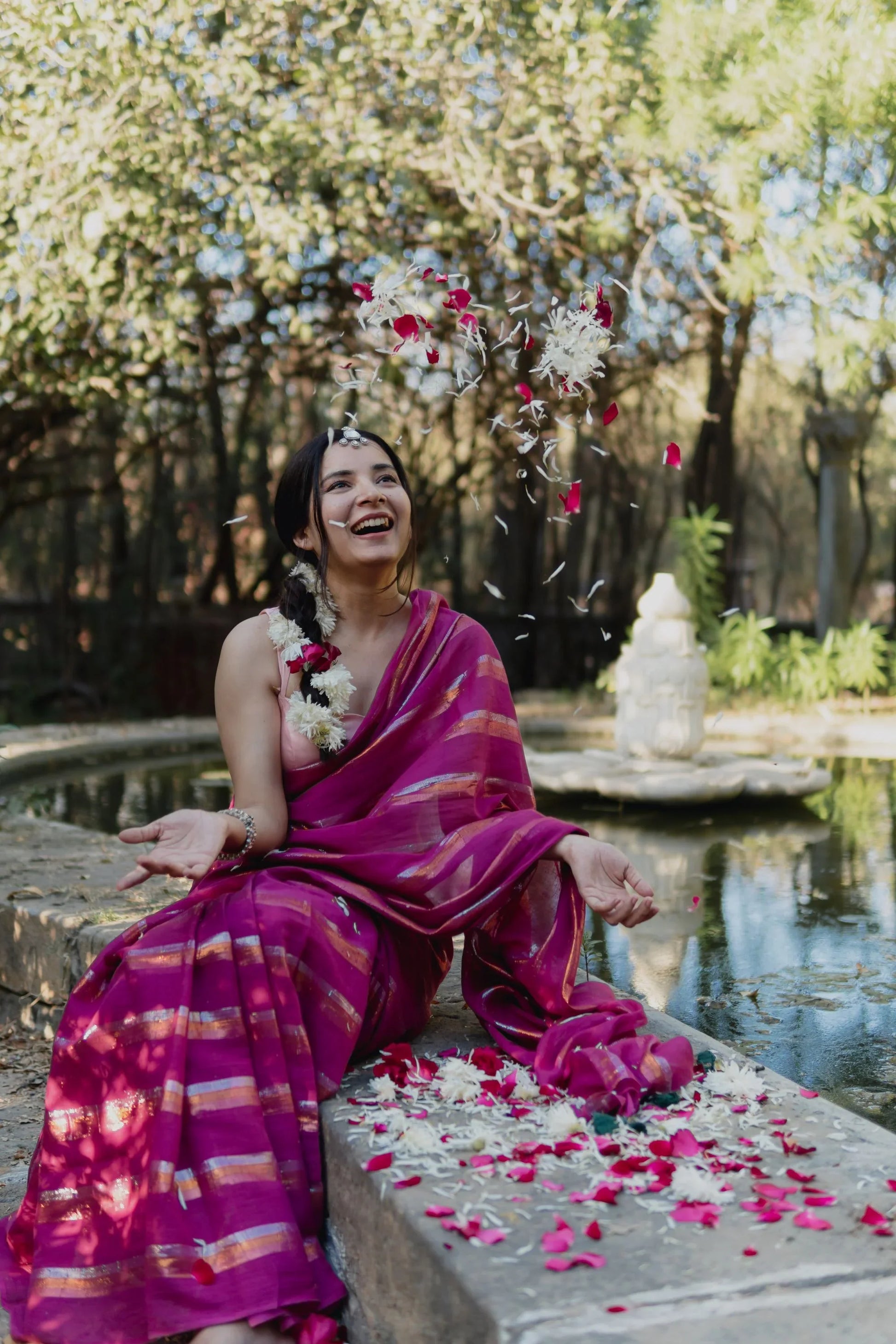 This saree is in cotton mulmul fabric with silver and gold lurex stripes. Saree has green color tassels at the pallu to enhance the look. Saree fabric is soft and flowy. Its very easy to drape, perfect for any occasion.