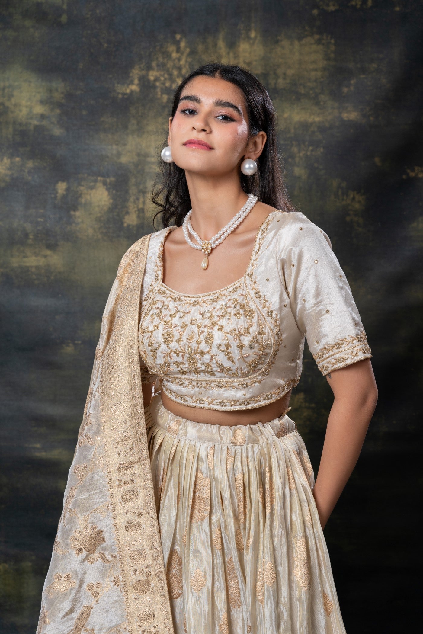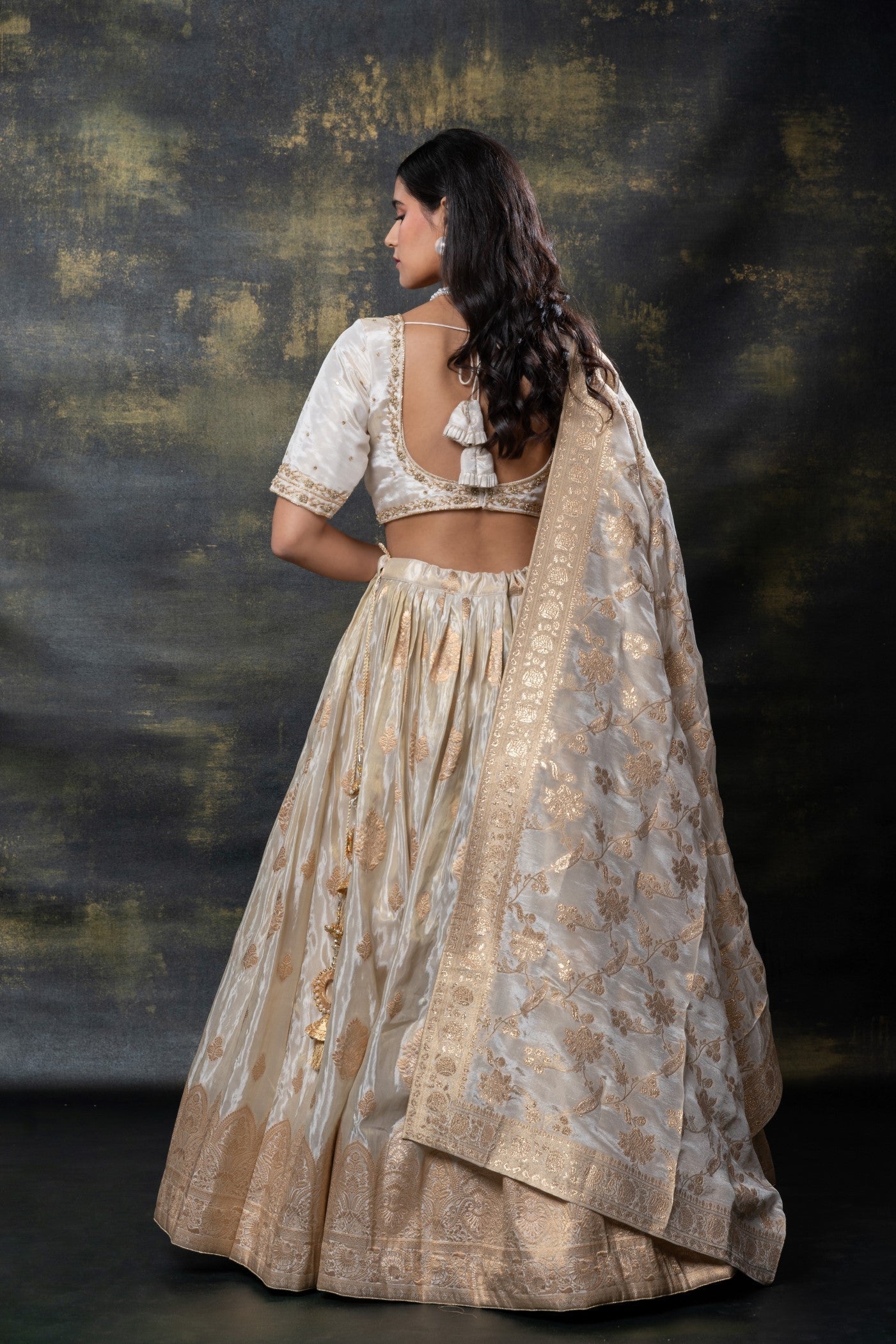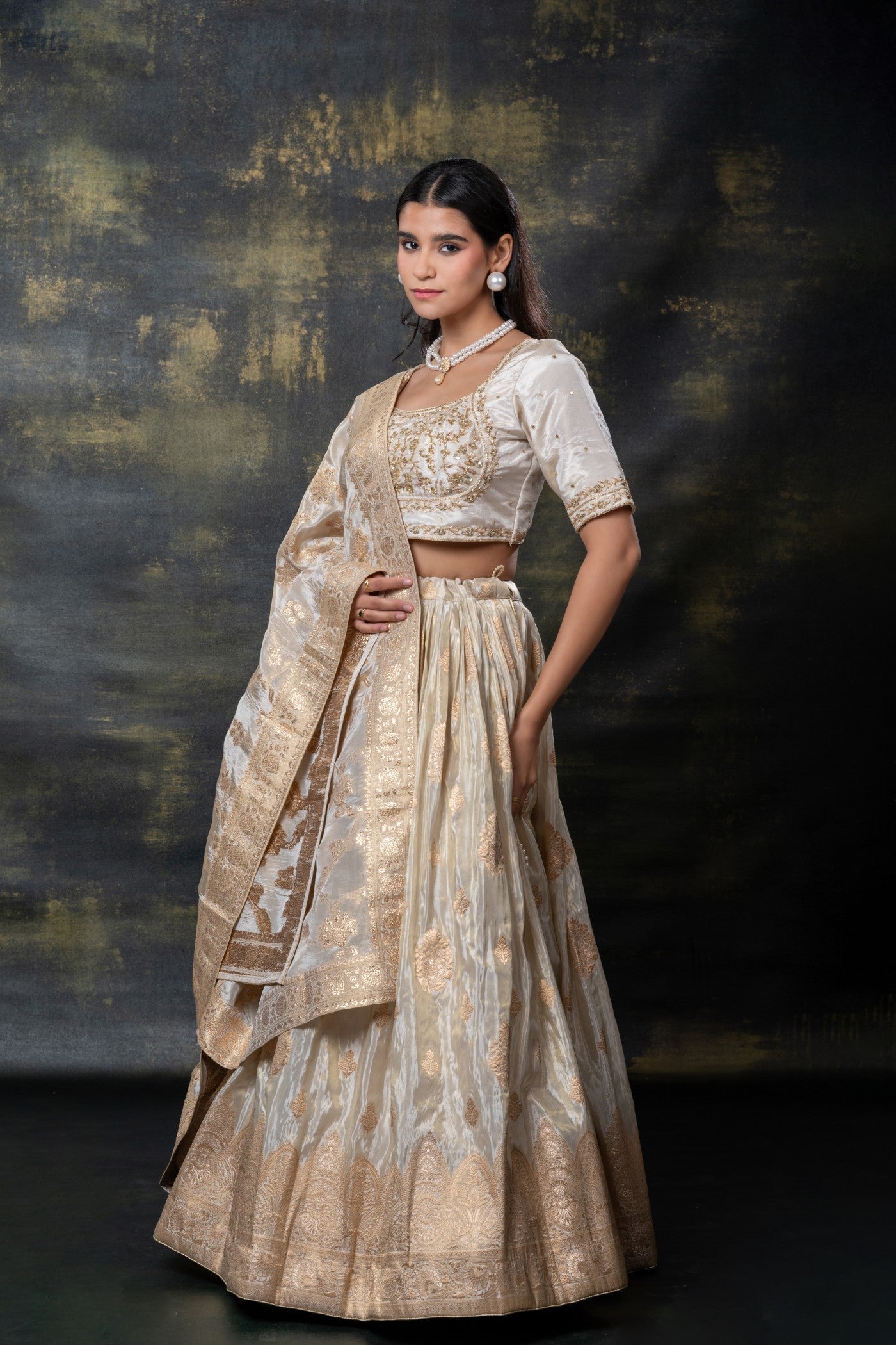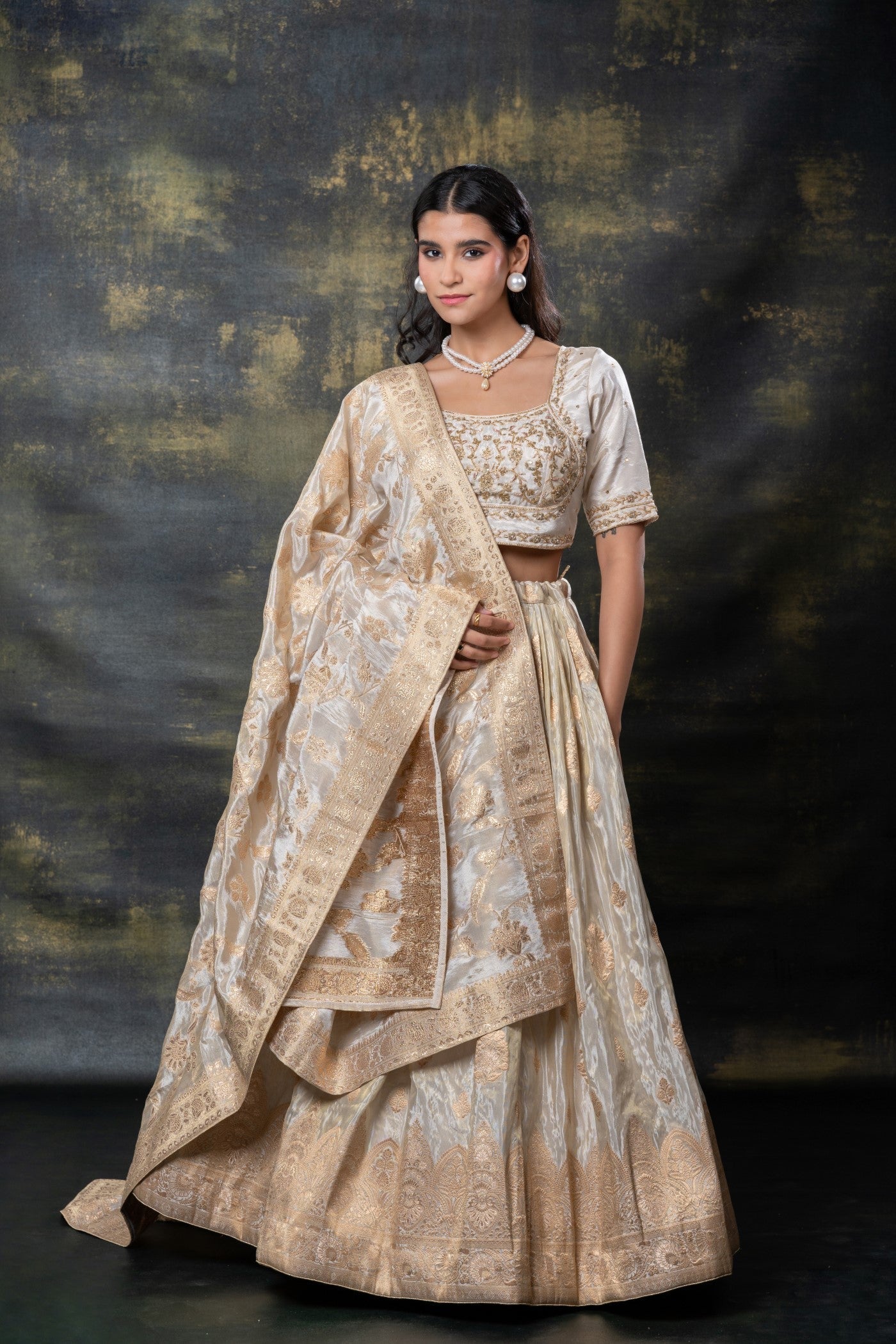 1) Cream beige banarasi soft silk lehenga with machine work.