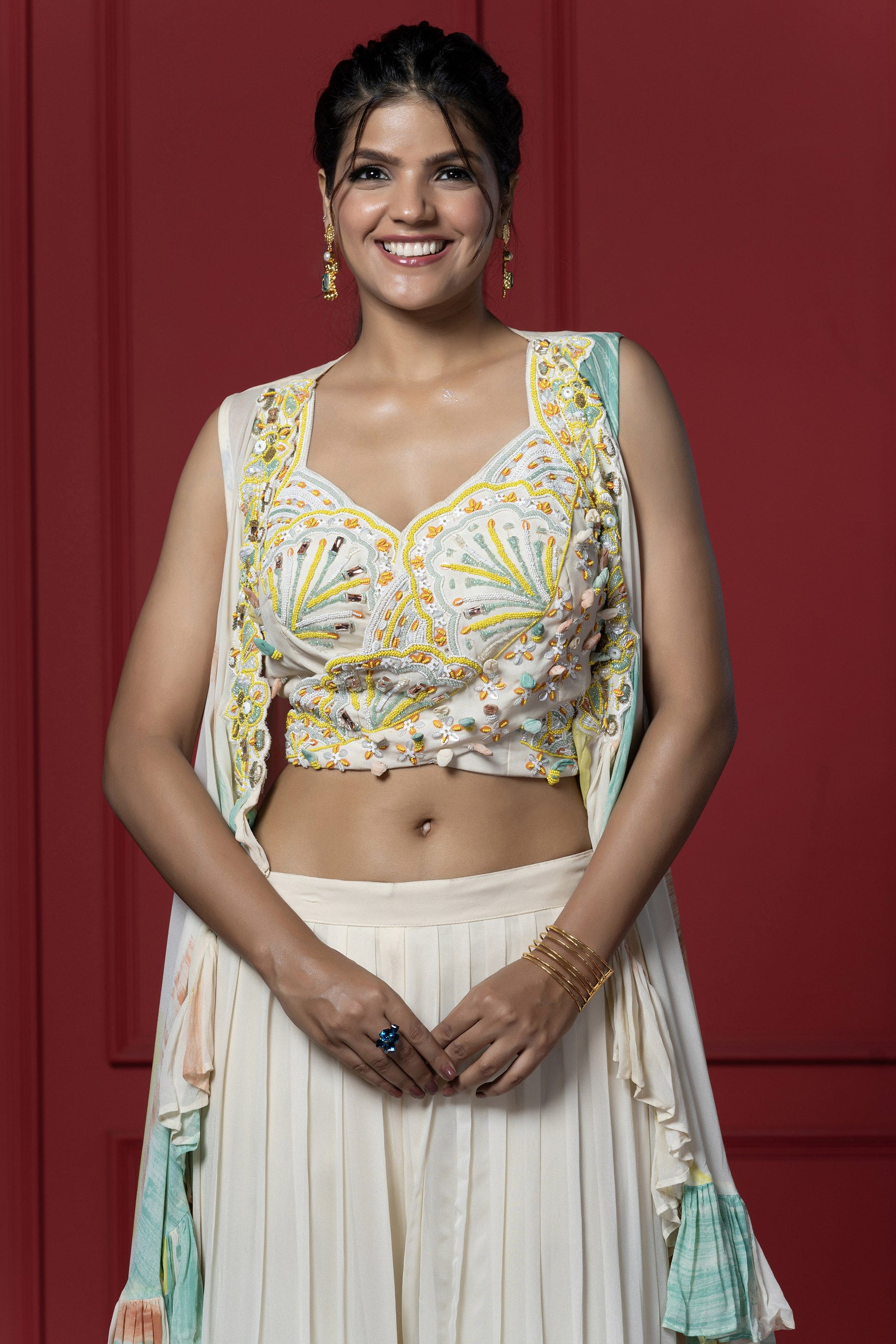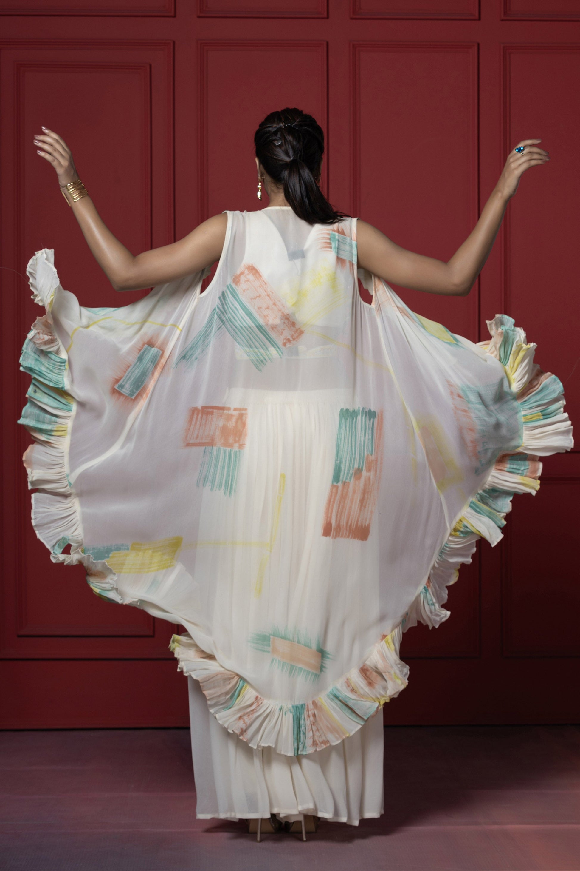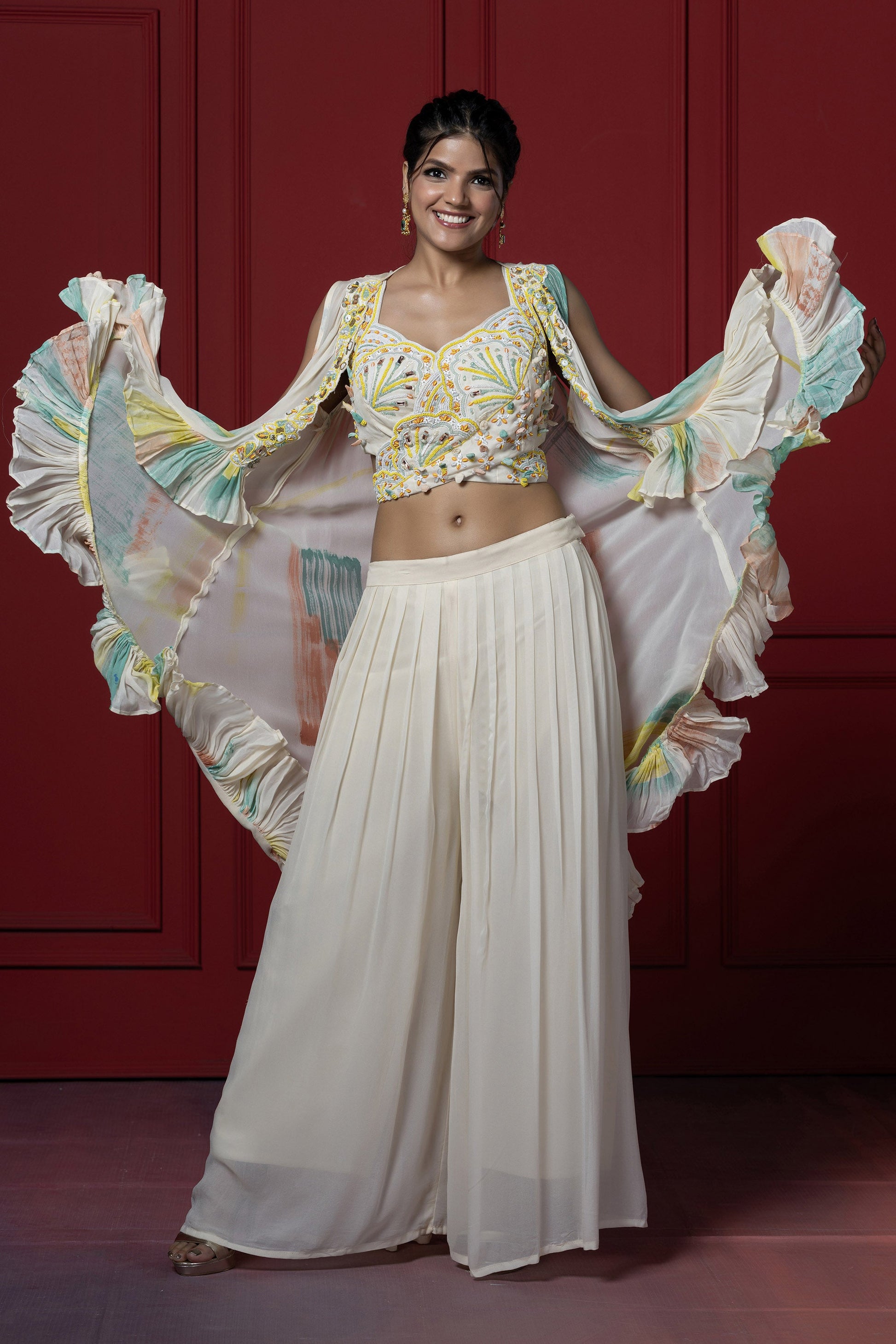 The outfit includes cape style drape with ruffled layer down one side, and the top is richly embriodered with intricate pastel beadwork adding texture to the outfit. jacket has innovative brush dye technique look chic & elegant.