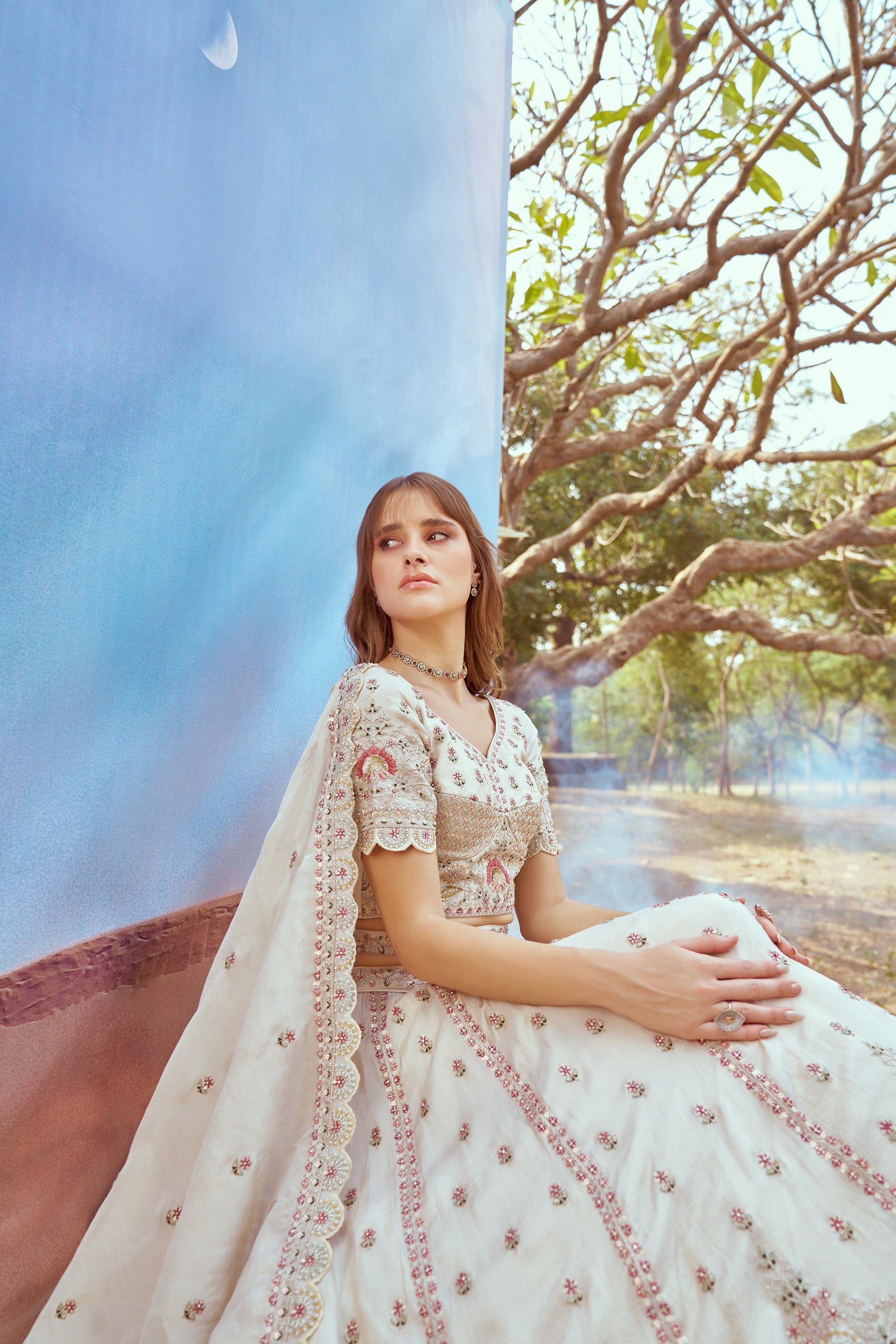 • Lehenga:- Made of premium quality Cream Colour Cold Crush Tissue fabric Full Flaire Semi-Stitched Lehenga With Heavy Moti and Zari work with thread Embroidery work. Has moti cutwork border on the hemline.
