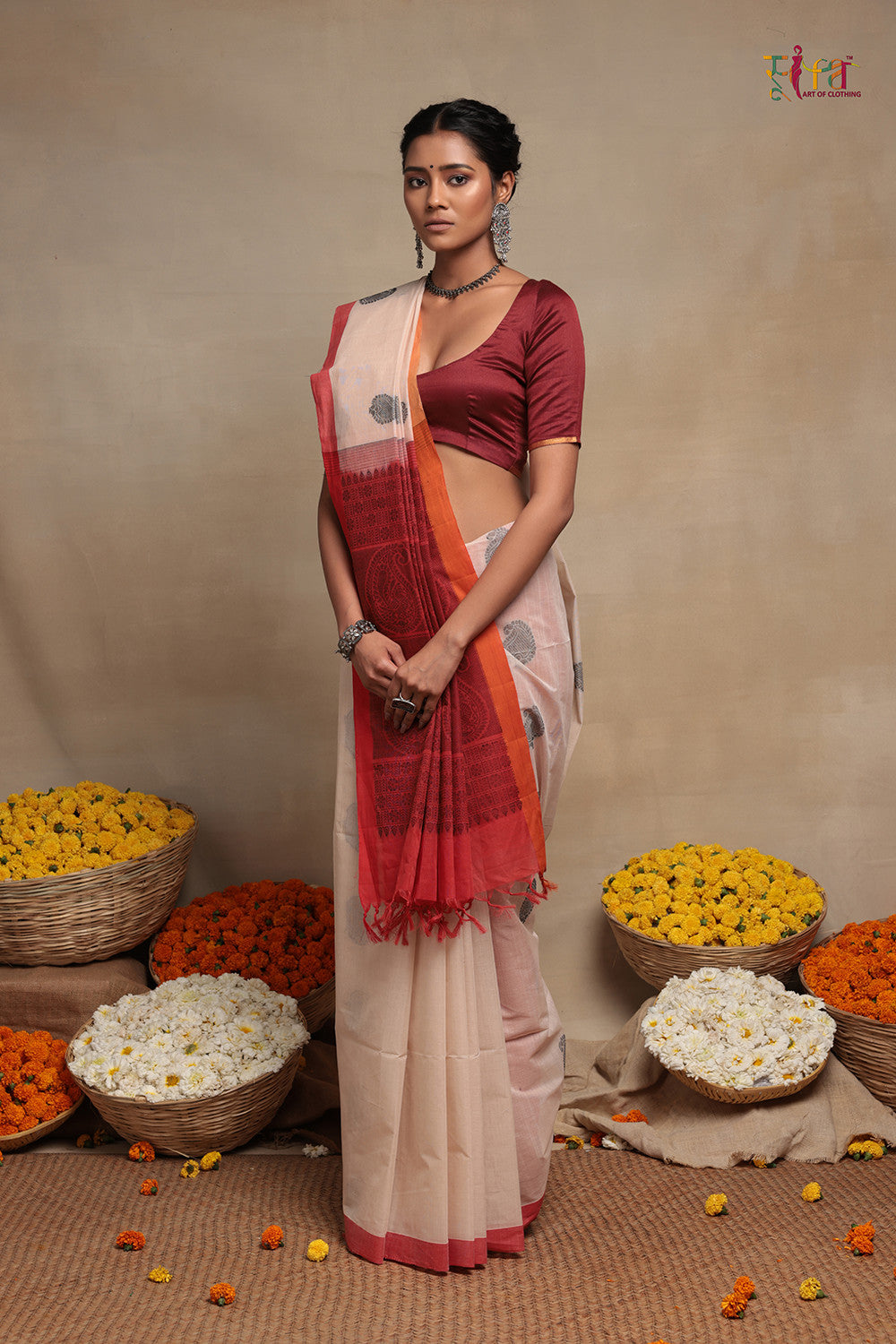 Indulge in the epitome of elegance with our Handloom cream pure cotton Kanchi Saree, adorned with delightful black color bootis. This exquisite masterpiece seamlessly blends tradition with contemporary style, creating a captivating visual feast. The tranquil red hue of the saree exudes a serene and sophisticated charm, while the pure cotton fabric embraces you in luxurious comfort and opulence. The border, enriched with striking shades of orange, infuses a burst of vibrancy and cultural allure.Embodying timeless beauty, this saree is a true symbol of grace and poise, making it an ideal choice for those seeking a refined and fashionable look. Whether you're celebrating a joyous occasion or attending a formal event, this saree ensures you radiate effortless grace and refined style.
