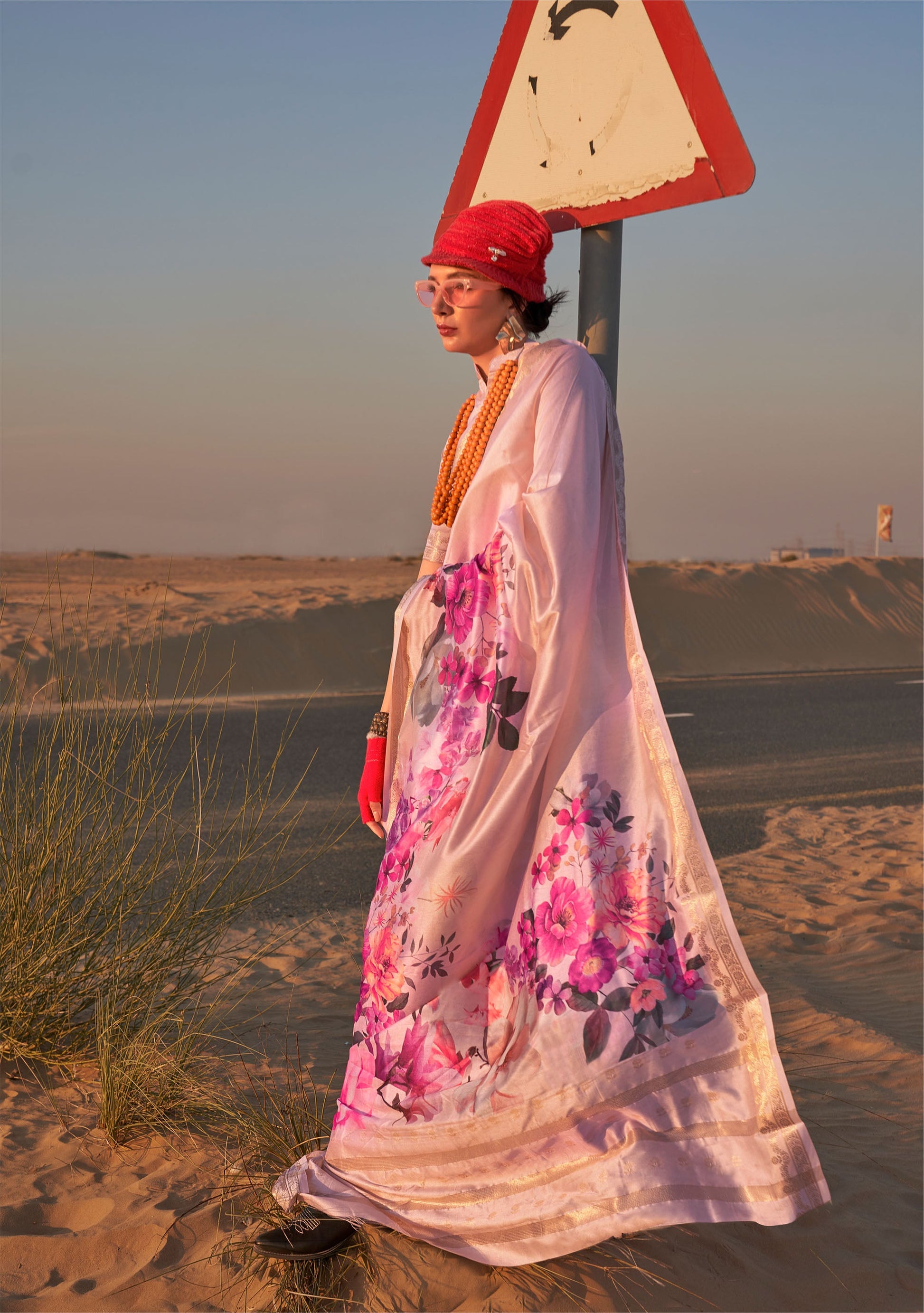 Cream Kikigai Printed Tussar Silk Saree