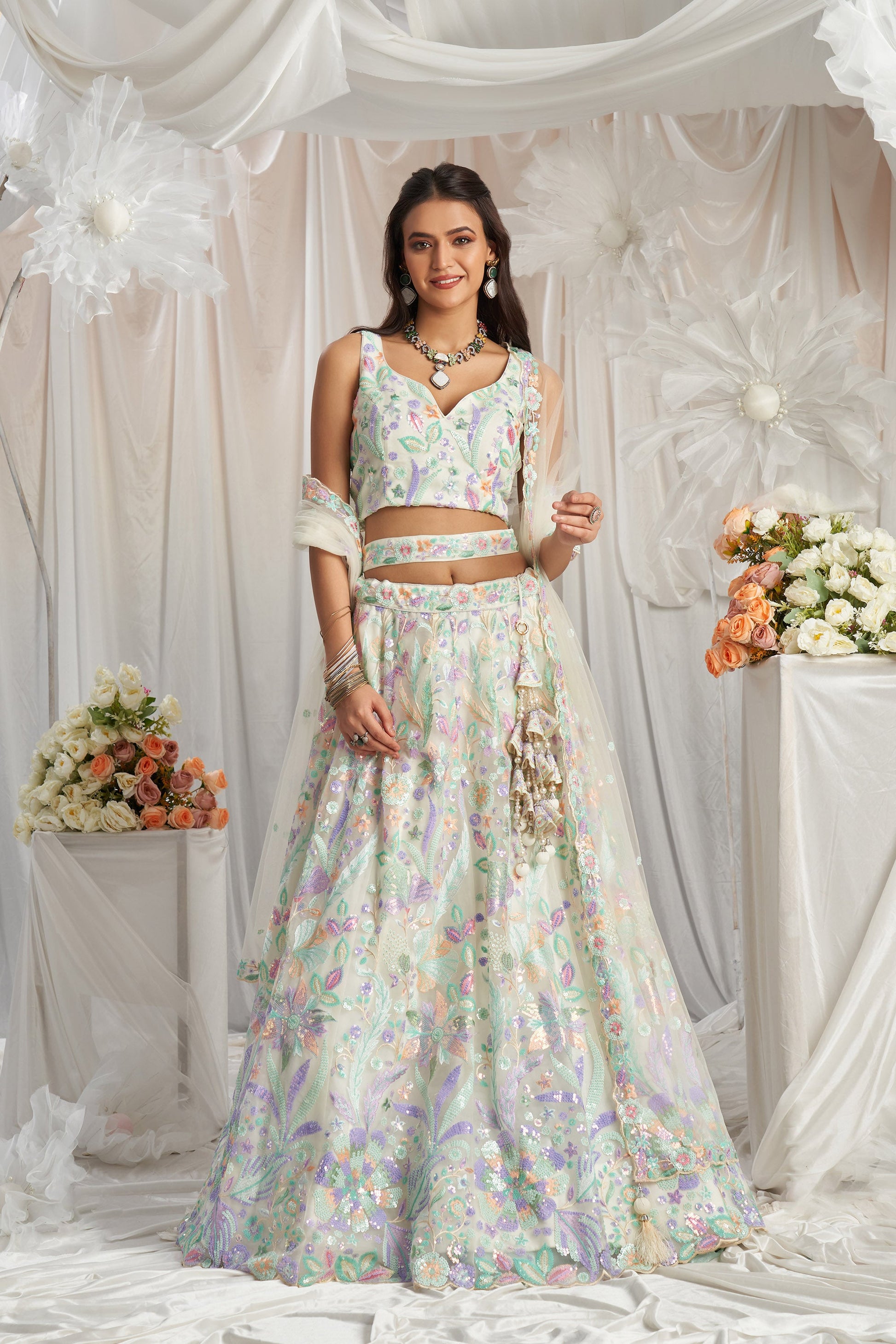 • Lehenga:- Made of premium quality Cream Colour Net fabric Full Flaire Semi-Stitched Lehenga With multi colour Sequins and Coding thread Embroidery work. Has a thread cut work border on the hemline.