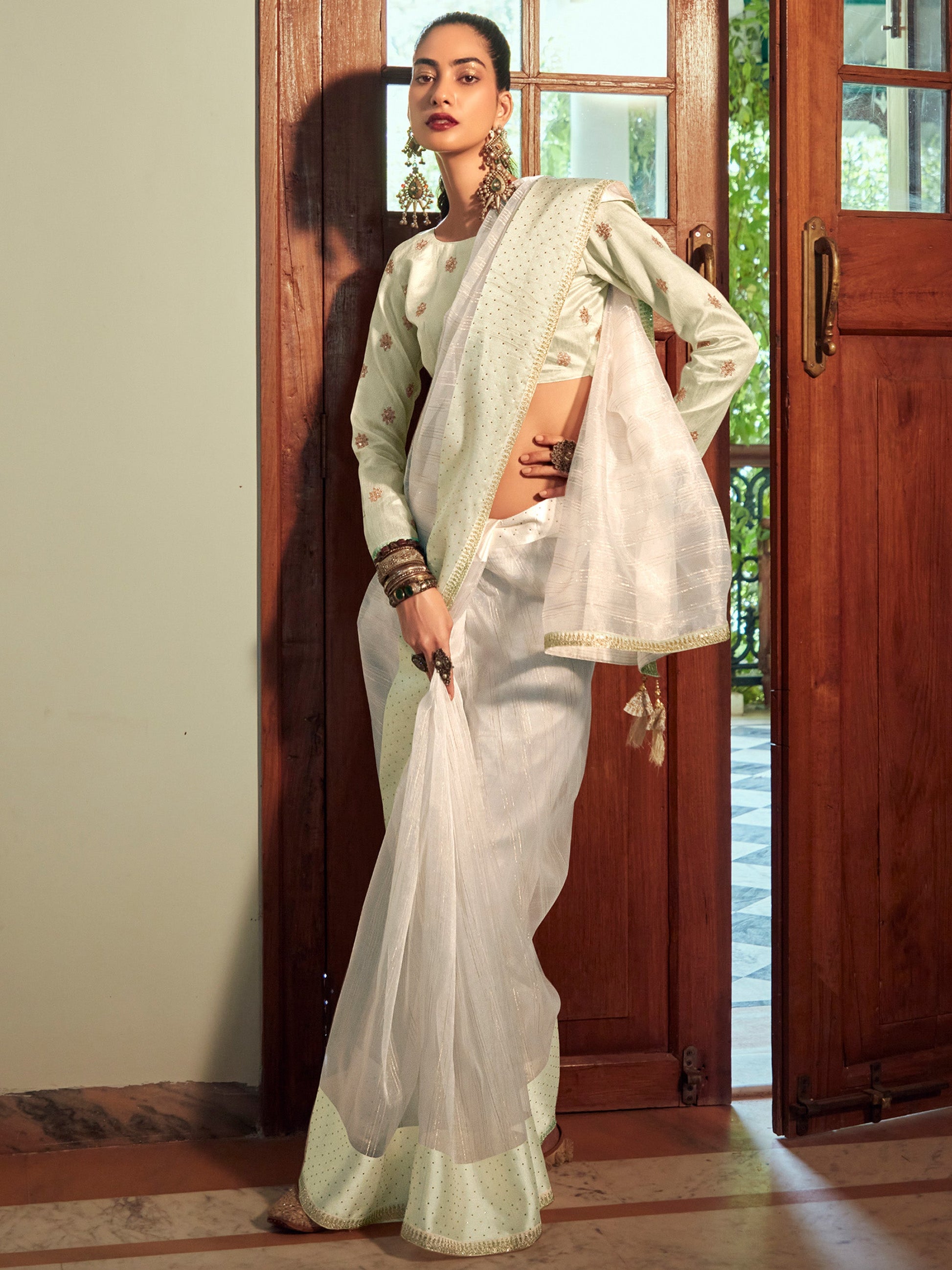 Organza Woven Saree. Pair them with matching accessories to look trendy and gorgeous. Organza Fabric With Jari & Embroidered Blouse With Crystal, Tassels.