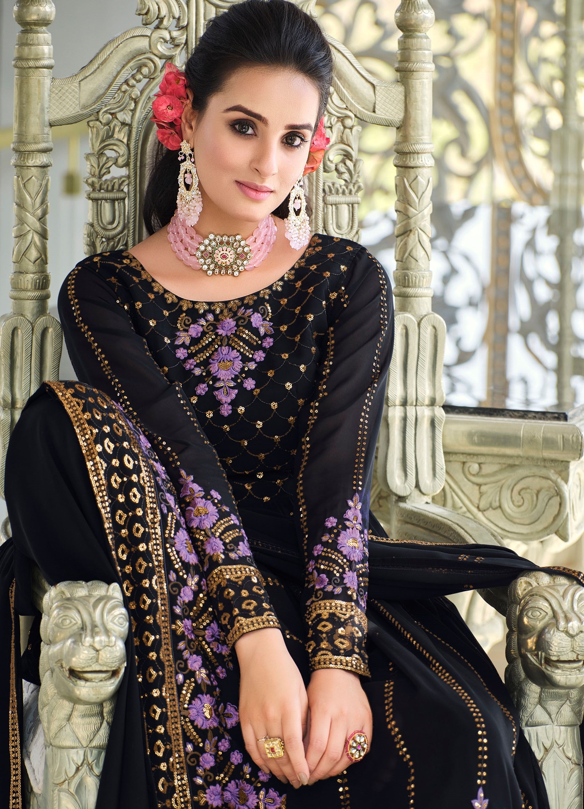 You will certainly be the center of attention in this Sharara if you wear it to a wedding reception, an engagement party, or a sangeet. Pictured here is a bridesmaid wearing the Dark Blue Thread Embroidery Georgette Sharara, which you can purchase today!