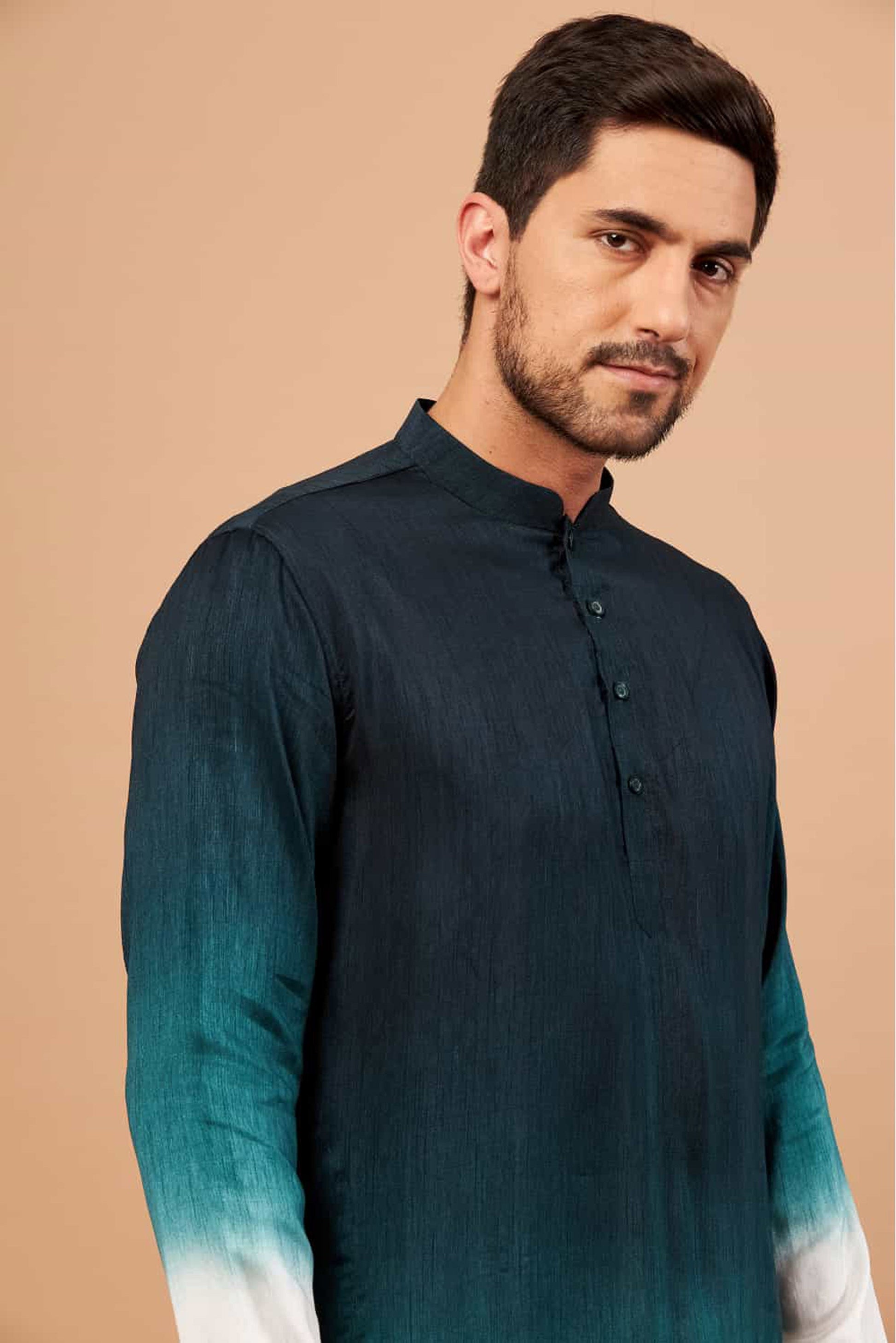This kurta boasts a stunning ombre effect, transitioning from a rich dark green to a crisp white shade. The kurta also offers a choice of three eye-catching embroidery options - a lion, a reindeer, or a flower - all stitched with a luxurious golden thread. These intricate details elevate the kurta and make it a standout piece in any wardrobe.