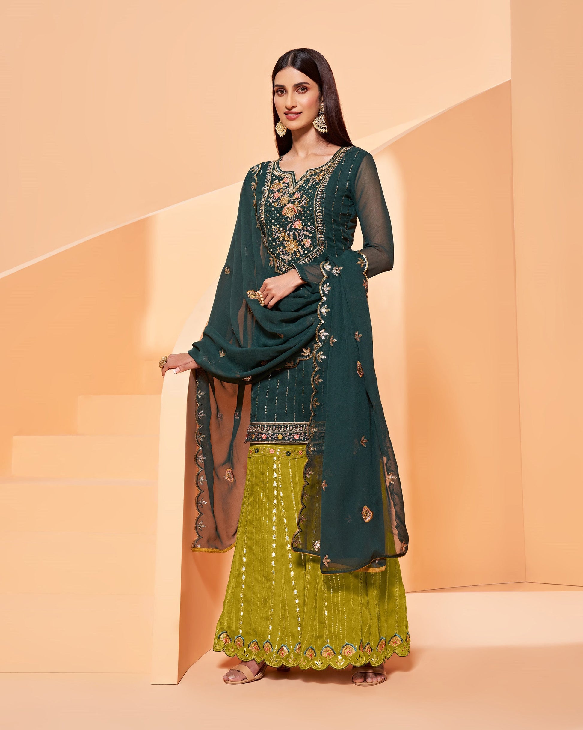 Dark Green Thread Embroidery Georgette Sharara for Mehendi