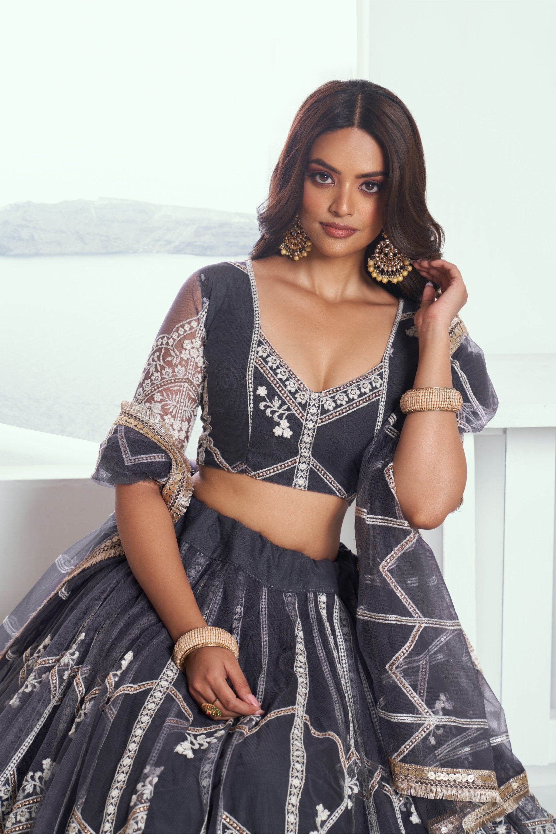 Looking for something a little out of the ordinary? We've got just the thing! This Dark Grey Sequins Embroidery Butterfly Net Bridesmaid Lehenga is perfect for those who want to make a statement. With its beautiful sequins embroidery and grey color, this lehenga is sure to make you the center of attention. A Bridesmaid would look gorgeous in this outfit. It is suitable for any occasion, such as weddings, receptions, engagement parties, and sangeets. So don't wait any longer, add this Dark Grey Sequins Embroidery Butterfly Net Bridesmaid Lehenga to your wardrobe today!