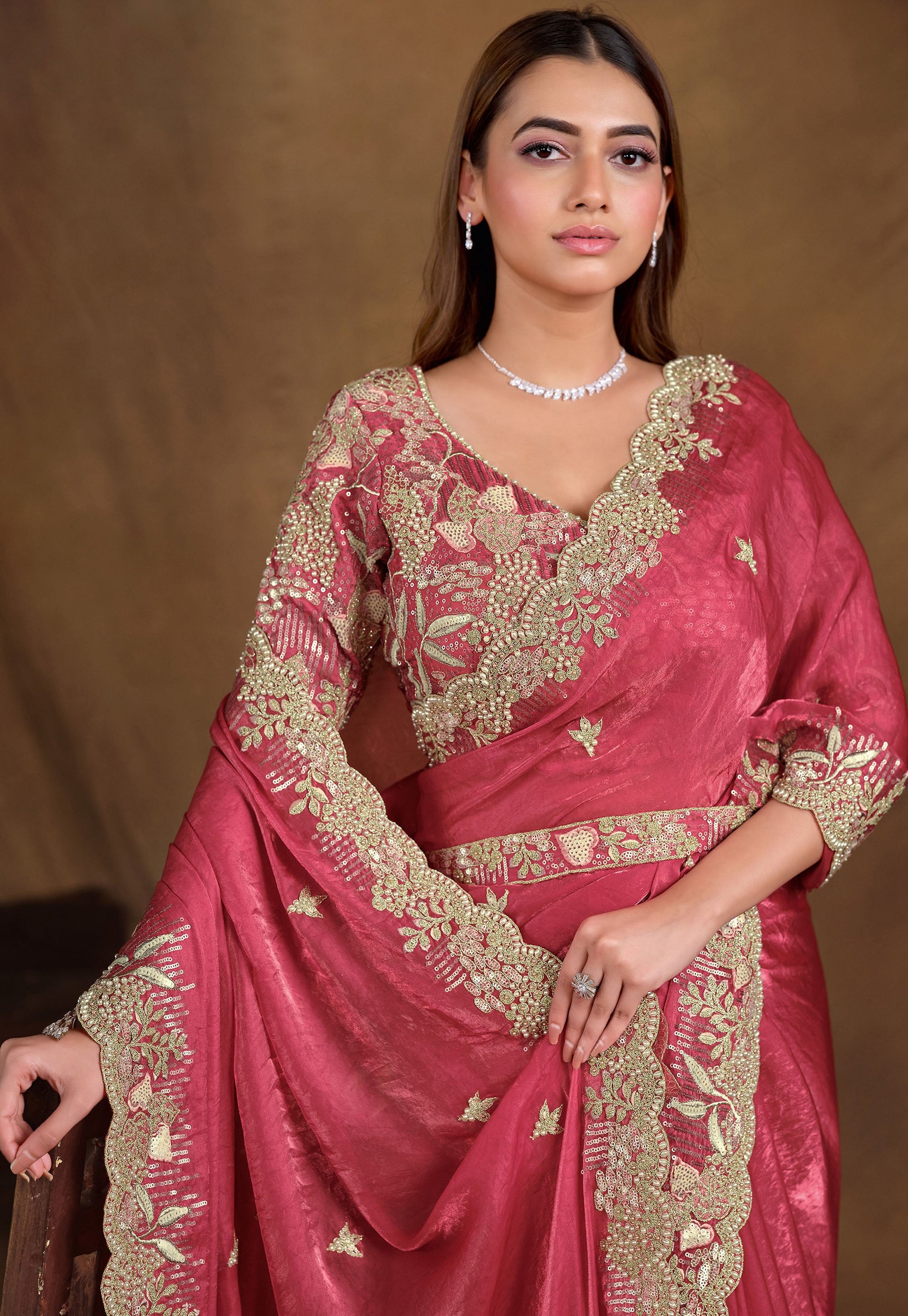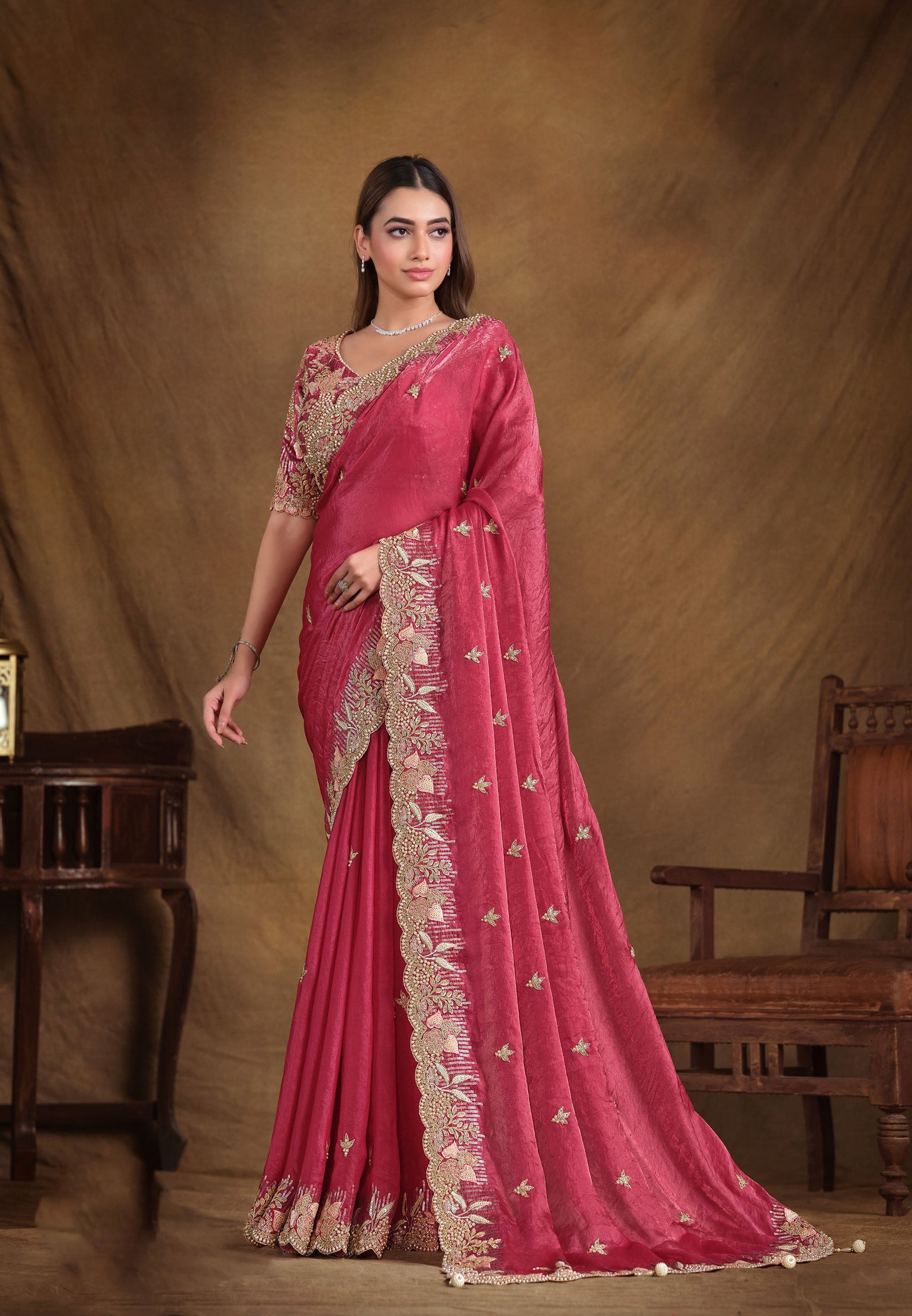 Dark Pink Two Tone Satin Silk Hand and Pearl work Party Wear Saree
