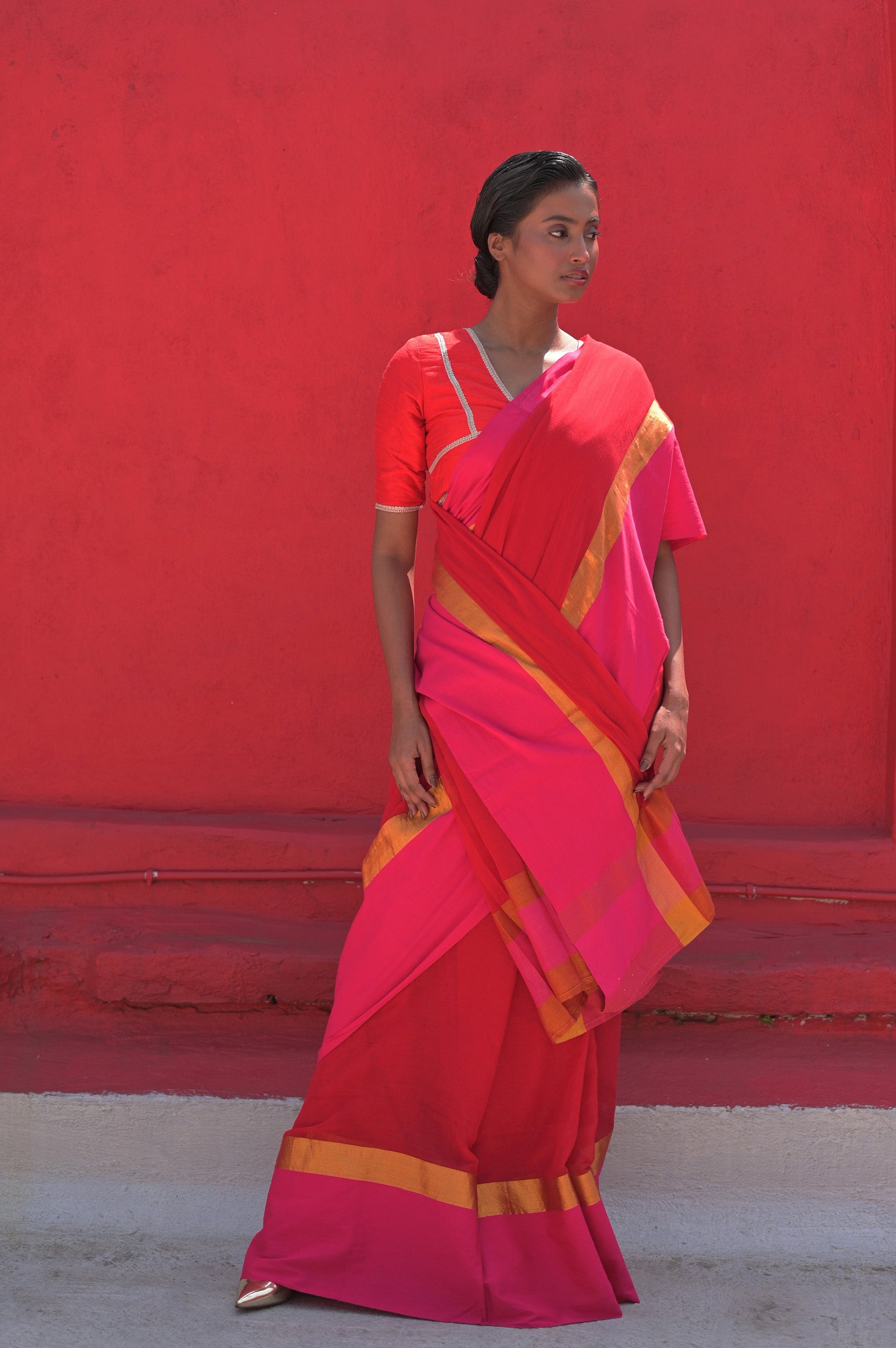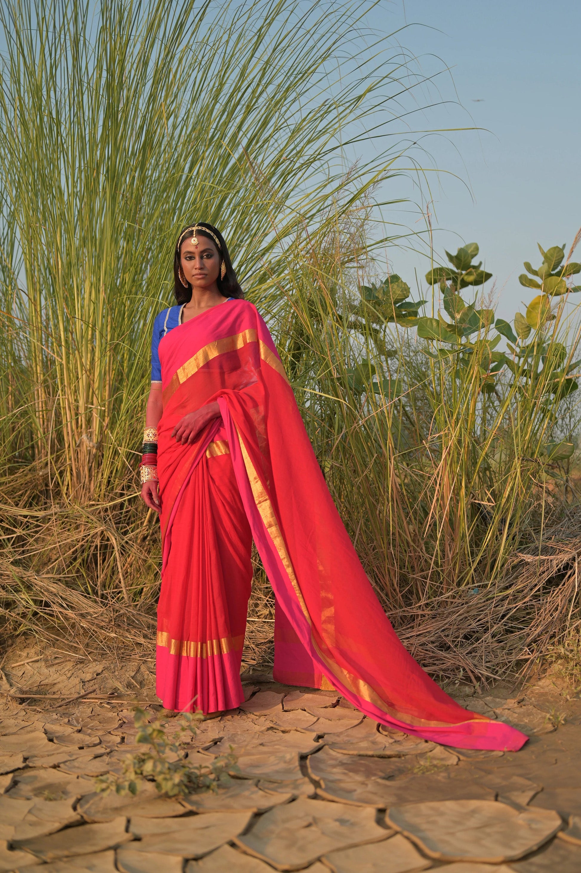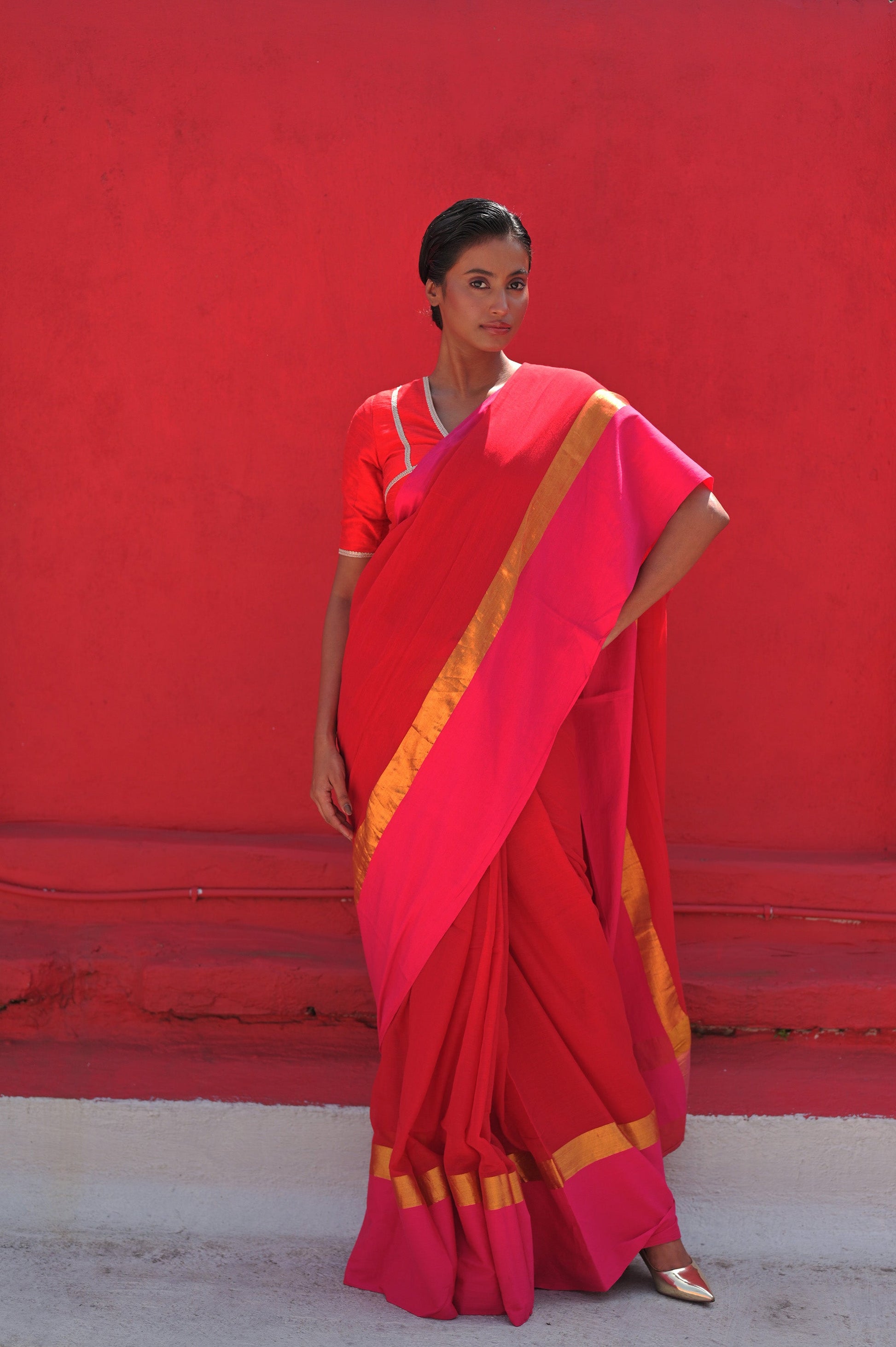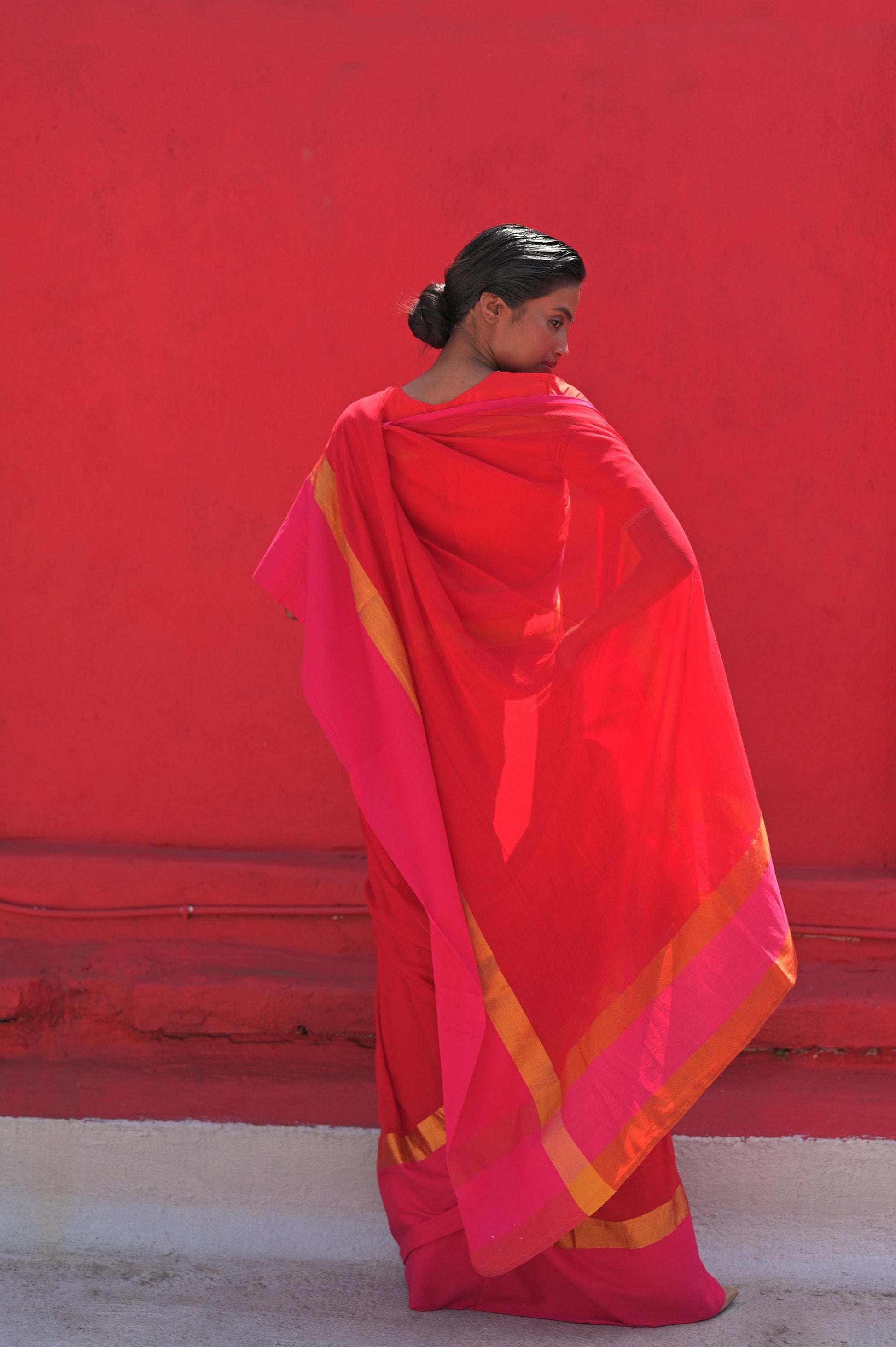 Dayita I Red Handloom Cotton Saree with Pink and Golden Border