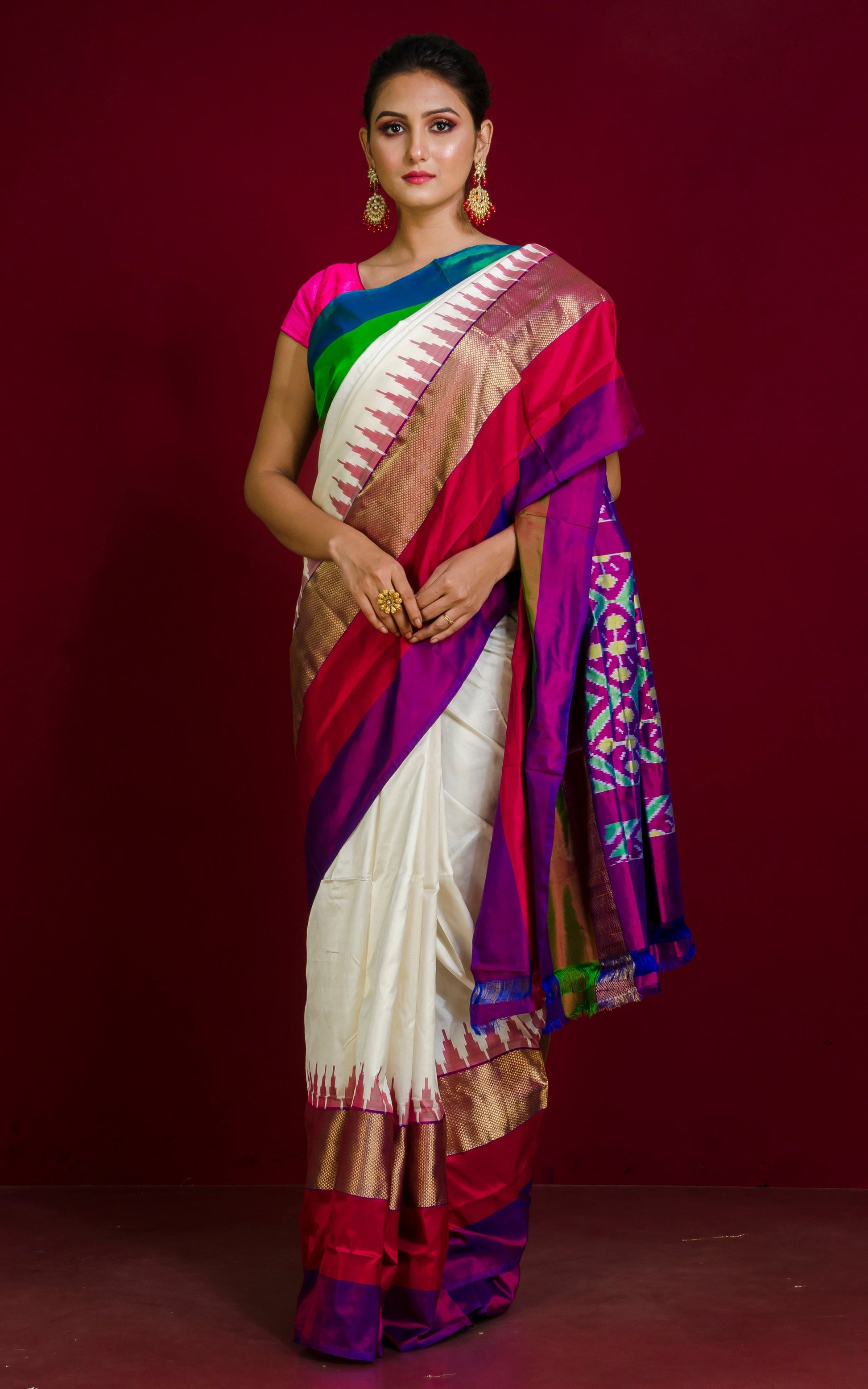 Designer Skirt Border Ikkat Pochampally Silk Saree in Off White and Multicolored