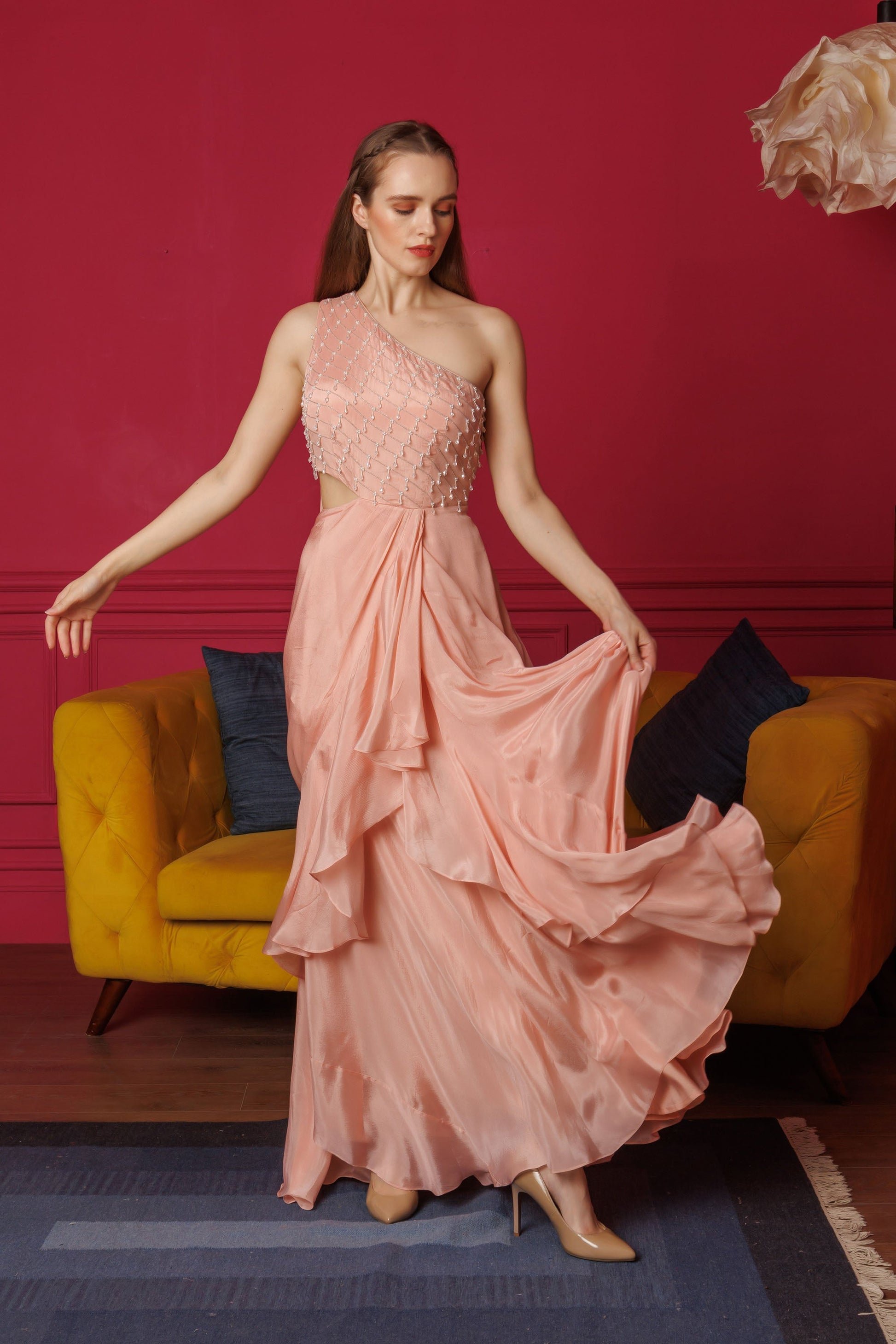 One Shouldered Draped Gown This one shoulder draped gown is surely a showstopper. Embellished and elevated with glass beads, this look is light and flowy, and sure to make a statement.