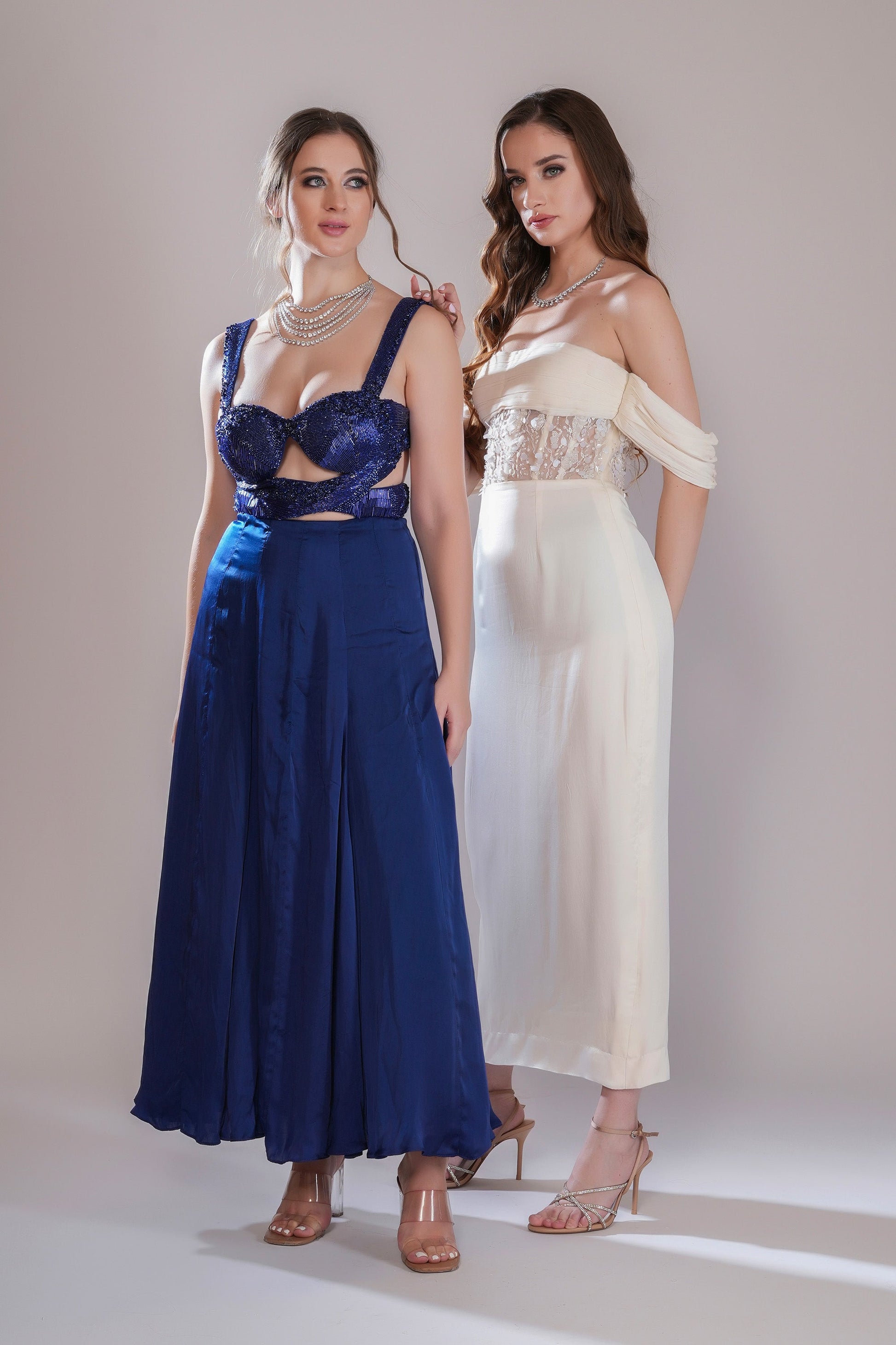 A dark blue dress featuring a sweetheart neckline, crisscross bodice, and pleated floor-length skirt. The strategic cutouts at the waist and the flowing pleats create a timeless silhouette, along with the shimmering beaded bodice.