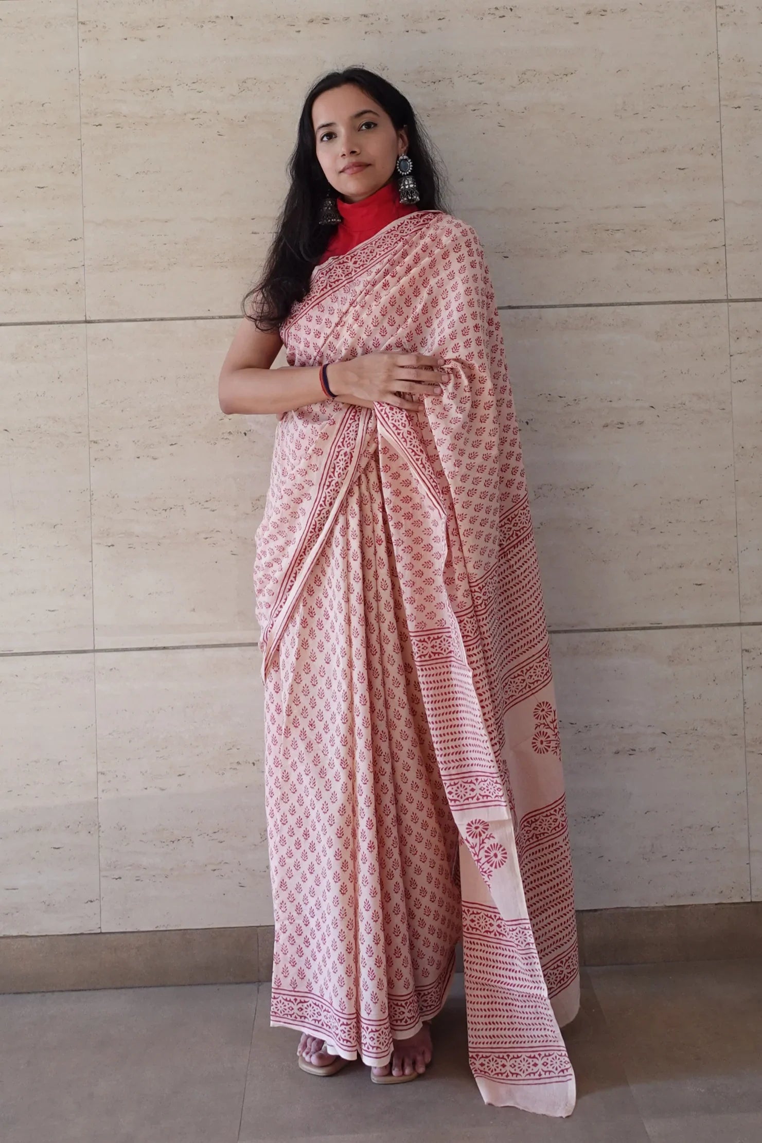 Earthy Essence Saree Handblock Print Natural Dyed - BeigeMulmul Cotton Saree