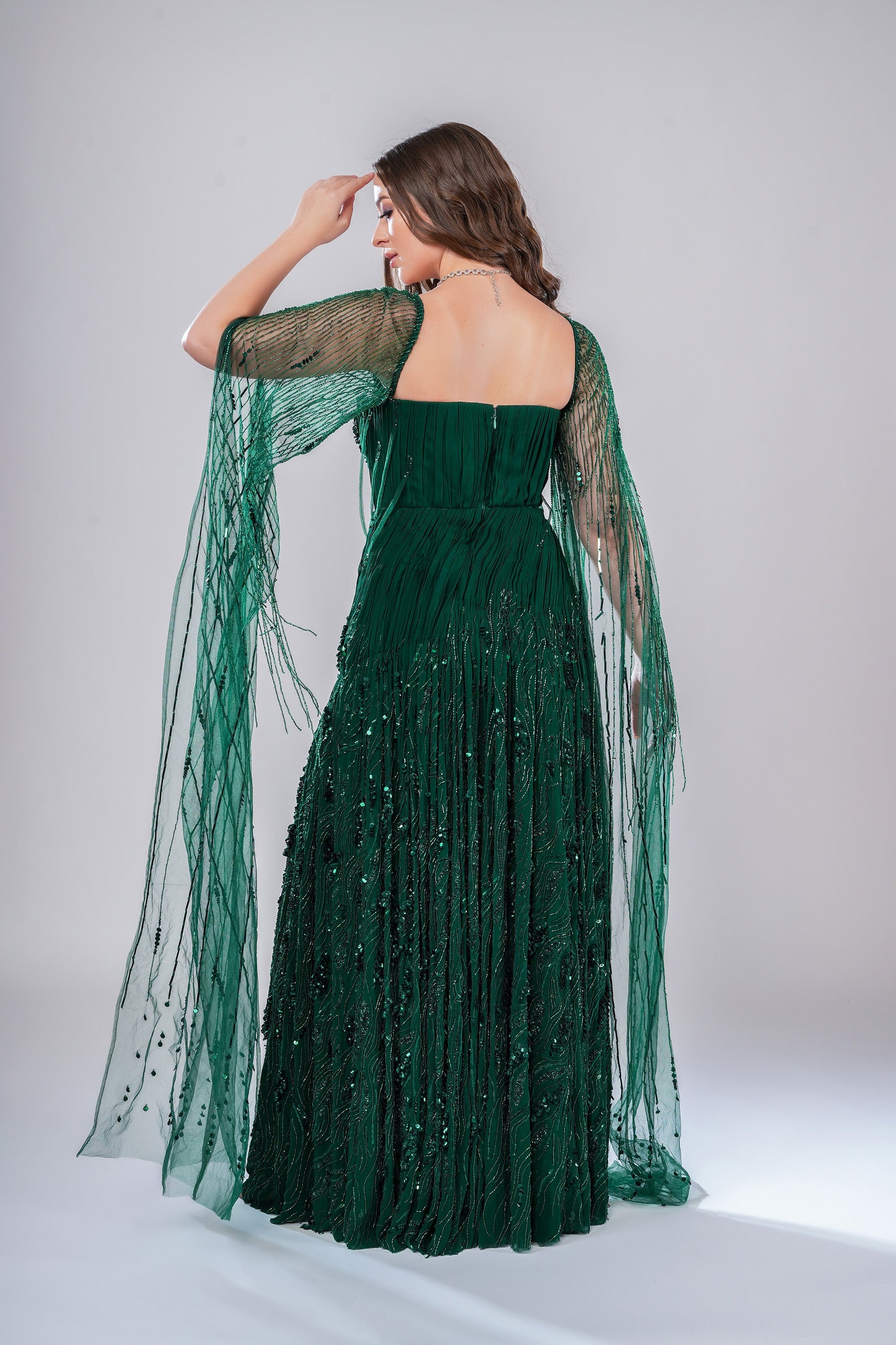 An emerald green gown featuring a sweetheart neckline and long, flowing detachable sleeves that cascade to the floor, evoking a sense of mystical elegance. The fitted bodice with intricate pleating elongates the silhouette while the emerald hue gives it an overall grace.