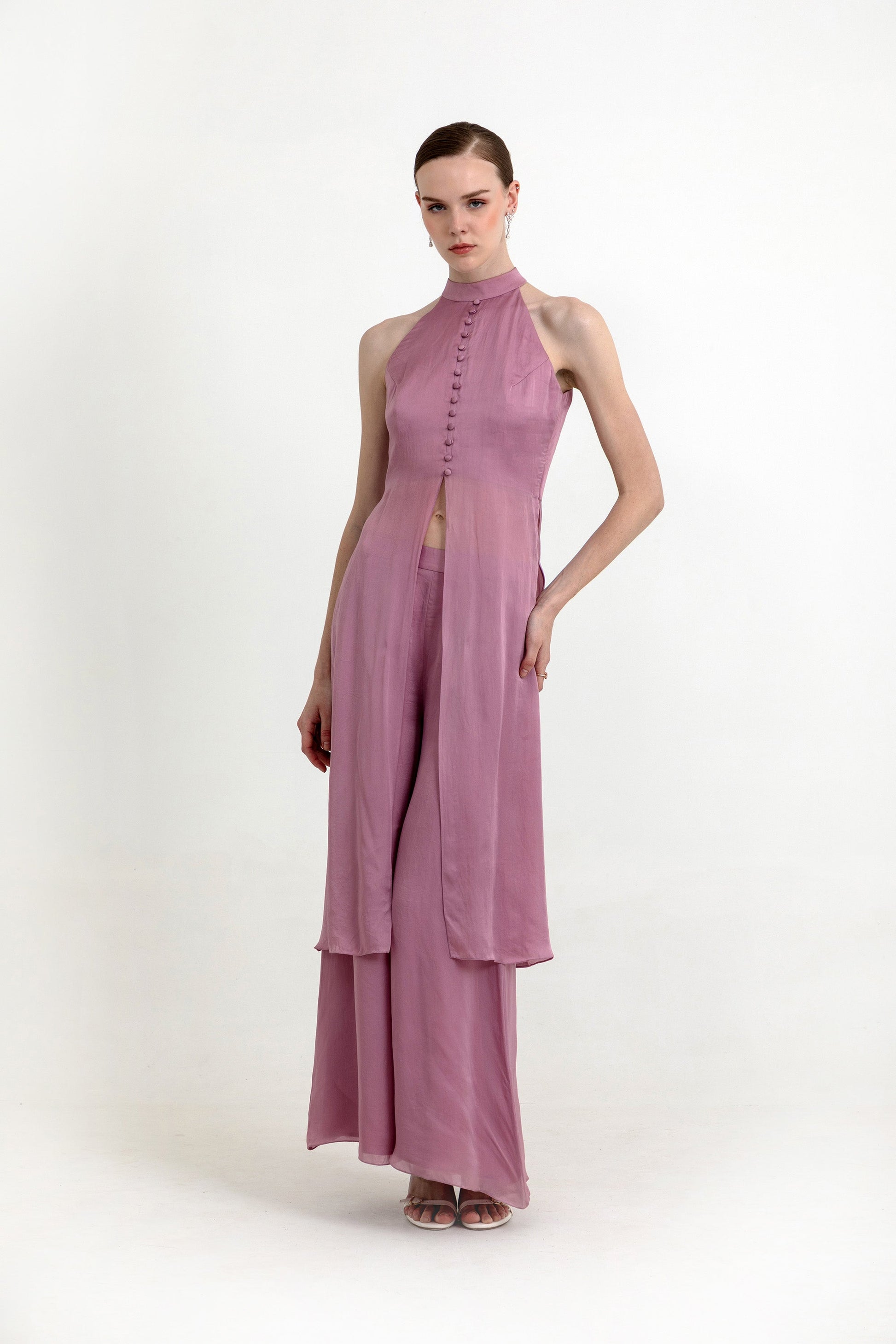 This tailored Evelyn co-ord set is a masterclass in balance—pairing a high-neck, button-front tunic with flared trouse for a look that is both sculptural and fluid. The sheer overlay adds a layer of sophistication, making it a standout choice for fashion-forward formal gatherings.