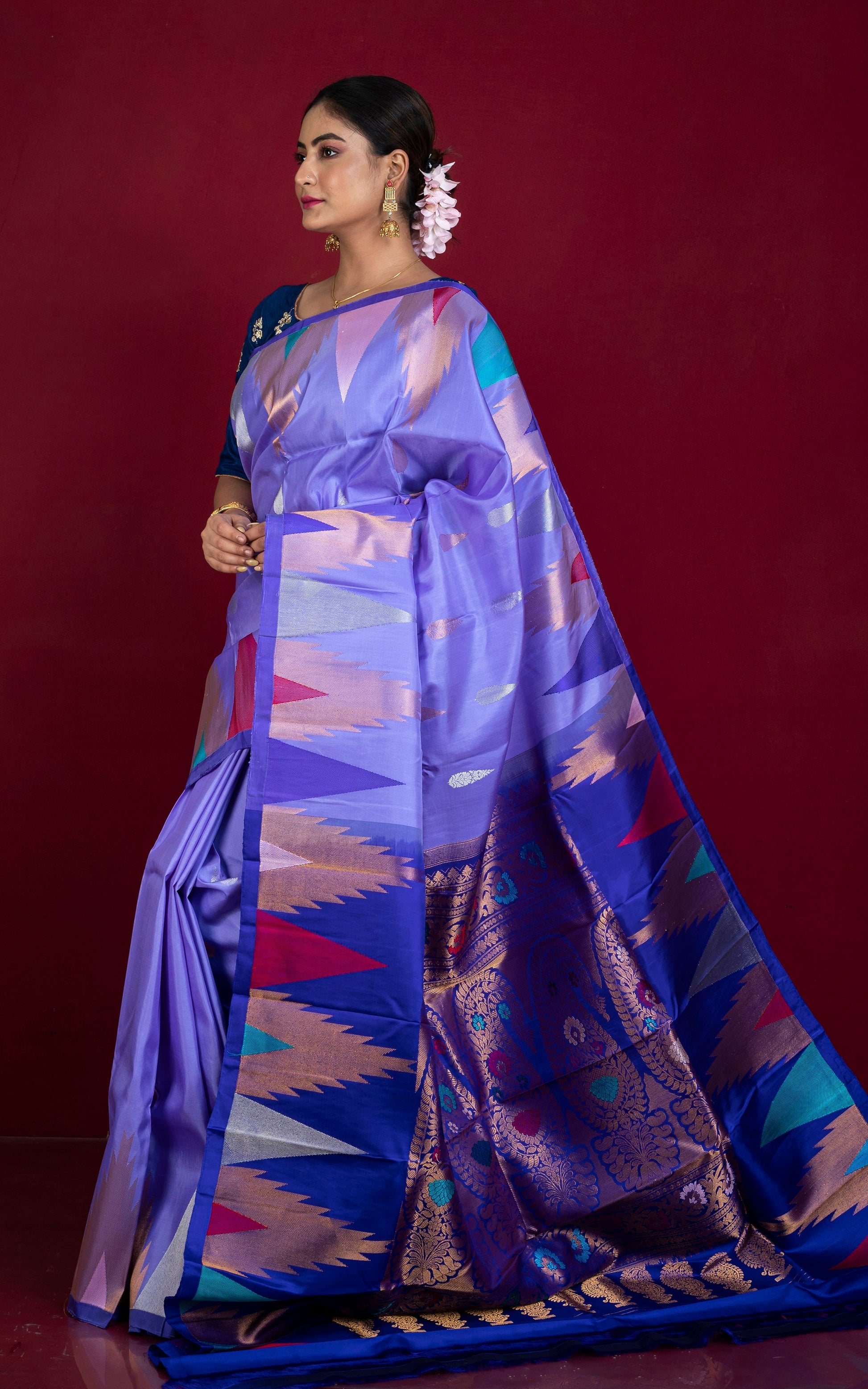 Introducing the Exclusive Mahapar Crowned Temple Border Gadwal Silk Saree in Medium Purple, Royal Blue, Golden and Multicolored Weave. Elevate your wardrobe with this luxurious and one-of-a-kind saree, featuring a stunning temple border design and a blend of rich colors. Make a statement wherever you go with this elegant piece.