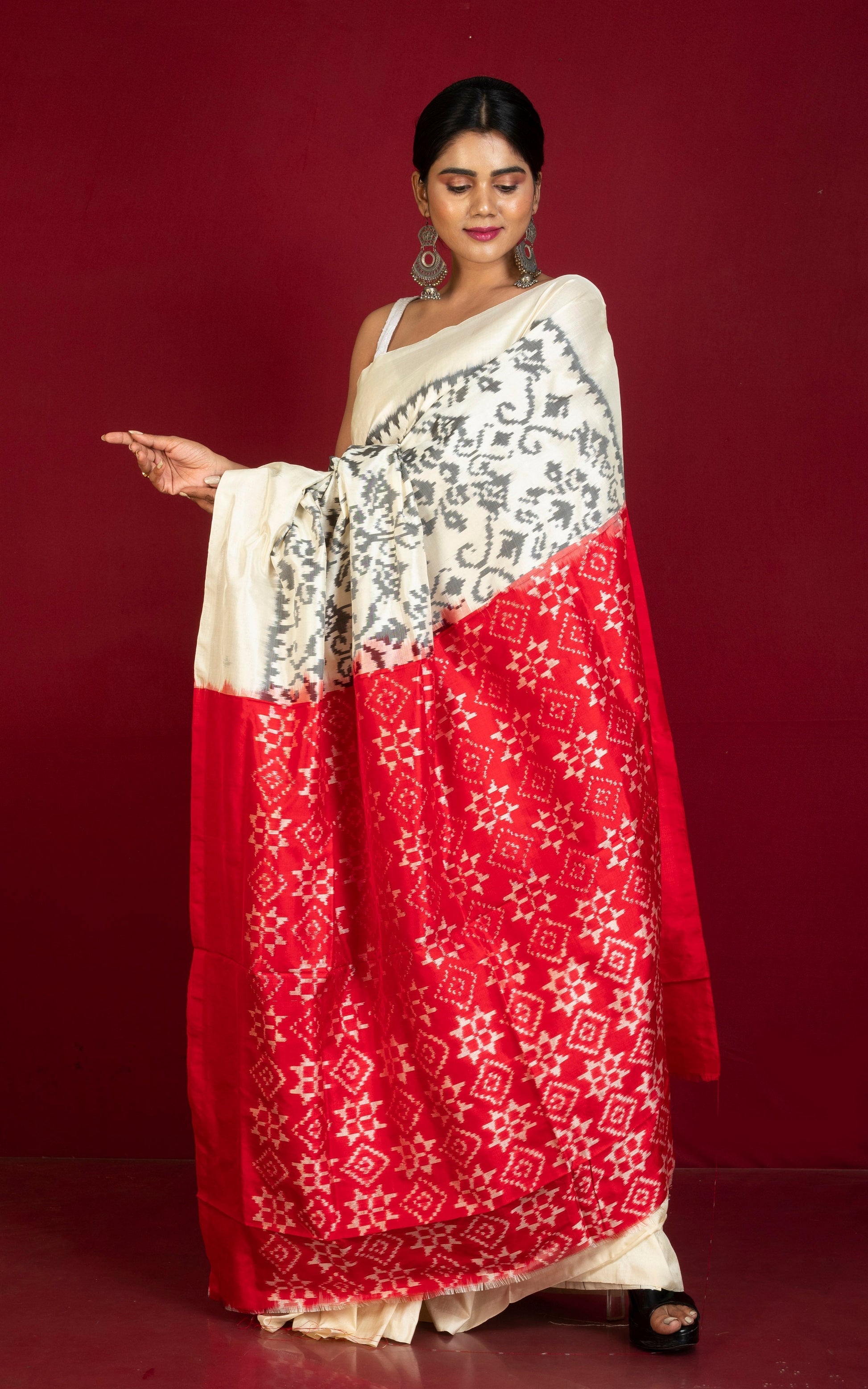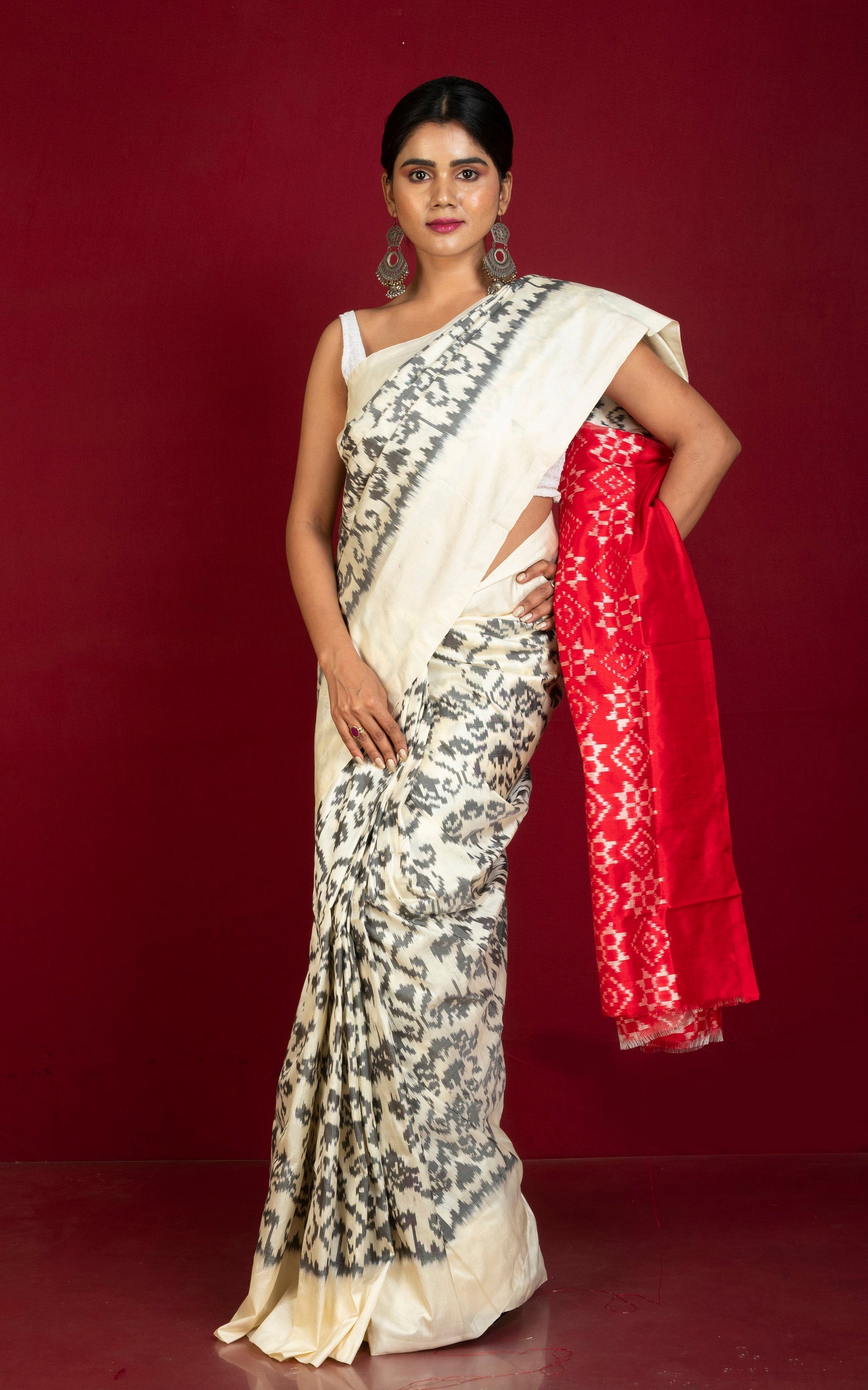 Exclusive Twill Ikkat Pochampally Silk Saree with contrast Pallu and Blouse Piece in Off White, Black and Bright Red
