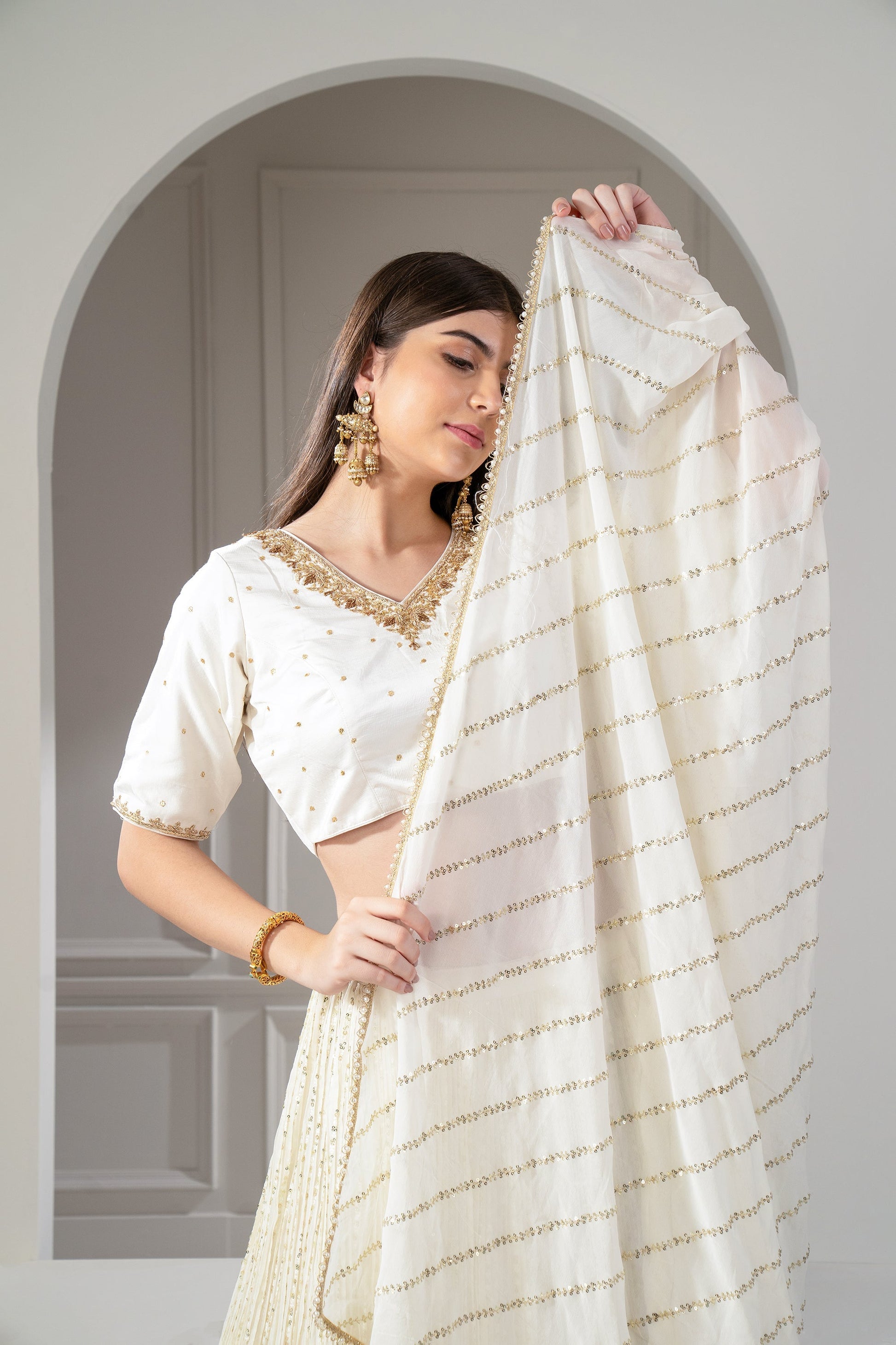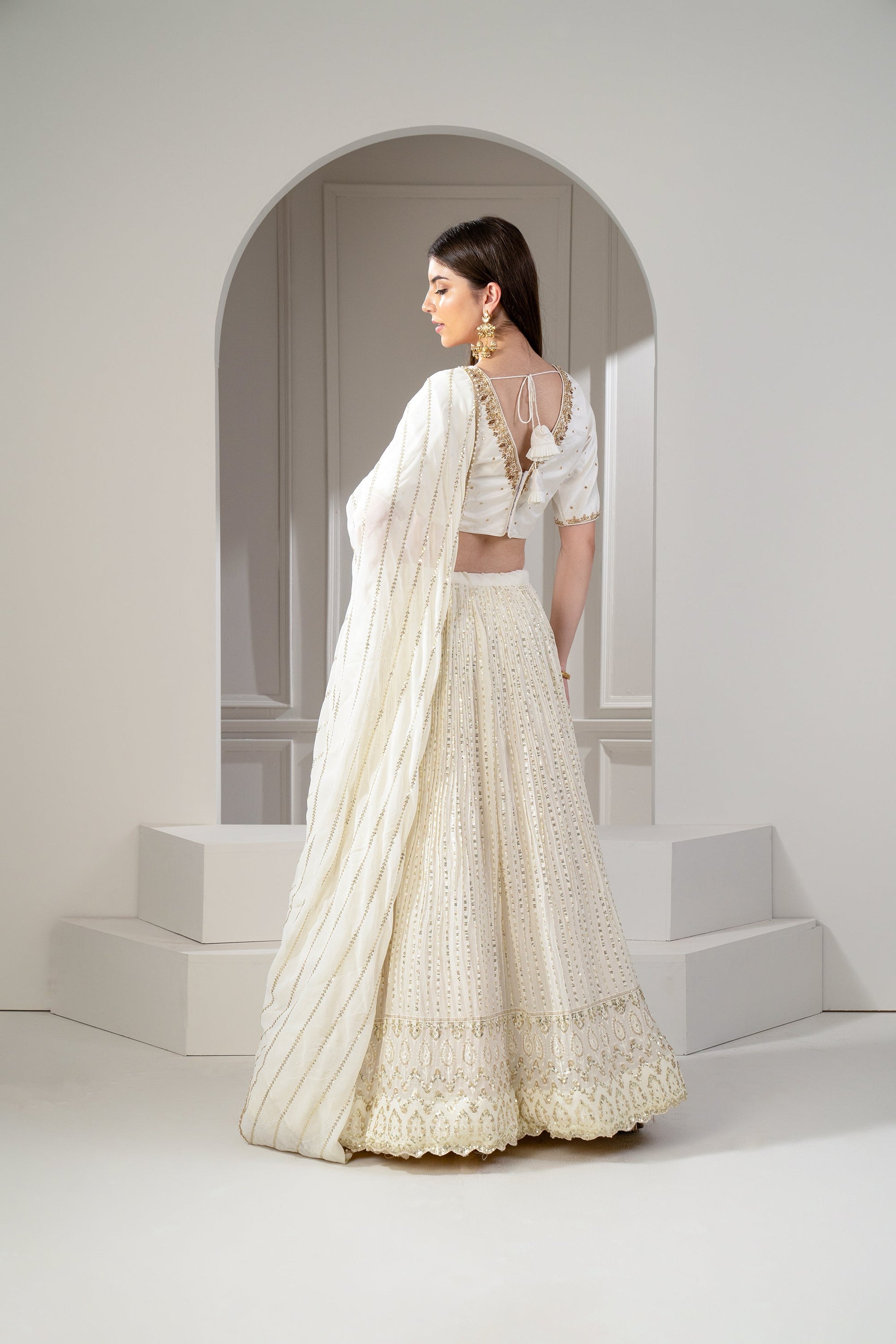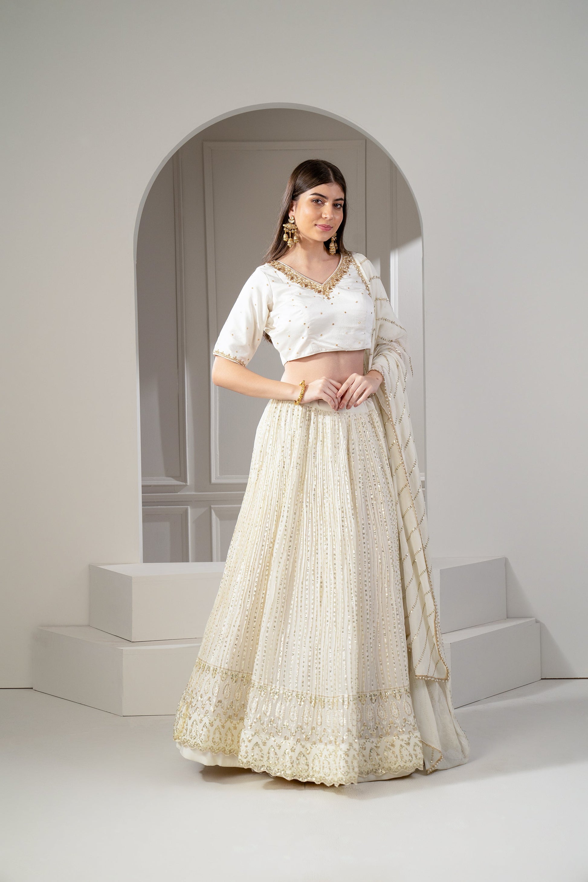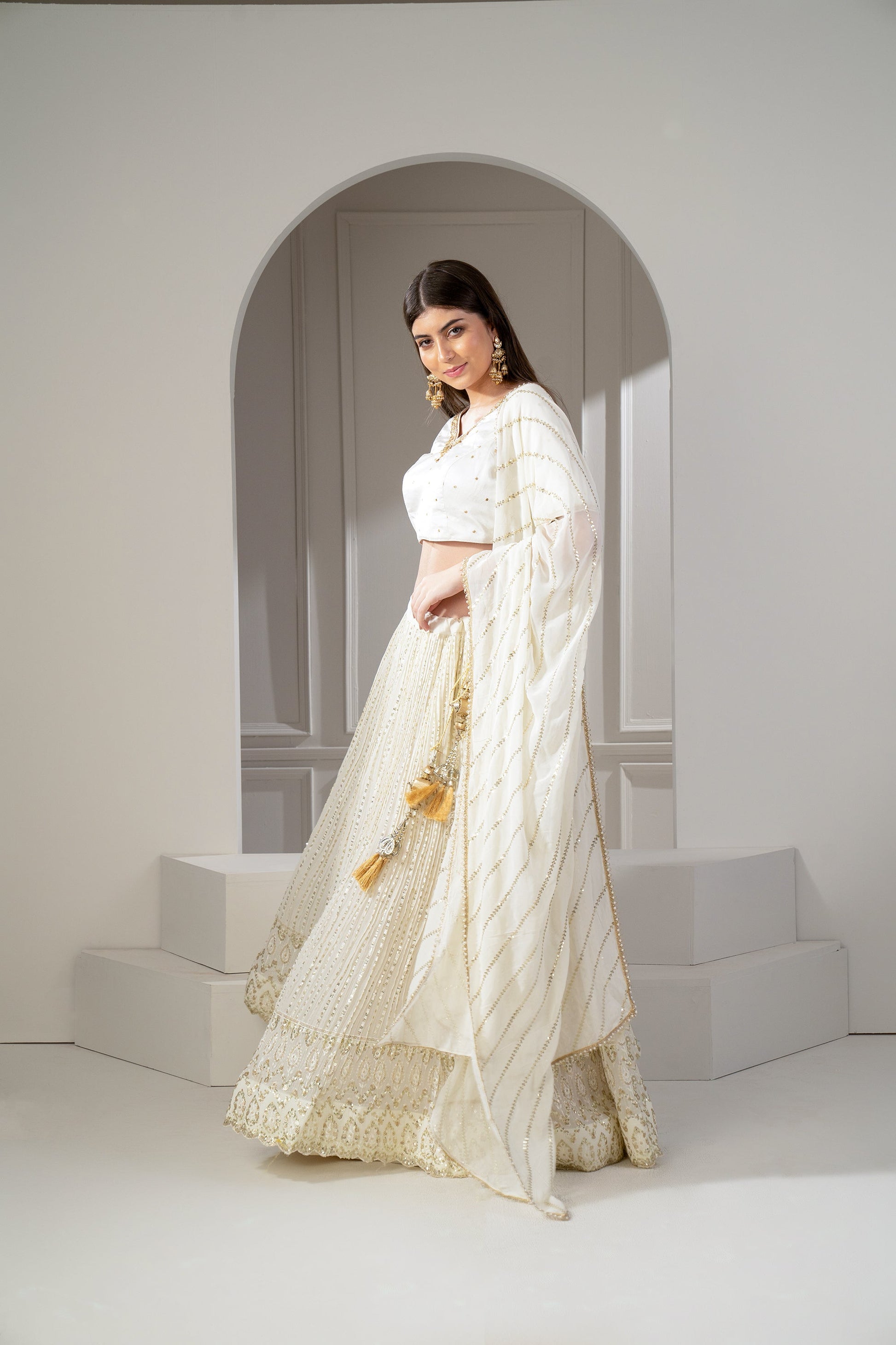 Fairy white georgette lehenga with sequins work and heavy latkan. 2) Topped with a matching dupatta with sequins work and pearl lace border. 3) Paired with a matching padded choli with glitter polka print and zari embroidered neck.