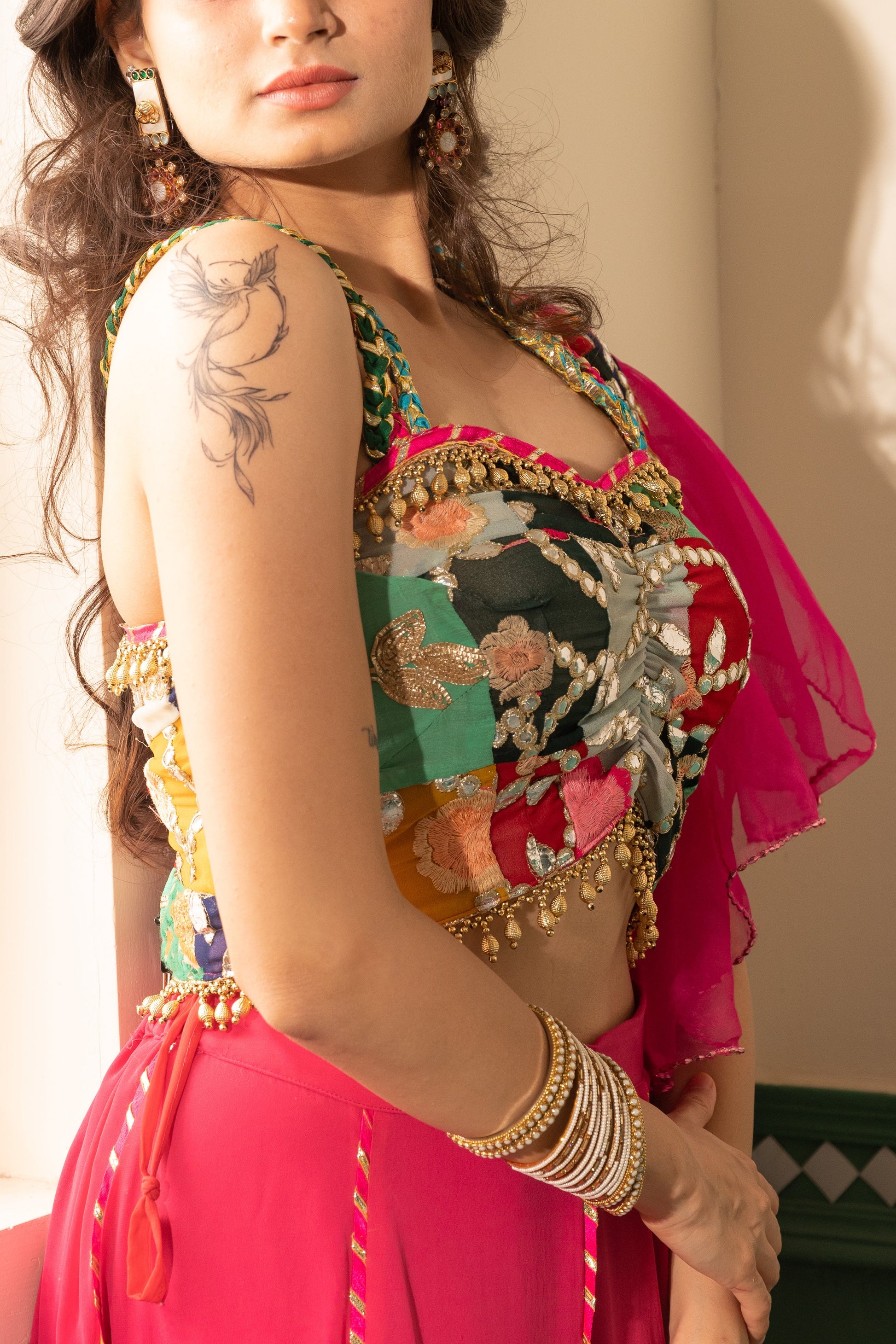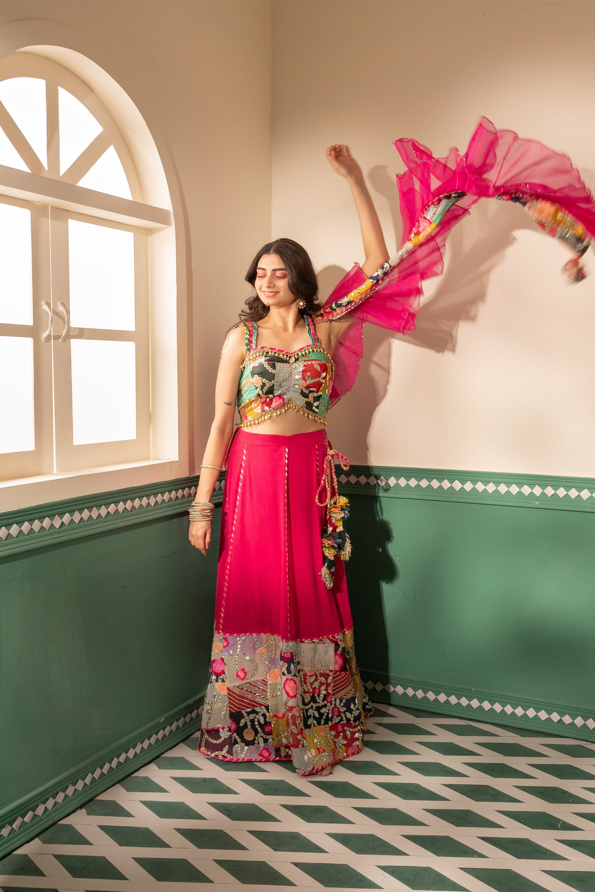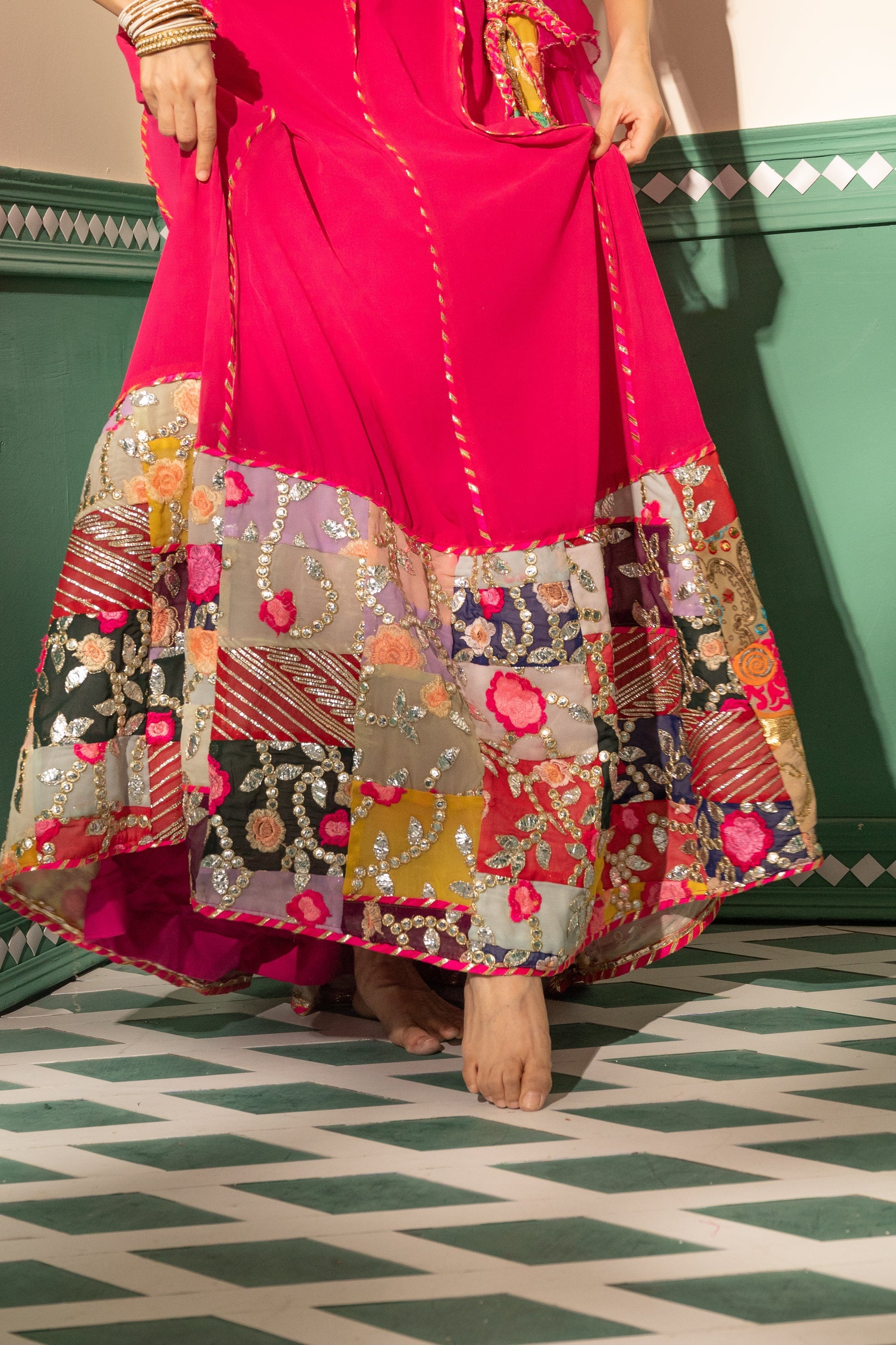 Indulge in the vibrant allure of our "Fuchsia Finesse Silk Ensemble." This playful set boasts a fuchsia pink patchwork skirt with a silk-based kali adorned with statement cushion tassels and intricate gotta work. The flattering sweetheart neck blouse is cinched at the center front, featuring delicate shoulder straps, silver gotta embroidery, and pearl hangings at the waist for added charm. Completing the look is a narrow organza dupatta in the same captivating hue, highlighted by a neck/shoulder border and elegant piping, ensuring you stand out with finesse.