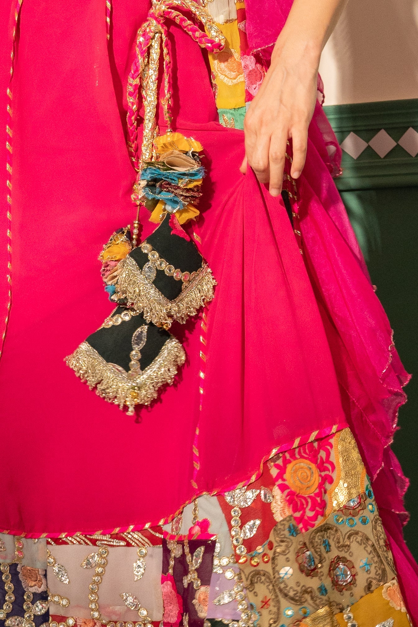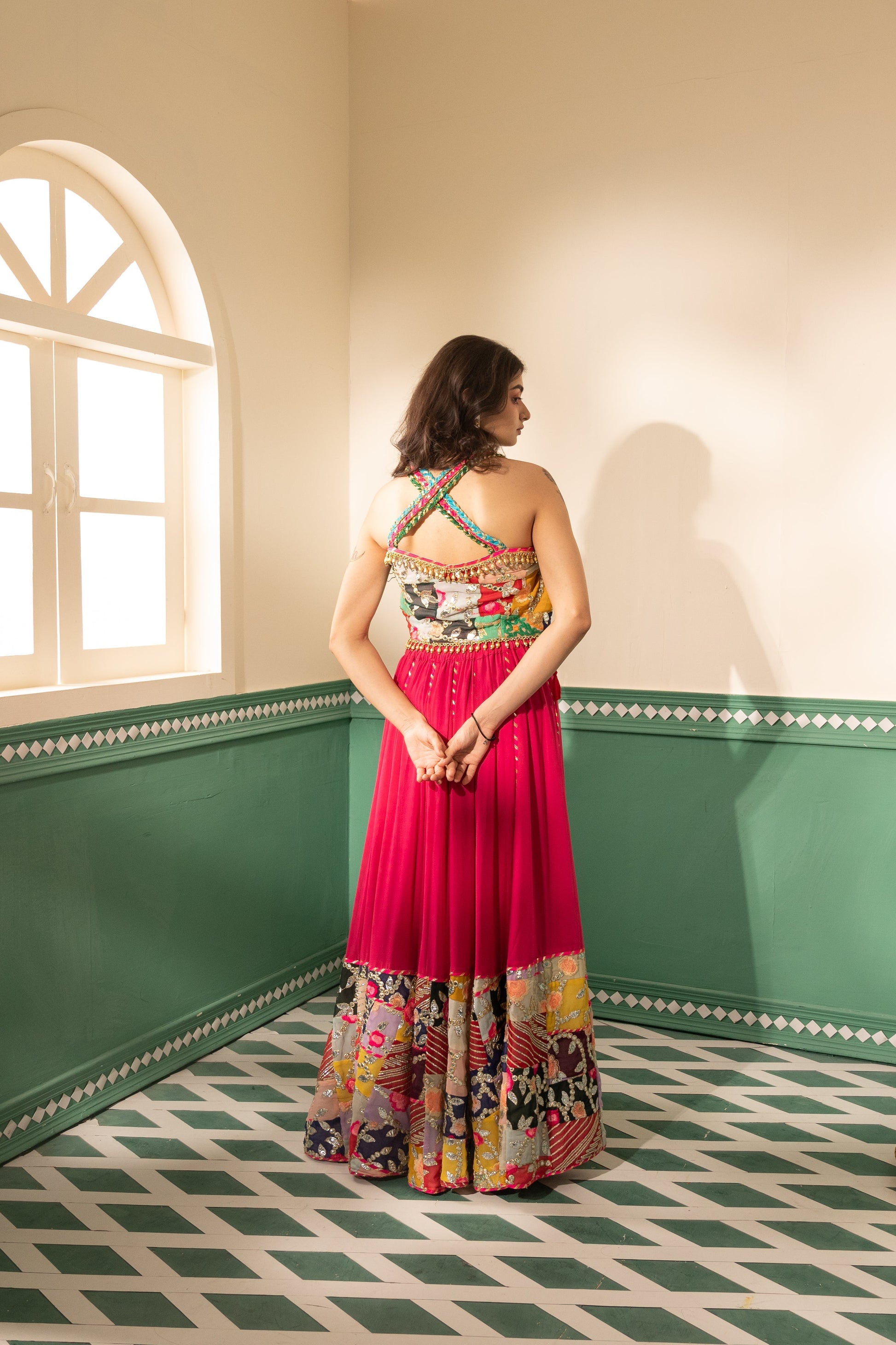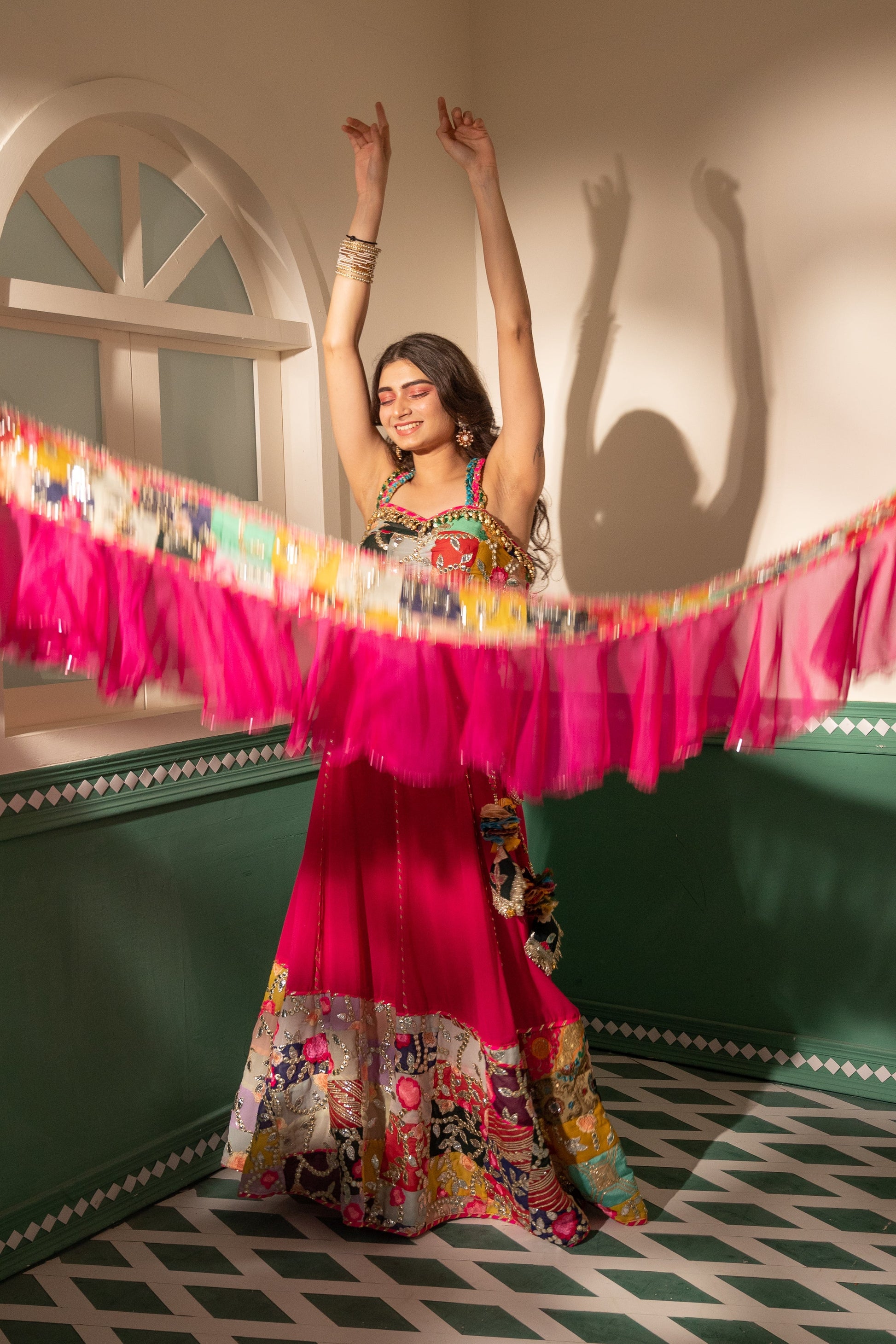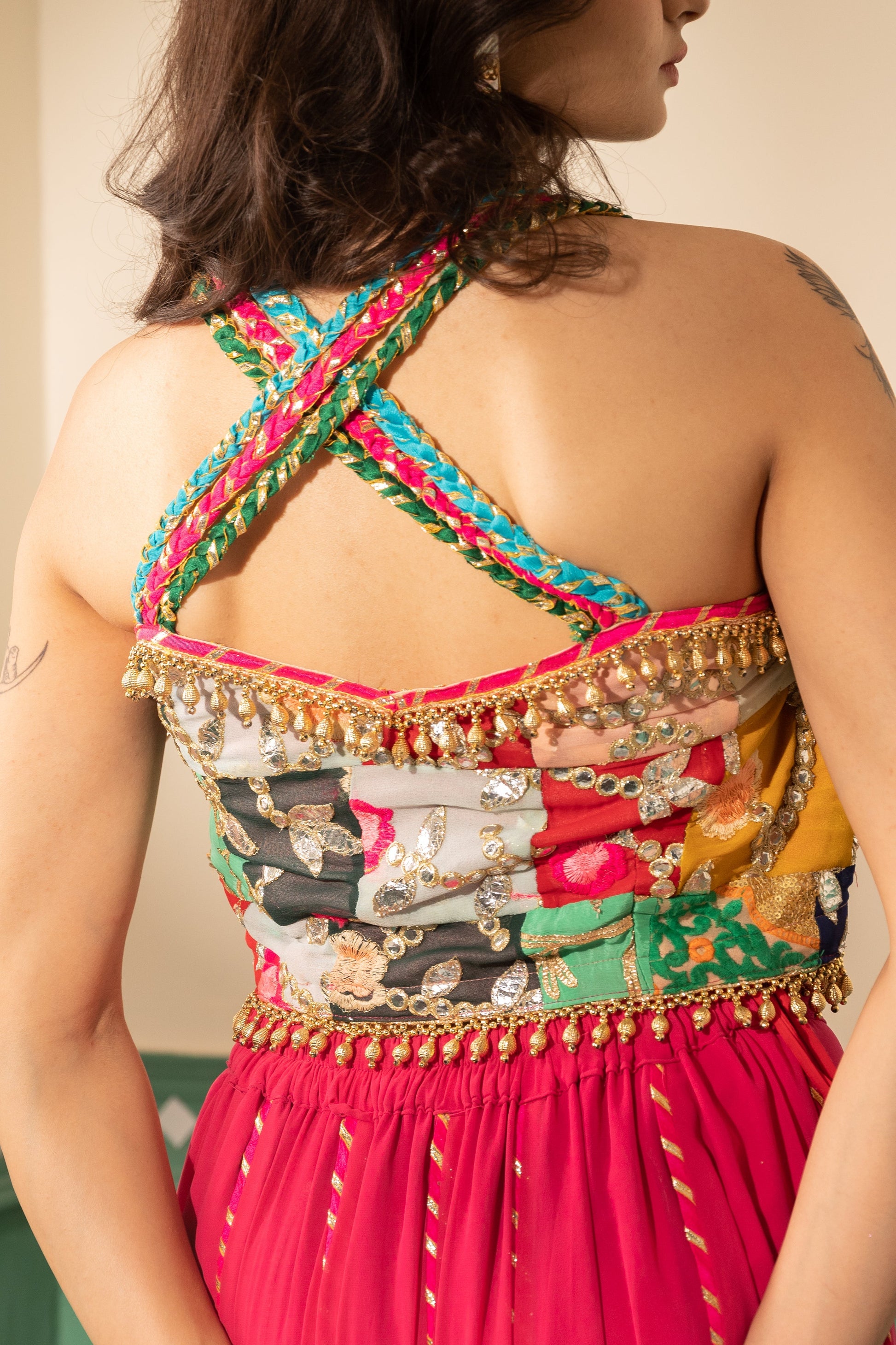 Indulge in the vibrant allure of our "Fuchsia Finesse Silk Ensemble." This playful set boasts a fuchsia pink patchwork skirt with a silk-based kali adorned with statement cushion tassels and intricate gotta work. The flattering sweetheart neck blouse is cinched at the center front, featuring delicate shoulder straps, silver gotta embroidery, and pearl hangings at the waist for added charm. Completing the look is a narrow organza dupatta in the same captivating hue, highlighted by a neck/shoulder border and elegant piping, ensuring you stand out with finesse.