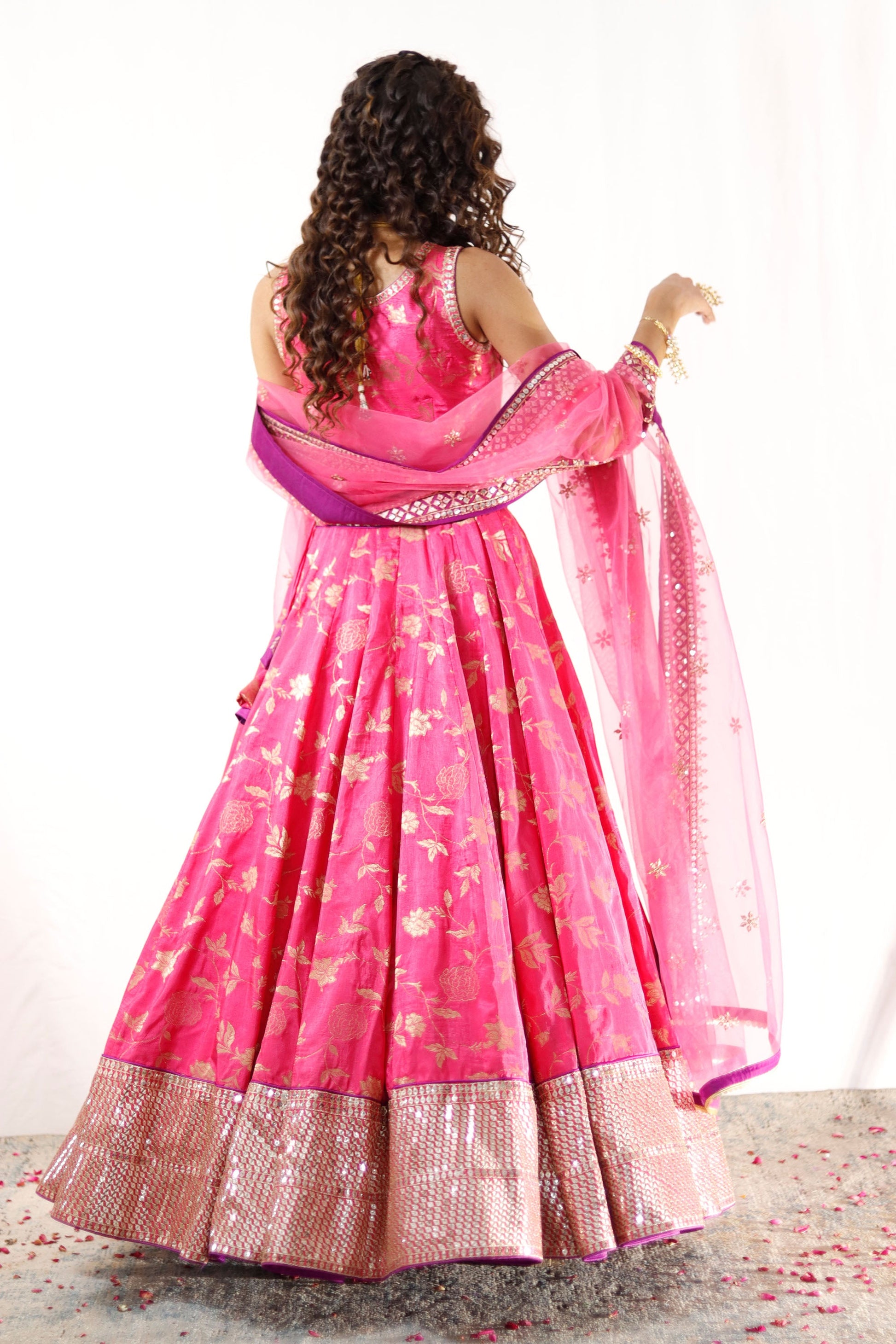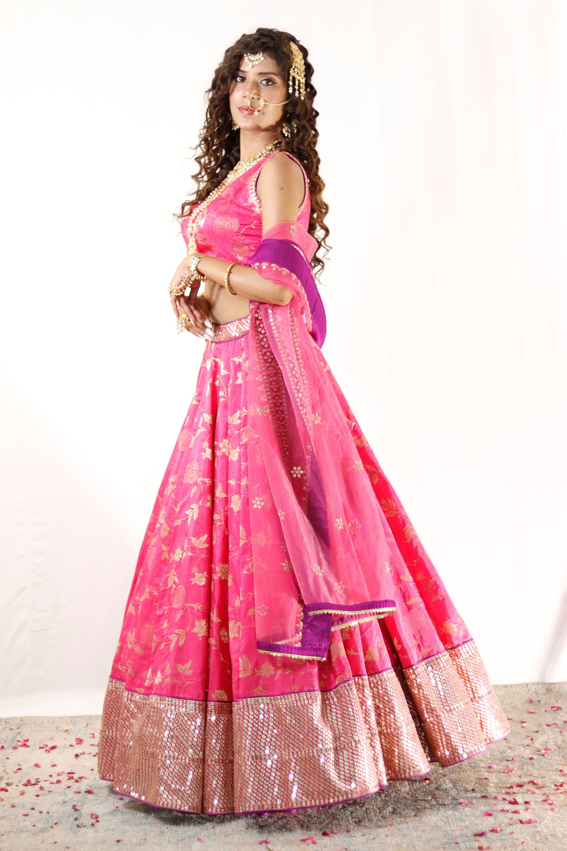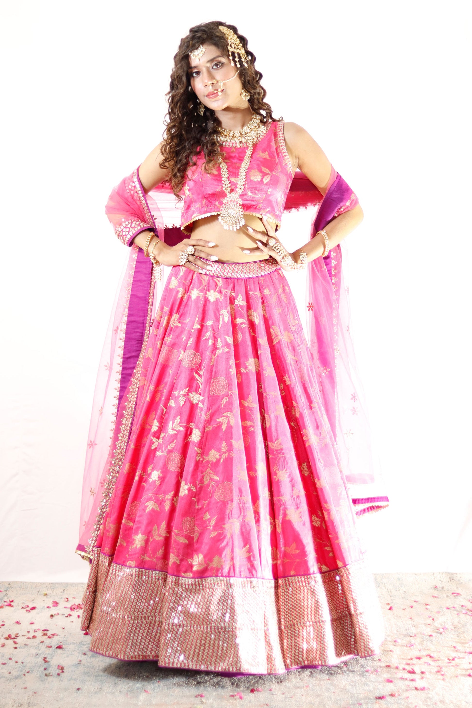 Fuchsia pink gold lehenga, intricate embroidery on silk brocade, paired with wide boat neckline blouse & net embellished dupatta.