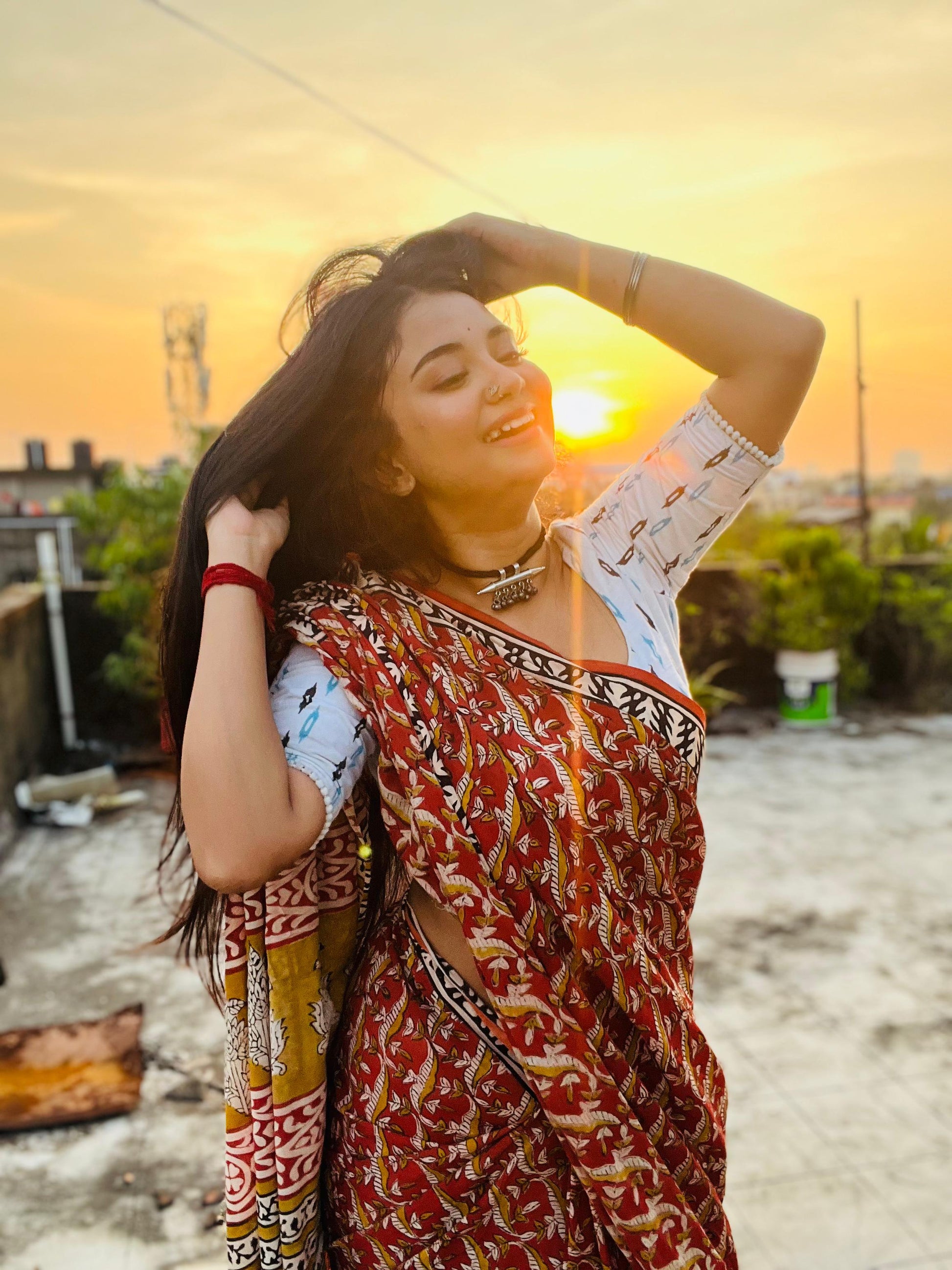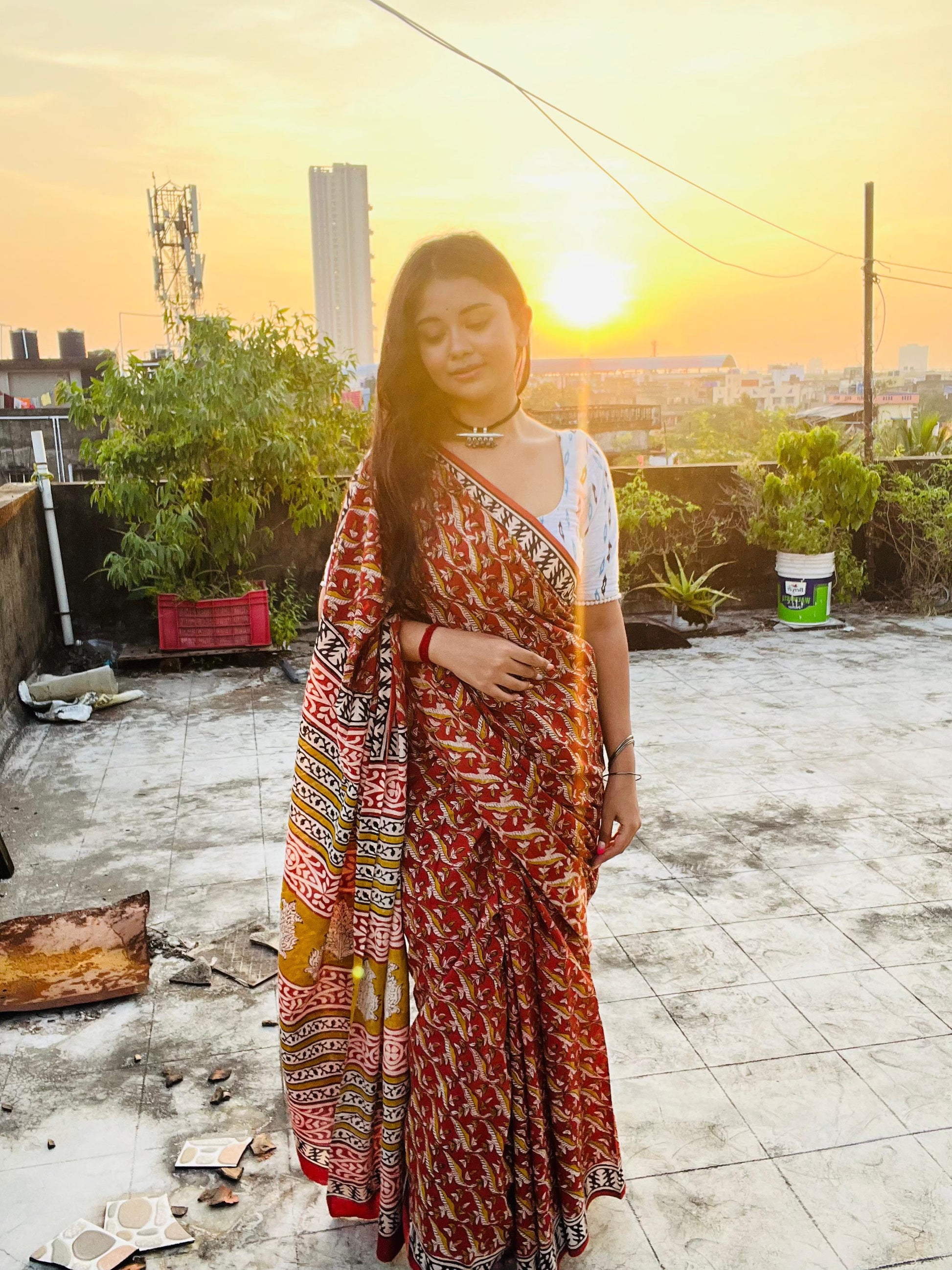 Gaurbandh- Red Bagru Natural Dyes Handblock Printed - Cotton Mulmul Saree