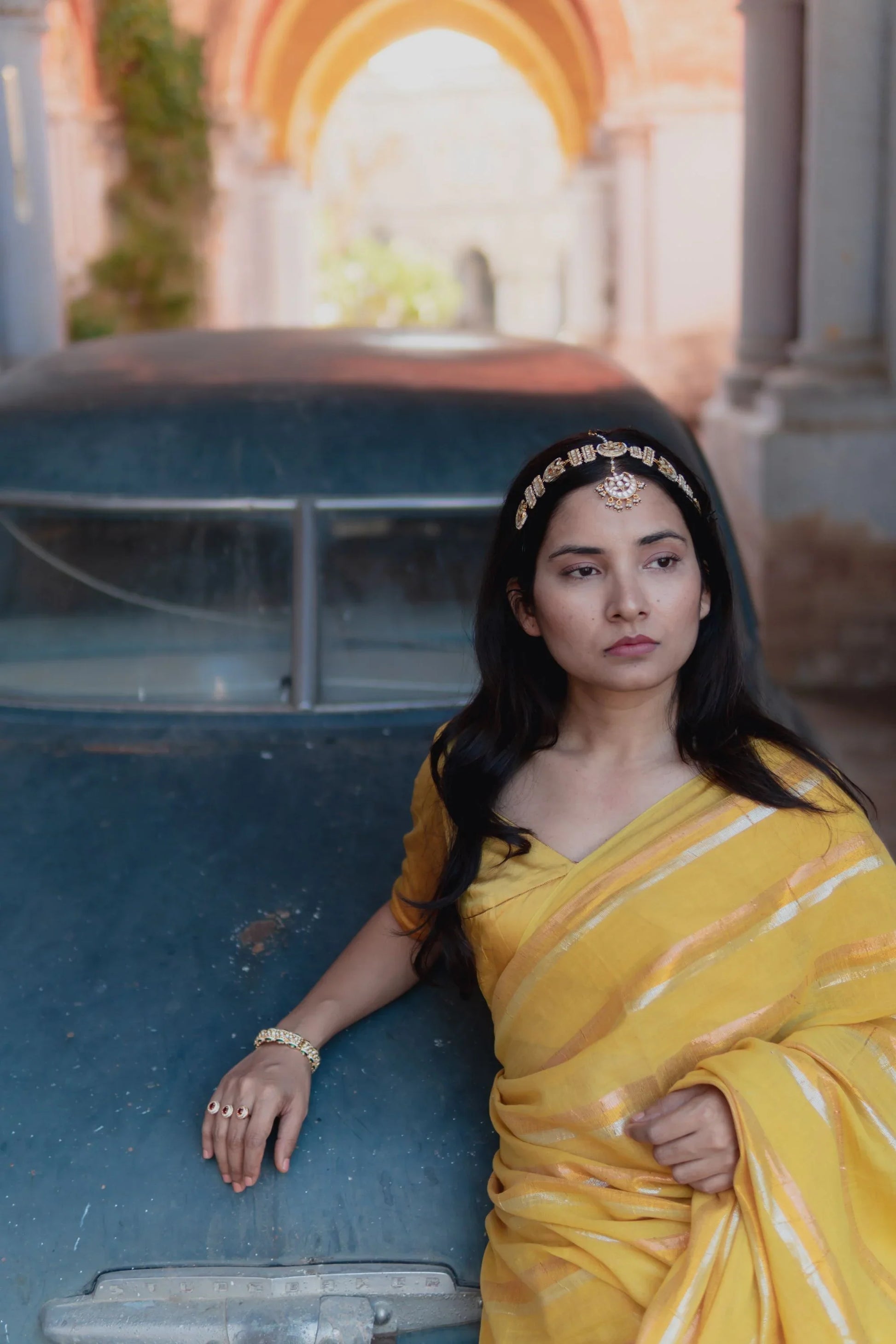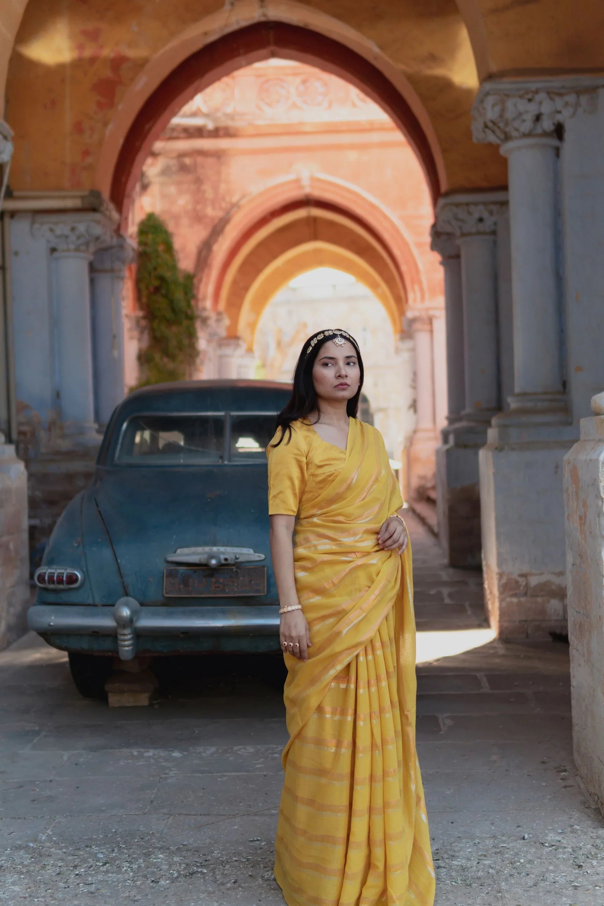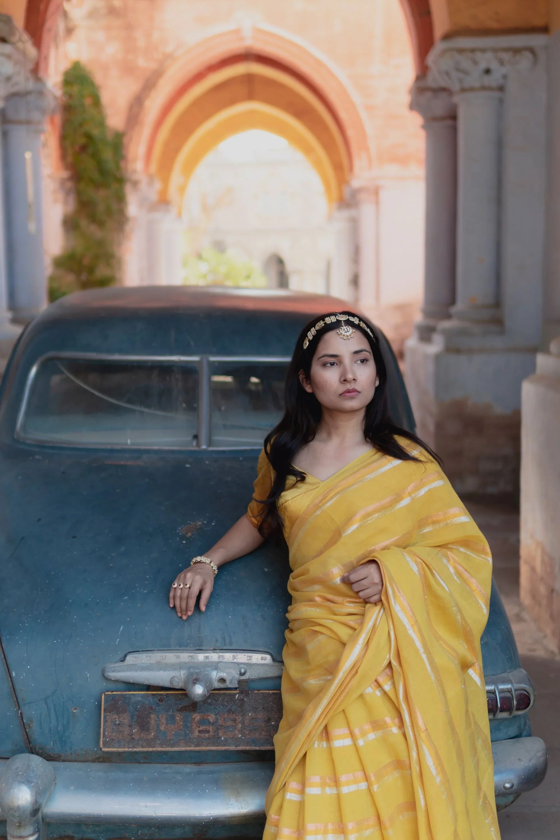 This saree is in cotton mulmul fabric with silver and gold lurex stripes. Saree has sea blue color tassels at the pallu to enhance the look. Saree fabric is soft and flowy. Its very easy to drape, perfect for any occasion.