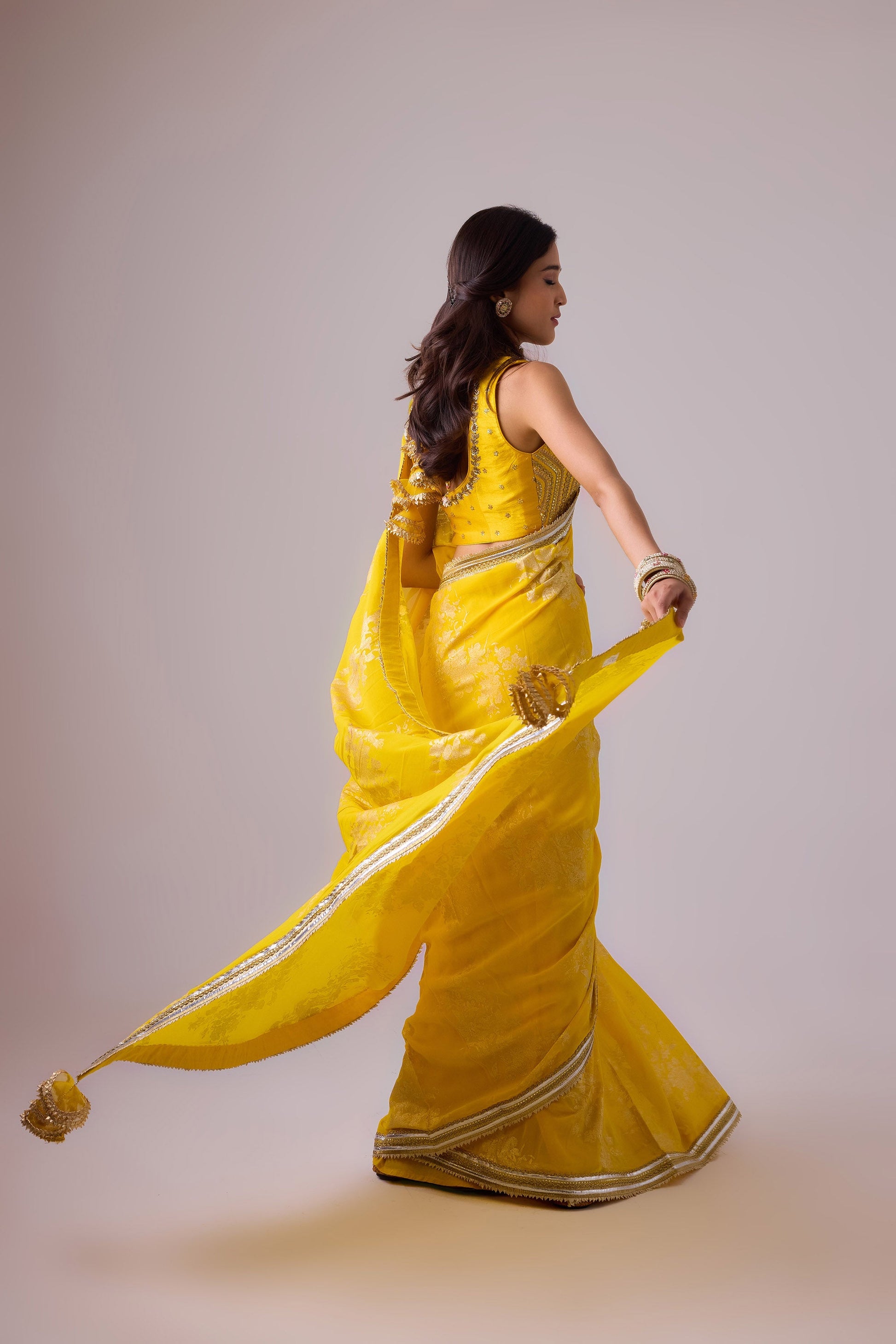 Haldi Phool georgette badal sitara gold foil printed saree with heavy hand embroidery and gota work pure raw silk blouse and handmade latkans.