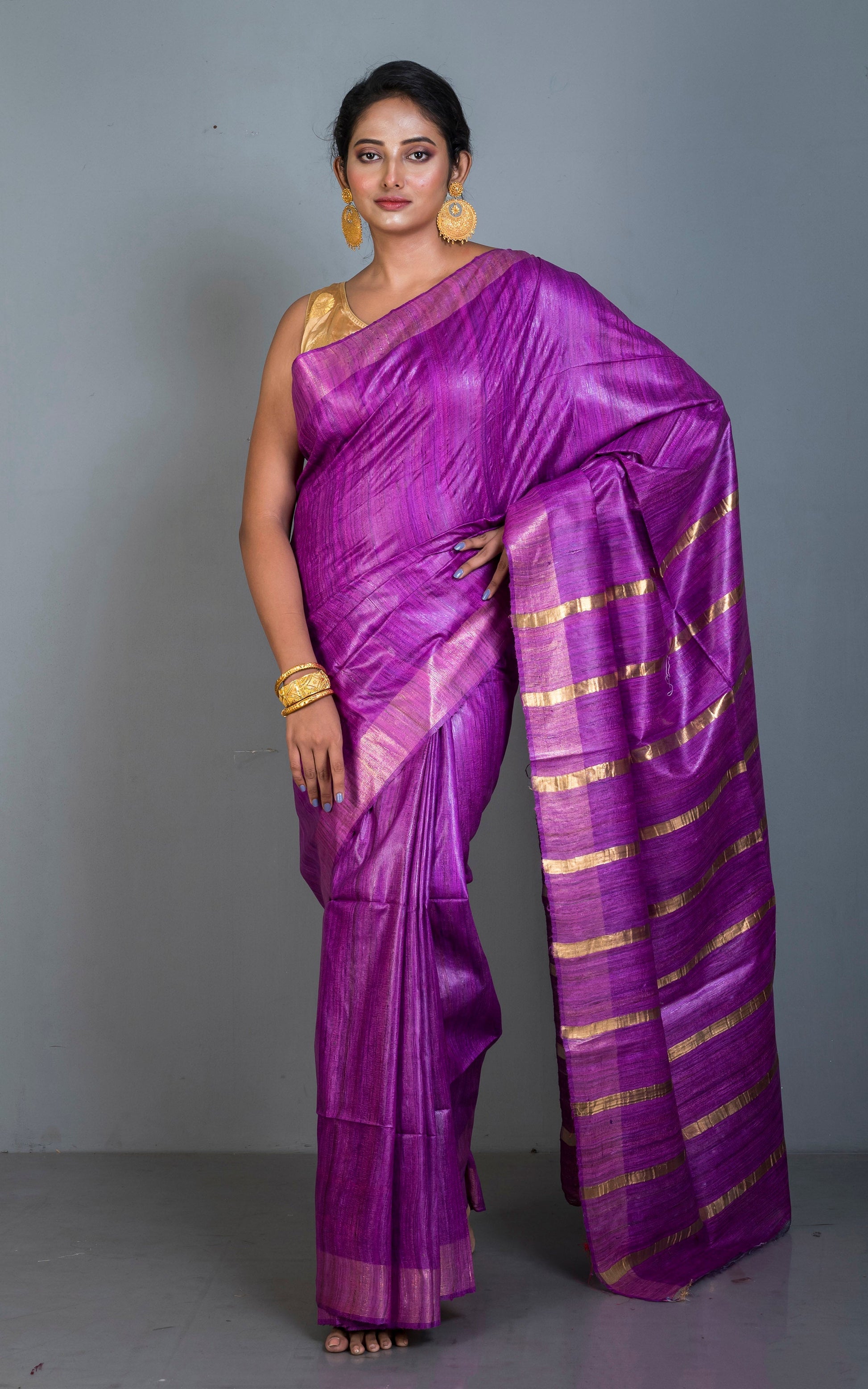 Gicha Tussar Silk Saree with Woven Gold Bands Pallu in Purple and Golden