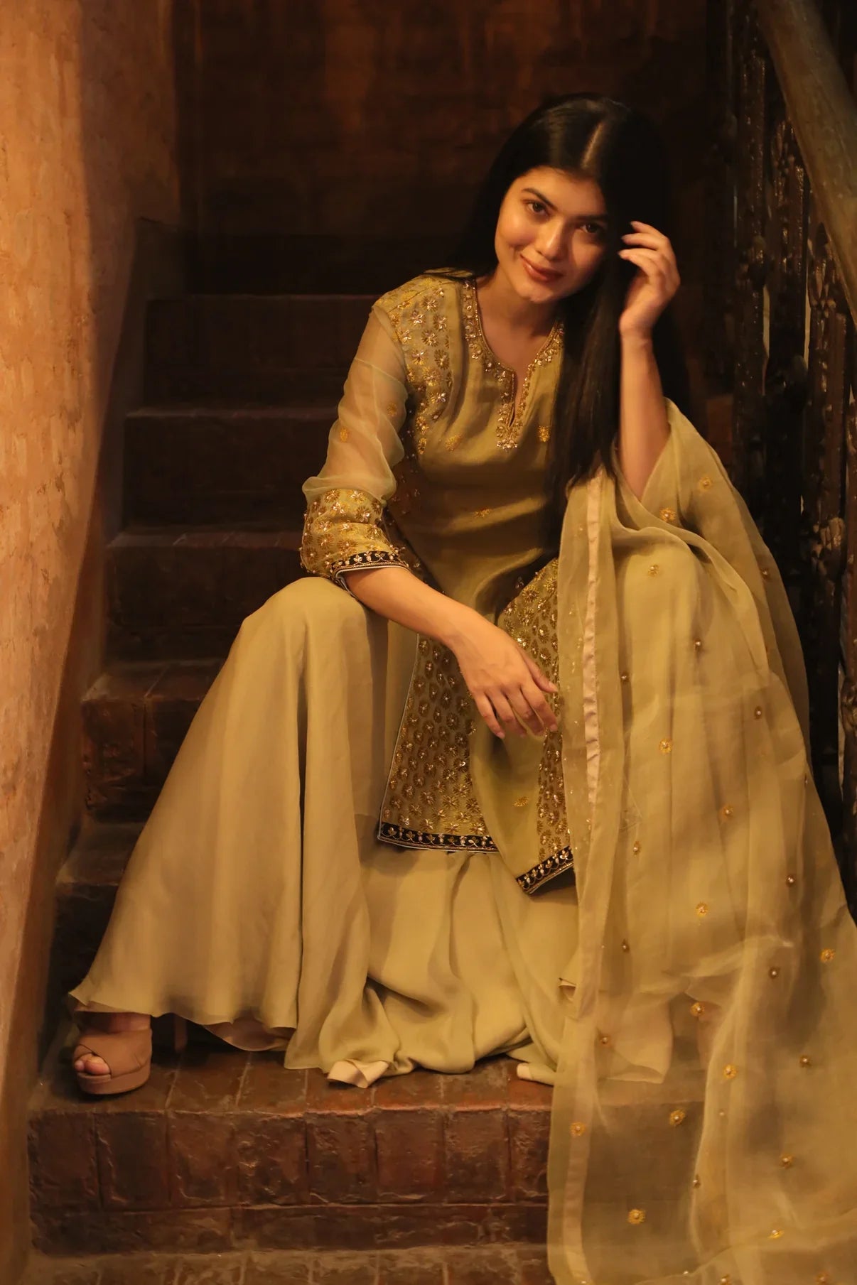 "Our mushroom gold Assam silk Kurta Sharara Set is just perfect for this wedding season. Its heavy embroidered sequin and gold pearl work all over the Kurta and zardozi work on sheer sleeves are a real treat for sore eyes. This Kurta is paired with tone-ontone flared pure Georgette Sharara and Dupatta. Customization is available in all Lehengas and Anarkalis. *Since product is handwoven, motifs and colour may vary slightly from original image."