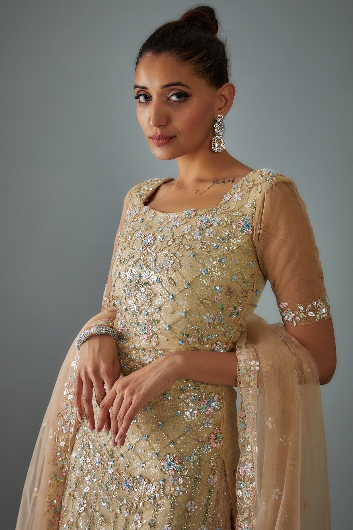 Featuring A Gold Kurta In Net Base With Hand And Machine Embroidery And A Can-Can. It Is Paired With Matching Sharara Pants And A Dupatta.