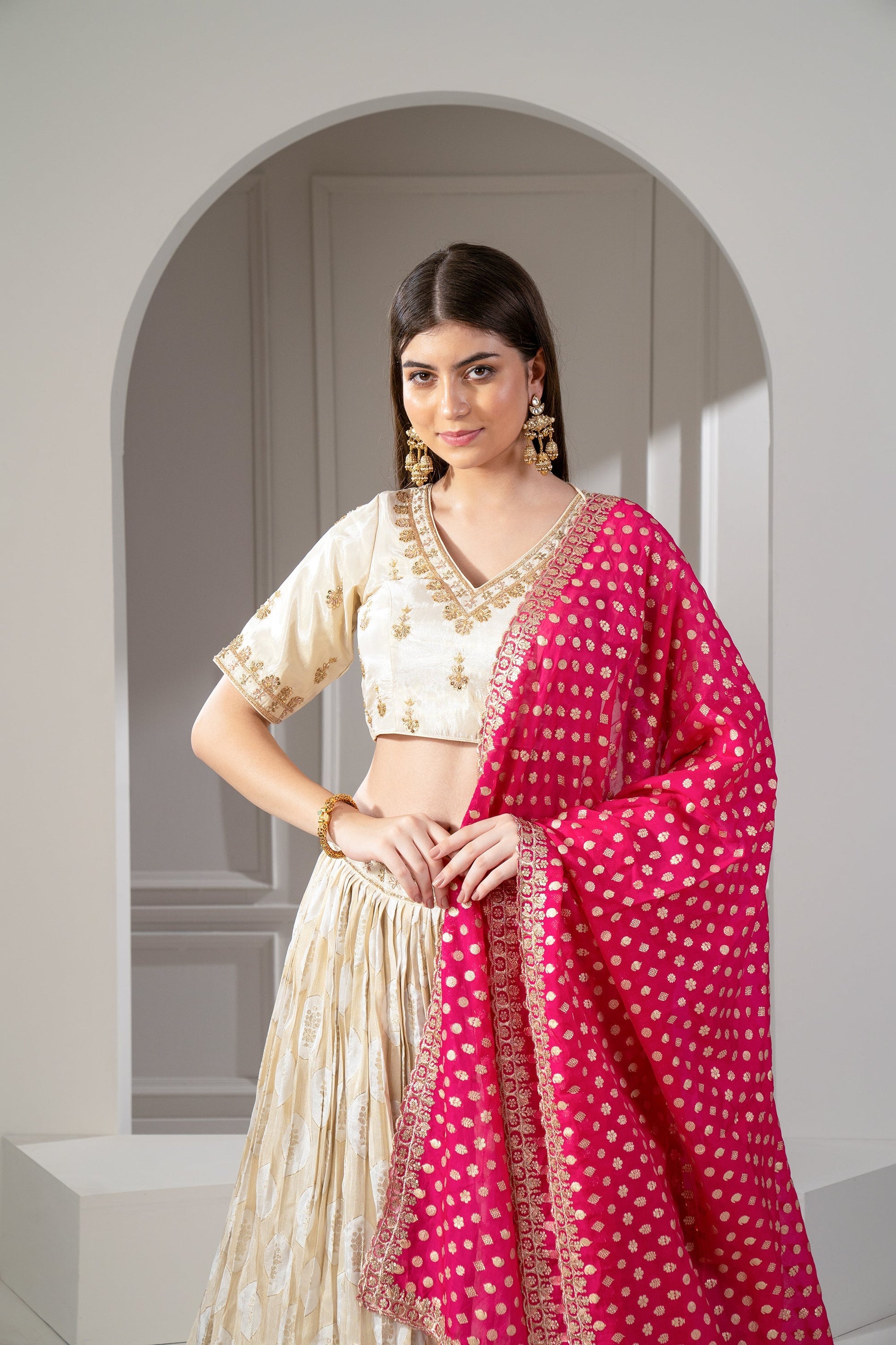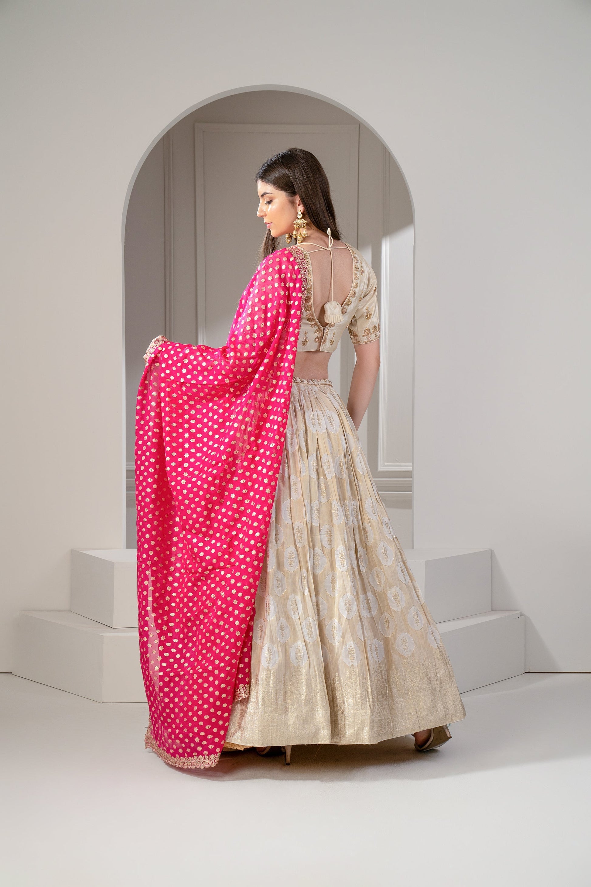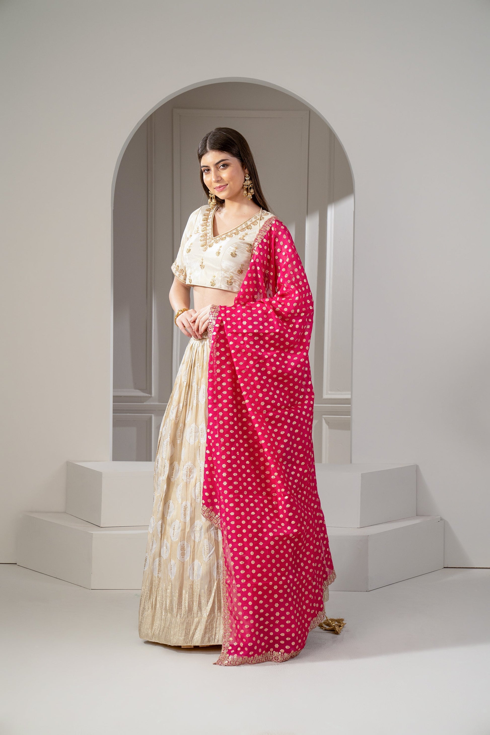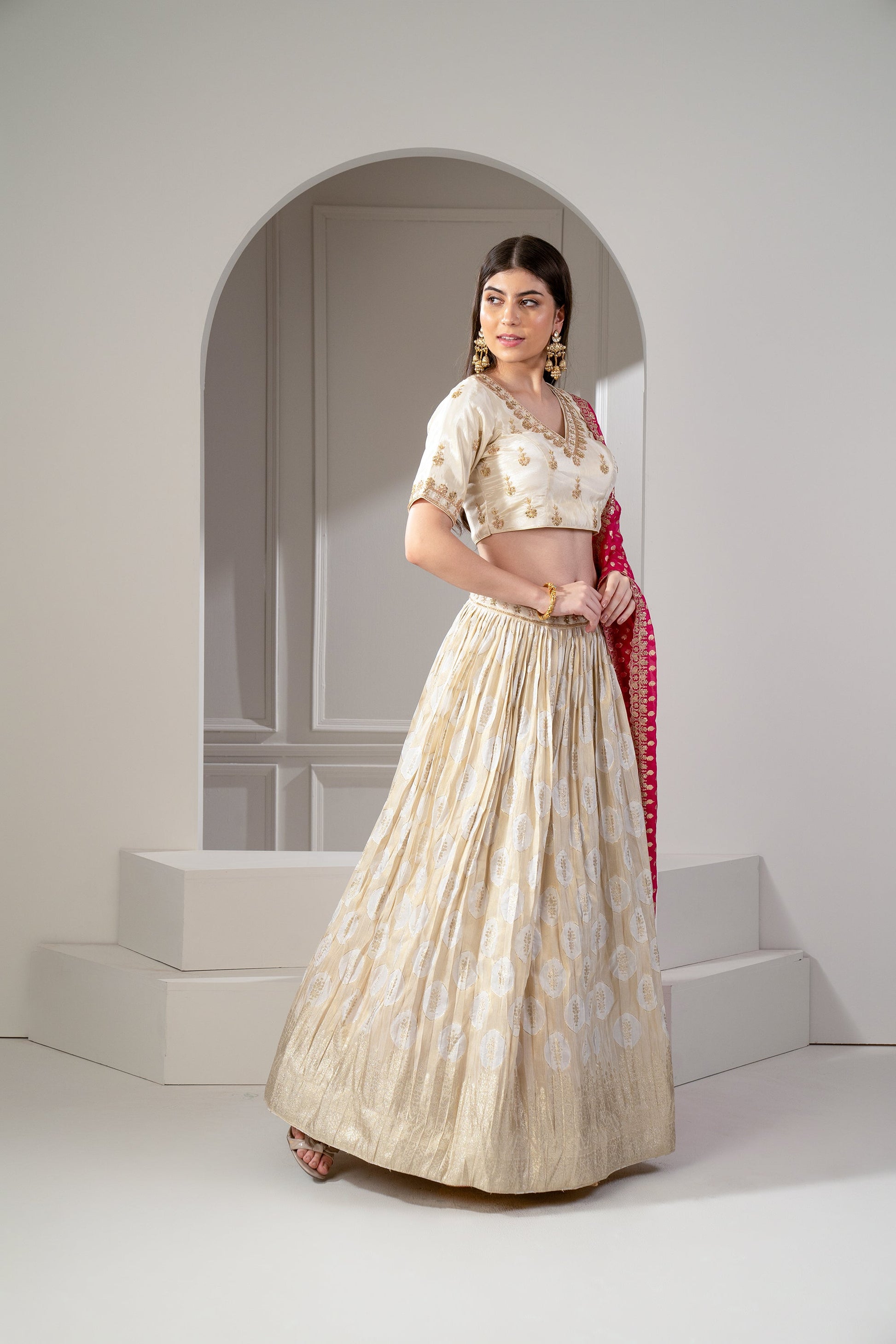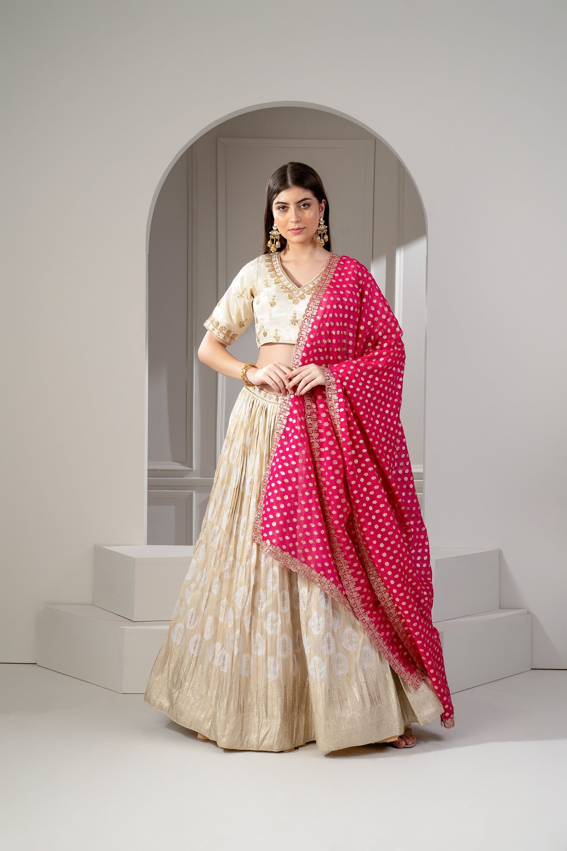 Golden Beige Banarasi silk lehenga with zari embroider on waistline.. 2) Topped with rani pink silk dupatta. 3) Paired with a matching padded choli with zari embroidery.