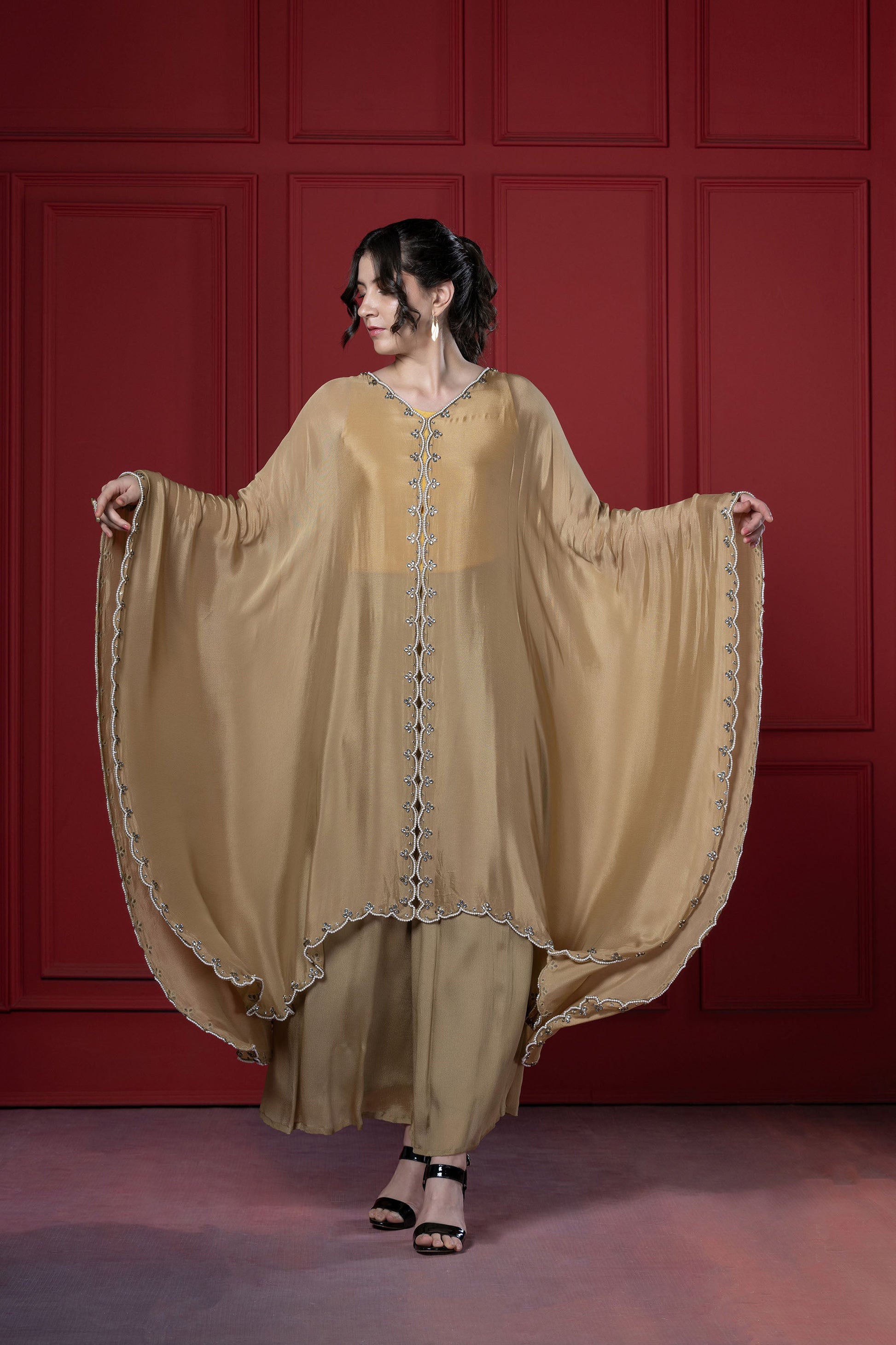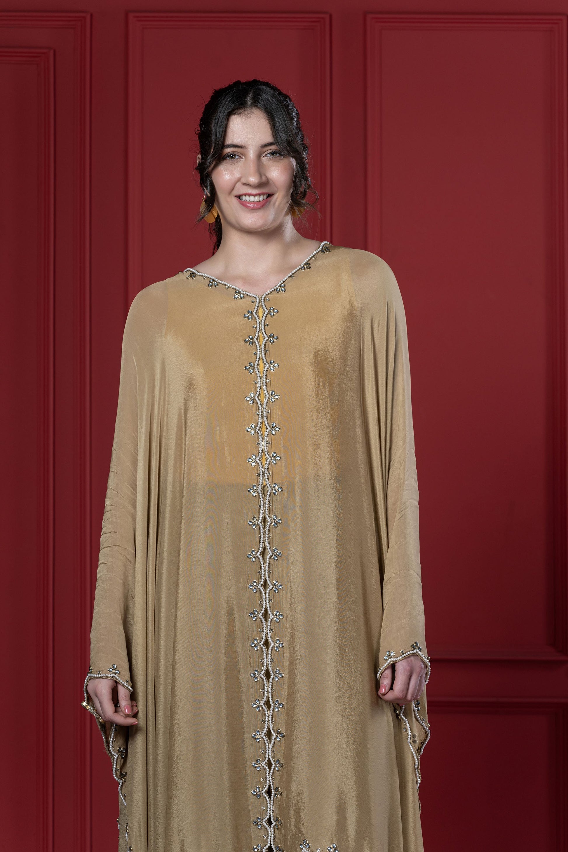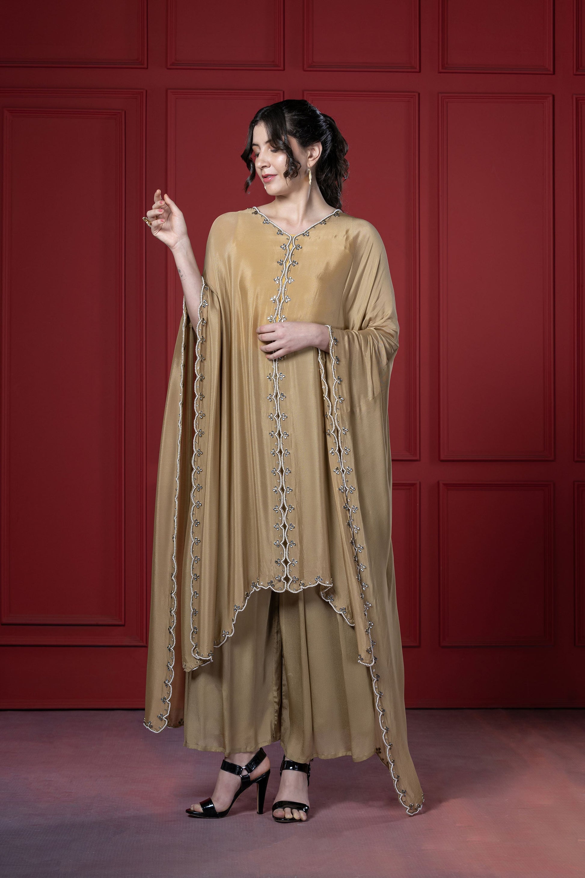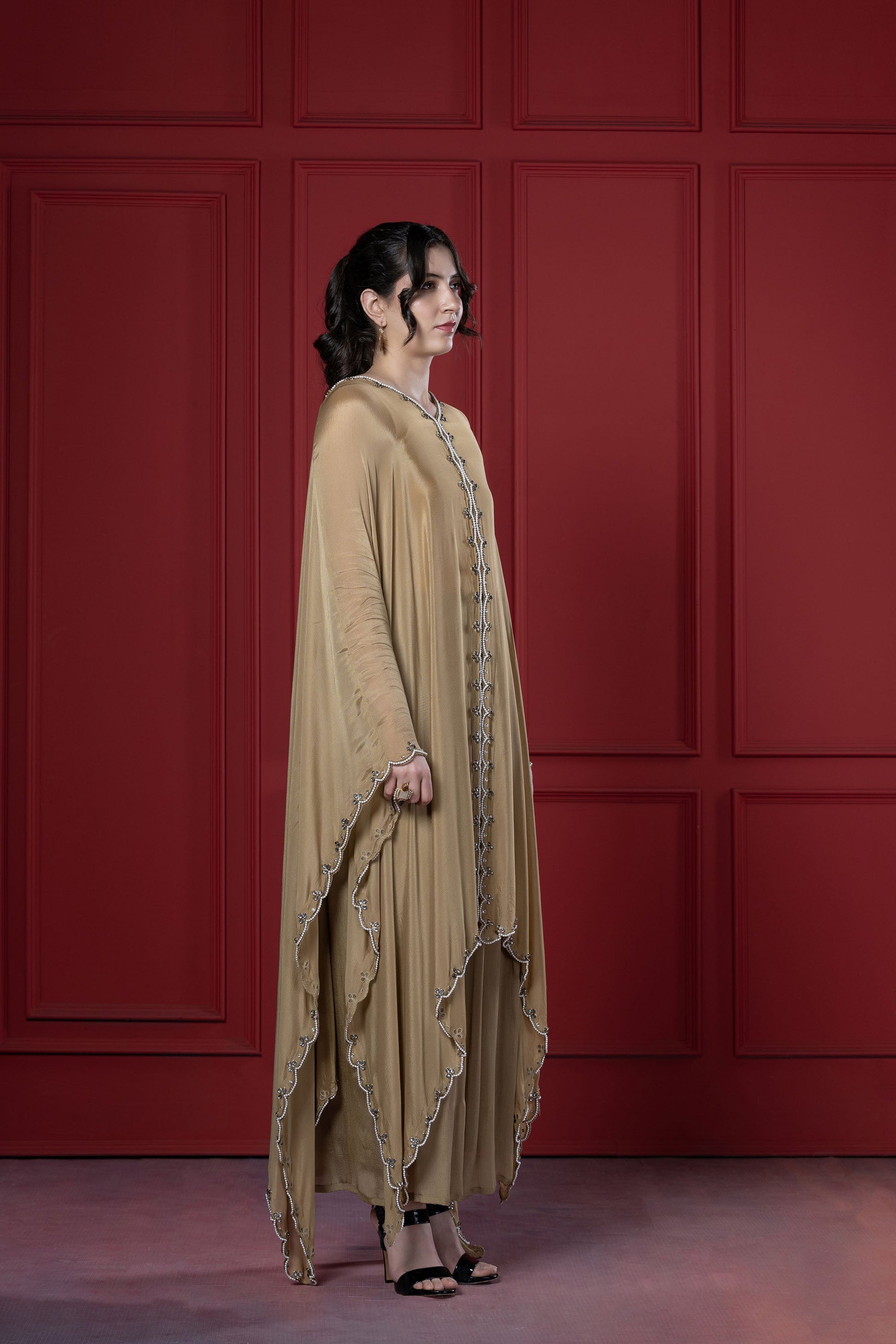 The outfit has a loose fit which makes it comfortable to wear. The generous cut allows it to drape beautifully giving the wearer a regal appearance. This decoration features pearl & kundan detailing creating floral motifs.